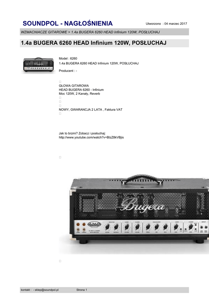 SOUNDPOL - NAGŁOŚNIENIA Utworzono : 04 marzec 2017 WZMACNIACZE GITAROWE > 1.4a BUGERA 6260 HEAD Infinium 120W, POSŁUCHAJ 1.4a BUGERA 6260 HEAD Infinium 120W, POSŁUCHAJ Model : 6260 1.4a BUGERA 6260 HEAD Infinium 120W, POSŁUCHAJ Producent : � GŁOWA GITAROWA HEAD BUGERA 6260 - Infinium Moc 120W, 2 Kanały, Reverb � � � NOWY, GWARANCJA 2 LATA , Faktura VAT � Jak to brzmi? Zobacz i posłuchaj: http://www.youtube.com/watch?v=BlzZ8kVBjis � � kontakt : - [email protected] Strona 1 SOUNDPOL - NAGŁOŚNIENIA Utworzono : 04 marzec 2017 WZMACNIACZE GITAROWE > 1.4a BUGERA 6260 HEAD Infinium 120W, POSŁUCHAJ 1.4a BUGERA 6260 HEAD Infinium 120W, POSŁUCHAJ kontakt : - [email protected] Strona 2 SOUNDPOL - NAGŁOŚNIENIA Utworzono : 04 marzec 2017 WZMACNIACZE GITAROWE > 1.4a BUGERA 6260 HEAD Infinium 120W, POSŁUCHAJ 1.4a BUGERA 6260 HEAD Infinium 120W, POSŁUCHAJ � � kontakt : - [email protected] Strona 3 SOUNDPOL - NAGŁOŚNIENIA Utworzono : 04 marzec 2017 WZMACNIACZE GITAROWE > 1.4a BUGERA 6260 HEAD Infinium 120W, POSŁUCHAJ 1.4a BUGERA 6260 HEAD Infinium 120W, POSŁUCHAJ kontakt : - [email protected] Strona 4 SOUNDPOL - NAGŁOŚNIENIA Utworzono : 04 marzec 2017 WZMACNIACZE GITAROWE > 1.4a BUGERA 6260 HEAD Infinium 120W, POSŁUCHAJ 1.4a BUGERA 6260 HEAD Infinium 120W, POSŁUCHAJ kontakt : - [email protected] Strona 5 SOUNDPOL - NAGŁOŚNIENIA Utworzono : 04 marzec 2017 WZMACNIACZE GITAROWE > 1.4a BUGERA 6260 HEAD Infinium 120W, POSŁUCHAJ 1.4a BUGERA 6260 HEAD Infinium 120W, POSŁUCHAJ kontakt : - [email protected] Strona 6 SOUNDPOL - NAGŁOŚNIENIA Utworzono : 04 marzec 2017 WZMACNIACZE GITAROWE > 1.4a BUGERA 6260 HEAD Infinium 120W, POSŁUCHAJ 1.4a BUGERA 6260 HEAD Infinium 120W, POSŁUCHAJ � Nie stać Cię na Marshalla, Orange czy też Mesa? Teraz w super cenie odpowiednik brzmieniowy tych wzmacniaczy. Potężne brzmienie, niska cena. � Zastanów się czy warto ryzykować i kupować używany sprzęt? Tu masz 2 lata gwarancji, niezawodny serwis, nowe lampy na dzień dobry, zero problemów i zero ryzyka. � � � � BRZMIENIE ---> Wzmacniacz ma 2 kanały, a �w zasadzie 3, clean, crunch, lead. Uzyskasz brzmienia od "gruboziarnistego" typu Marshall, Orange, do gęstego typu Mesa, Peavey. Przesteru nie zabraknie nawet najbardziej �! Brzmienie jest bardzo selektywne , z dużą ilością harmonicznych i potężnym dołem. Piękny czysty kanał Clean, szklanka. Cała gama brzmień w jednym wzmacniaczu. � Polecamy też kolumny Bugera, świetnie brzmiące i w bardzo dobrych cenach! Moc: 120 Watt 2 kanały: Clean/Crunch, Lead Lampy: 5x 12AX7 (przedwzmacniacz), 4x 6L6 (końcowka mocy) Możliwość wymiany lamp 6L6 na EL34 3 punktowy equalizer wspólny dla obu kanałów Reverb Presence Impedancja 4, 8, 16 Ohm Footswitch w komplecie ------------------------------------------------� � � Jeśli masz dość siarowatego Marshalla, a nie stać Cię na kupno Mesy, warto zainwestować w ten piec. Gwarantujemy że jak usłyszysz jego potężne brzmienie, nie będziesz się chciał od niego oderwać na wiele tygodni:)) Piec po prostu zabija brzmieniem. Ma tyle przesteru że nie zabraknie nawet najbardziej wymagającym, a do tego jest bardzo selektywny. Można też spokojnie grać na nim rocka i bluesa. � Jeśli potrzebujesz mega uderzenia, tak �żeby nigdy nie zabrakło Ci mocy to warto zainwestować w ten wzmacniacz! � � � � kontakt : - [email protected] Strona 7 SOUNDPOL - NAGŁOŚNIENIA Utworzono : 04 marzec 2017 WZMACNIACZE GITAROWE > 1.4a BUGERA 6260 HEAD Infinium 120W, POSŁUCHAJ 1.4a BUGERA 6260 HEAD Infinium 120W, POSŁUCHAJ Cena : 1.799,00 zł Brutto ( 1.462,60 zł Netto) Dostępność: Produkt dostępny w naszym sklepie od 20 marzec 2012 kontakt : - [email protected] Strona 8