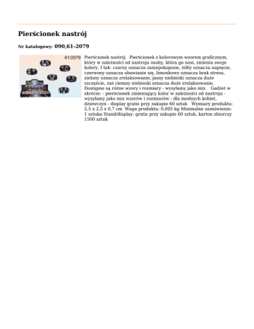 Pierścionek nastrój Nr katalogowy: 090,61-2079 Pierścionek nastrój Pierścionek z kolorowym wzorem graficznym, który w zależności od nastroju osoby, która go nosi, zmienia swoje kolory. I tak: czarny oznacza zaniepokojenie, żółty oznacza napięcie, czerwony oznacza obawianie się, limonkowy oznacza brak stresu, zielony oznacza zrelaksowanie, jasny niebieski oznacza duże szczęście, zaś ciemny niebieski oznacza duże zrelaksowanie. Dostępne są różne wzory i rozmiary - wysyłamy jako mix. Gadżet w skrócie: - pierścionek zmieniający kolor w zależności od nastroju wysyłamy jako mix wzorów i rozmiarów - dla modnych kobiet, dziewczyn - display gratis przy zakupie 60 sztuk Wymiary produktu: 2,5 x 2,5 x 0,7 cm Waga produktu: 0,005 kg Minimalne zamówienie: 1 sztuka Stand/display: gratis przy zakupie 60 sztuk, karton zbiorczy 1500 sztuk