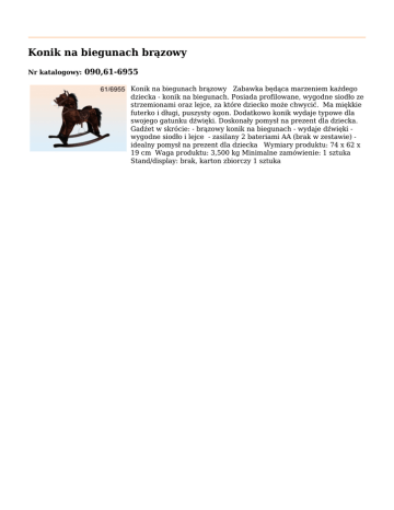 Konik na biegunach brązowy Nr katalogowy: 090,61-6955 Konik na biegunach brązowy Zabawka będąca marzeniem każdego dziecka - konik na biegunach. Posiada profilowane, wygodne siodło ze strzemionami oraz lejce, za które dziecko może chwycić. Ma miękkie futerko i długi, puszysty ogon. Dodatkowo konik wydaje typowe dla swojego gatunku dźwięki. Doskonały pomysł na prezent dla dziecka. Gadżet w skrócie: - brązowy konik na biegunach - wydaje dźwięki wygodne siodło i lejce - zasilany 2 bateriami AA (brak w zestawie) idealny pomysł na prezent dla dziecka Wymiary produktu: 74 x 62 x 19 cm Waga produktu: 3,500 kg Minimalne zamówienie: 1 sztuka Stand/display: brak, karton zbiorczy 1 sztuka