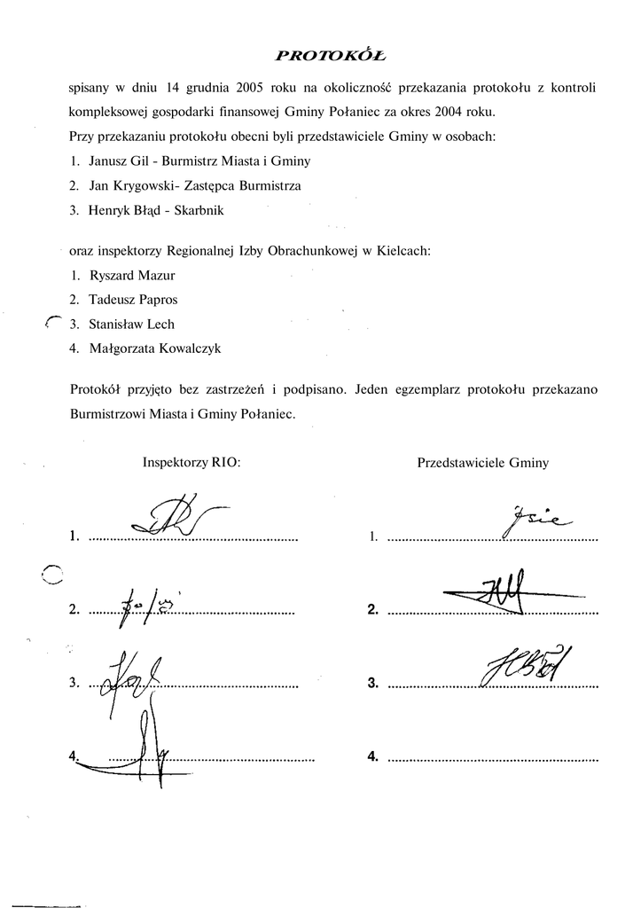 Protokół przyjęto bez zastrzeżeń i podpisano. Jeden egzemplarz protokołu przekazano