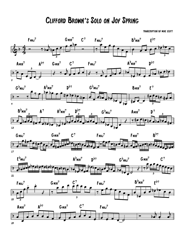 Clifford Brown's Solo on Joy Spring 4 4 &b Ó A min7 5 A 3 b œ œ œœœ ˙ b G maj7 9 œ bœ j œ œ ‰ bœ nœ œ Ó G min7 F maj7 b Ó b G min7 b C7 b b7 œœœœ œ œ œ œ œ œ œ bœ bœ œ ‰ œ C7 F maj7 3 b7 transcription by mike scott B min7 b A min7 F maj7 E D 3 b7 Œ ‰ œj œ œ œ œ Œ ‰ œj œ b œ œ b œ b œ œ b œ n œ œ b œ œ bœ œ b b7 B min E œ ‰ œ bœ bœ œ œ Nœ bœ bœ Nœ œ œ bœ bœ #œ œ œ nœ #œ œ ‰ œ œ bœ œ œ œ bœ #œ 3 B min7 3 A min7 D b A7 A min7 G maj7 b D 37 7 b 7 A min7 G maj7 D7 #œ œ nœ nœ œ bœ bœ œ b œ œ bœ œ œ #œ œ œ bœ œ œ œ Œ ‰ œ œ b œ œ b œ b œ œ œ #œ bœ bœ bœ bœ œ œ bœ 13 3 G min7 3 3 b7 œ œ b œ ‰ # œ œ # œ œ œ œ œ œ # œ œ œ œ œb œn œ œb œ œ œb œ œ ‰ œ œ œ œ n œ œ œ # œ œ œ œb œ œ œn œb œ œ œ œ œ œ œb œ œ G maj7 17 b C7 F maj7 b b7 F min7 B b œ œ œ œœœœ b œ œ œ œ b œ œ n œ b œ b œ œ œ b œ œœ b œb œ œ n œb œn œ b œb œ b œ œ œ œ n œ œ œ b œ œ b œ Œ ‰J bœ œ ˙ 3 21 E maj7 A min7 . œ. œ œ F maj7 b œœ 25 3 A min7 b œ 29 Œ A b7 œ œ œ G min7 ‰ 7 œC œ œœ œ 3 G min7 D C7 G min7 G maj7 b C7 b7 B min7 E Ó j b œ œ. œœœ œ œ œ œ œ œ bœ bœ œ œ ‰ œ bœ F maj7 F maj7 œ œ œ œ œ œ œ œ œ œ œ œ œ œ œ œ œ œ ˙ œ j œ Clifford Brown's Solo on Joy Spring 2 G min7 F maj7 C7 b F maj7 B min7 b7 j j j j jj bœ nœ. bœ bœ œ œ œ b ‰ b œ b œ œ œ œ œ b œ n œ & œ. œ œ œ œ œ œœœœ J . 33 A min7 A b7 G min7 C7 b F maj7 A min7 j b œ œ j b œj n œ œj œ . b œ n œ œ œ œ œ œ œ œ œ œ ˙ 37 œ b b G maj7 b7 D b7 ‰ b œJ b œ œ œ œ b œ Œ b E 3 j œ bœ nœ œ bœ bœ bœ nœ œ bœ bœ bœ œ b œ b œ bœ œ ‰ J œ œ œ bœ œ #œ #œ œ nœ #œ œ œ aœ bœ nœ 41 b A min7 D b b7 bœ b œj œ . b œJ Œ ‰ J ‰ b œj n œ ‰ b œ œ b œ J J bœ B min7 A7 A min7 D G maj7 b œ 3 b œ # œj œ n œ œj œ œ ‰ œ œ œ œ œœ œ 3 G min7 49 b 3 b 53 b 57 b7 œ œ œ bœ j œ œ bœ œ œ ‰ bœ œ bœ A min7 E maj7 b ‰ C7 F maj7 Œ j œ. œ œ b7 G min7 D C7 A min7 G maj7 E7 D7 j œ bœ œ #œ Œ ‰ j œ œ ‰ œ bœ #œ bœ œ 45 G maj7 B min7 j nœ b F maj7 b7 œ œ œ b œ # œj œ œ œ b œ œ bœ œ ˙ 3 F min7 3 G maj7 ‰ bœ bœ œ bœ bœ F maj7 G min7 bœ œ j œ b B C7 œ œœ‰ œœ œ B min7 E b7 j j œ bœ Œ œ œ bœ Œ n œ b œj n œ œ œ œ nœ œ Œ œ œ œ œ bœ bœ œ œ j bœ 3 œœ œ 3 j œ œ œ œ œ #œ œ œ œ nœ œ œ bœ œ b Nœ Œ Œ ‰ bœ œ Nœ œ œ œœœ œ A min7 61 A G min7 C7 F maj7