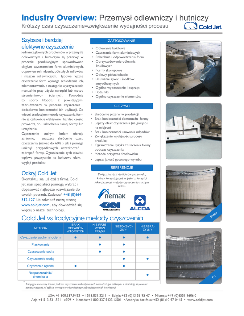 Industry Overview: Przemysł odlewniczy i hutniczy Krótszy czas czyszczenie=zwiększenie wydajności procesu Szybsze i bardziej efektywne czyszczenie ZASTOSOWANIE Jednym z głównych problemów w przemyśle odlewniczym i hutniczym są przerwy w procesie produkcyjnym spowodowane ciągłym czyszczeniem form aluminiowych, odpowietrzeń rdzenia, półstałych odlewów i maszyn odlewniczych. Typowe ręczne czyszczenie form wymaga schłodzenia ich, zdemontowania, a następnie wyczyszczenia manualnie przy użyciu narzędzi lub metod strumieniowościernych. Powoduje to sporo kłopotu z powstającymi zabrudzeniami w procesie czyszczenia i dodatkowo konieczności ich utylizacji. Co więcej, tradycyjne metody czyszczenia form nie są całkowicie efektywne i bardzo często prowadzą do uszkodzenia samej formy lub urządzenia. Czyszczenie suchym lodem oferuje zarówno, znaczące skrócenie czasu czyszczenia (nawet do 60% ) jak i pomaga uniknąć przypadkowych uszczkodzeń i zadrapań formy. Ograniczenie tych zjawisk wpływa pozytywnie na końcowy efekt i wygląd produktu. • • • • • • • • • • Odlewanie kokilowe Czyszcznie form aluminiowych Rdzedznie i odpowietrzenia form Oprzyrządowanie odlewnic kokilowych Formy skorupowe Odlewy półstałe/kucie Usuwanie żywic i środków antyadhezyjnych Ogólne wyposażenie i osprzęt Podajniki Ogólne czyszczenie elementów KORZYŚCI • Skrócenie przerw w produkcji • Brak konieczności demontażu formy • Lepszy efekt czyszczenia (na gorąco i na miejscu) • Brak konieczności usuwania odpadów • Zwiększenie wydajności procesu produkcji • Ograniczenie ryzyka zniszczenia formy podczas czyszczenia • Metoda przyjazna środowisku • Lepsza jakość gotowego wyrobu REFERENCJE Odkryj Cold Jet Skontaktuj się już dziś z firmą Cold Jet, nasi specjaliści pomogą wybrać i dopasować najlepsze rozwiązanie do twoich potrzeb. Zadzwoń +48 (0)664312-127 lub odwiedź naszą stronę www.coldjet.com , aby dowiedzieć się więcej o naszej technologii. Dołącz już dziś do liderów przemysłu, którzy korzystają już w pełni z korzyści jakie przynosi metoda czyszczenia suchym lodem. Cold Jet vs tradycyjne metody czyszczenia METODA BRAK ODPADÓW WTÓRNYCH NIE PRZEWODZI PRĄDU Czyszcznie suchym lodem • • • • Piaskowanie Czyszczenie sod ą Czyszczenie wodą Czyszcznie ręczne Rozpuszczalniki/ chemikalia * • d ze Pr NIETOKSYCZNY* NIEABRAZYJNY • •* •* •* • • • • Tradycyjne materiały ścierne podczas czyszczenia niebezpiecznych zabrudzeń, po zetknięciu z nimi stają się również zanieczyszczone.W efekcie wymaga to odpowiedniego zabezpieczenia ich i utyliazacji. USA: +1 800.337.9423 +1 513.831.3211 • Belgia: +32 (0)13 53 95 47 • Niemcy: +49 (0)6551 9606.0 Azja +1 513.831.3211 x709 • Kanada: +1 800.337.9423 X501 • Ameryka Łacińska: +52 (81)10 97 0445 • www.coldjet.com Po