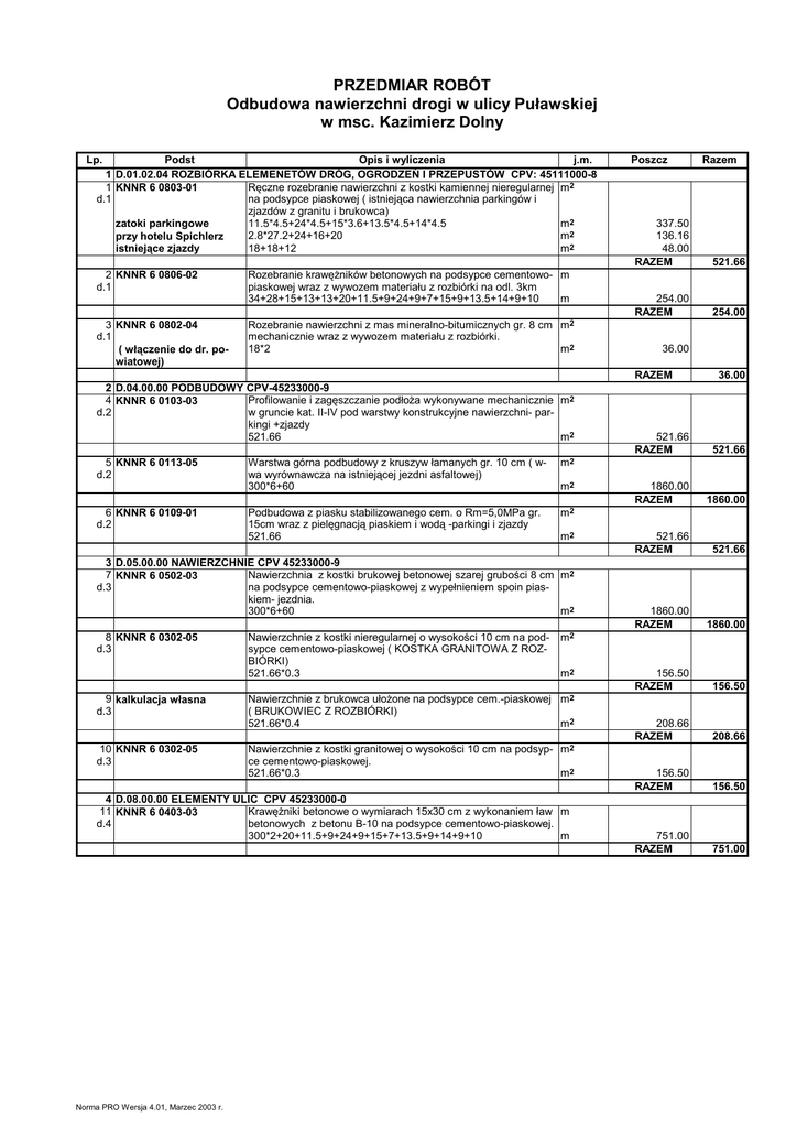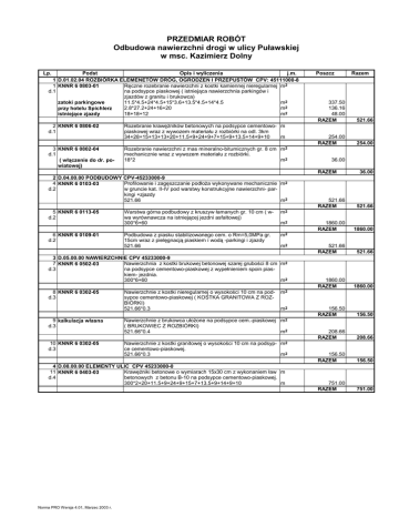 PRZEDMIAR ROBÓT Odbudowa nawierzchni drogi w ulicy Puławskiej w msc. Kazimierz Dolny Lp. Podst Opis i wyliczenia j.m. 1 D.01.02.04 ROZBIÓRKA ELEMENETÓW DRÓG, OGRODZEŃ I PRZEPUSTÓW CPV: 45111000-8 1 KNNR 6 0803-01 Ręczne rozebranie nawierzchni z kostki kamiennej nieregularnej m2 d.1 na podsypce piaskowej ( istniejąca nawierzchnia parkingów i zjazdów z granitu i brukowca) 11.5*4.5+24*4.5+15*3.6+13.5*4.5+14*4.5 m2 zatoki parkingowe 2.8*27.2+24+16+20 m2 przy hotelu Spichlerz 18+18+12 m2 istniejące zjazdy 2 KNNR 6 0806-02 d.1 3 KNNR 6 0802-04 d.1 ( włączenie do dr. powiatowej) Rozebranie krawęŜników betonowych na podsypce cementowo- m piaskowej wraz z wywozem materiału z rozbiórki na odl. 3km 34+28+15+13+13+20+11.5+9+24+9+7+15+9+13.5+14+9+10 m Rozebranie nawierzchni z mas mineralno-bitumicznych gr. 8 cm m2 mechanicznie wraz z wywozem materiału z rozbiórki. 18*2 m2 Poszcz 337.50 136.16 48.00 RAZEM 521.66 254.00 RAZEM 254.00 36.00 RAZEM 2 D.04.00.00 PODBUDOWY CPV-45233000-9 4 KNNR 6 0103-03 Profilowanie i zagęszczanie podłoŜa wykonywane mechanicznie m2 d.2 w gruncie kat. II-IV pod warstwy konstrukcyjne nawierzchni- parkingi +zjazdy 521.66 m2 5 KNNR 6 0113-05 d.2 6 KNNR 6 0109-01 d.2 Warstwa górna podbudowy z kruszyw łamanych gr. 10 cm ( wwa wyrównawcza na istniejącej jezdni asfaltowej) 300*6+60 m2 Podbudowa z piasku stabilizowanego cem. o Rm=5,0MPa gr. 15cm wraz z pielęgnacją piaskiem i wodą -parkingi i zjazdy 521.66 m2 m2 m2 3 D.05.00.00 NAWIERZCHNIE CPV 45233000-9 7 KNNR 6 0502-03 Nawierzchnia z kostki brukowej betonowej szarej grubości 8 cm m2 d.3 na podsypce cementowo-piaskowej z wypełnieniem spoin piaskiem- jezdnia. 300*6+60 m2 8 KNNR 6 0302-05 d.3 9 kalkulacja własna d.3 10 KNNR 6 0302-05 d.3 Nawierzchnie z kostki nieregularnej o wysokości 10 cm na podsypce cementowo-piaskowej ( KOSTKA GRANITOWA Z ROZBIÓRKI) 521.66*0.3 36.00 521.66 RAZEM 521.66 1860.00 RAZEM 1860.00 521.66 RAZEM 521.66 1860.00 RAZEM 1860.00 156.50 RAZEM 156.50 208.66 RAZEM 208.66 156.50 RAZEM 156.50 751.00 RAZEM 751.00 m2 m2 Nawierzchnie z brukowca ułoŜone na podsypce cem.-piaskowej m2 ( BRUKOWIEC Z ROZBIÓRKI) 521.66*0.4 m2 Nawierzchnie z kostki granitowej o wysokości 10 cm na podsyp- m2 ce cementowo-piaskowej. 521.66*0.3 m2 4 D.08.00.00 ELEMENTY ULIC CPV 45233000-0 11 KNNR 6 0403-03 KrawęŜniki betonowe o wymiarach 15x30 cm z wykonaniem ław m d.4 betonowych z betonu B-10 na podsypce cementowo-piaskowej. 300*2+20+11.5+9+24+9+15+7+13.5+9+14+9+10 m Norma PRO Wersja 4.01, Marzec 2003 r. Razem