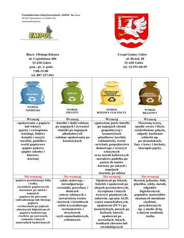 Przedsiębiorstwo Usług Komunalnych „EMPOL” Sp. z o.o. 34-451 Tylmanowa, os. Rzeka 133 www.pukempol.pl Biuro Obsługi Klienta ul. Cegielniana 406 32-420 Gdów pon.- pt. w godz. 7:00-15:00 tel. 887-227-011 WOREK NIEBIESKI Urząd Gminy Gdów ul. Rynek 40 32-420 Gdów tel. 12/251-04-95 WOREK ZIELONY WOREK RÓŻOWY LUB ŻÓŁTY WOREK BRĄZOWY Wrzucaj - opakowania z papieru lub tektury -gazety i czasopisma -katalogi, foldery -książki i zeszyty -torebki, pudełka i worki papierowe -papier pakowy -papier szkolny i biurowy -kartony Wrzucaj -butelki i słoiki szklane po napojach i żywności -butelki po napojach alkoholowych -szklane opakowania po kosmetykach Wrzucaj Skoszoną trawę, opadłe owoce i liście, rozdrobnione gałęzie, odpady kuchenne (obierki np. po ziemniakach, fusy z kawy i herbaty, skorupki jajek). Nie wrzucaj Nie wrzucaj -szkła stołowego – żaroodpornego -ceramiki, porcelany i doniczek -zniczy szklanych z zawartością wosku -żarówek i świetlówek -szkła kryształowego -termometrów i strzykawek -szyb samochodowych, reflektorów Wrzucaj -zgniecione puste butelki po napojach chemii gospodarczej i kosmetykach -plastikowe torebki, reklamówki, worki -artykuły gospodarstwa domowego z tworzyw sztucznych oraz metali kolorowych -metalowe pudełka po paście do butów -kartony po sokach i napojach -kartony po mleku Nie wrzucaj Opakowań po lekach, butelek i opakowań po olejach przemysłowych, styropianu i innych tworzyw piankowych, zabawek, sprzętu AGD, części samochodowych, opakowań (PCV) po kosmetykach, puszek po farbach, baterii, opakowań po aerozolach, lekach, środkach chwasto lub owadobójczych -papieru powlekanego folią i kalkę -ręczników papierowych -kartonów po mleku i napojach -papieru do pieczenia -zabrudzonego lub tłustego papieru -wytłaczanek po jajkach -chusteczek higienicznych -papieru toaletowego -worków po nawozach, cemencie i innych materiałach budowlanych Nie wrzucaj Resztek jedzenia, folii, plastiku, szkła, metali, odpadów higienicznych, popiołów, materiałów skażonych metalami ciężkimi, pozyskiwanych np. z okolic dróg o dużym nasileniu ruchu