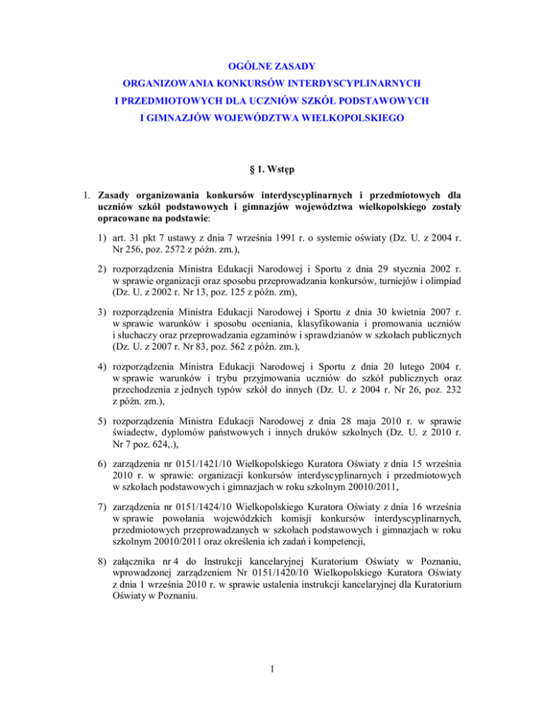OGÓLNE ZASADY ORGANIZOWANIA KONKURSÓW INTERDYSCYPLINARNYCH I PRZEDMIOTOWYCH DLA UCZNIÓW SZKÓŁ PODSTAWOWYCH I GIMNAZJÓW WOJEWÓDZTWA WIELKOPOLSKIEGO § 1. Wstęp 1. Zasady organizowania konkursów interdyscyplinarnych i przedmiotowych dla uczniów szkół podstawowych i gimnazjów województwa wielkopolskiego zostały opracowane na podstawie: 1) art. 31 pkt 7 ustawy z dnia 7 września 1991 r. o systemie oświaty (Dz. U. z 2004 r. Nr 256, poz. 2572 z późn. zm.), 2) rozporządzenia Ministra Edukacji Narodowej i Sportu z dnia 29 stycznia 2002 r. w sprawie organizacji oraz sposobu przeprowadzania konkursów, turniejów i olimpiad (Dz. U. z 2002 r. Nr 13, poz. 125 z późn. zm), 3) rozporządzenia Ministra Edukacji Narodowej i Sportu z dnia 30 kwietnia 2007 r. w sprawie warunków i sposobu oceniania, klasyfikowania i promowania uczniów i słuchaczy oraz przeprowadzania egzaminów i sprawdzianów w szkołach publicznych (Dz. U. z 2007 r. Nr 83, poz. 562 z późn. zm.), 4) rozporządzenia Ministra Edukacji Narodowej i Sportu z dnia 20 lutego 2004 r. w sprawie warunków i trybu przyjmowania uczniów do szkół publicznych oraz przechodzenia z jednych typów szkół do innych (Dz. U. z 2004 r. Nr 26, poz. 232 z późn. zm.), 5) rozporządzenia Ministra Edukacji Narodowej z dnia 28 maja 2010 r. w sprawie świadectw, dyplomów państwowych i innych druków szkolnych (Dz. U. z 2010 r. Nr 7 poz. 624,.), 6) zarządzenia nr 0151/1421/10 Wielkopolskiego Kuratora Oświaty z dnia 15 września 2010 r. w sprawie: organizacji konkursów interdyscyplinarnych i przedmiotowych w szkołach podstawowych i gimnazjach w roku szkolnym 20010/2011, 7) zarządzenia nr 0151/1424/10 Wielkopolskiego Kuratora Oświaty z dnia 16 września w sprawie powołania wojewódzkich komisji konkursów interdyscyplinarnych, przedmiotowych przeprowadzanych w szkołach podstawowych i gimnazjach w roku szkolnym 20010/2011 oraz określenia ich zadań i kompetencji, 8) załącznika nr 4 do Instrukcji kancelaryjnej Kuratorium Oświaty w Poznaniu, wprowadzonej zarządzeniem Nr 0151/1420/10 Wielkopolskiego Kuratora Oświaty z dnia 1 września 2010 r. w sprawie ustalenia instrukcji kancelaryjnej dla Kuratorium Oświaty w Poznaniu. 1 2. Cele konkursów interdyscyplinarnych i przedmiotowych: 1) wspomaganie nauczycieli i dyrektorów szkół województwa wielkopolskiego w działaniach na rzecz uczniów szczególnie uzdolnionych, 2) motywowanie nauczycieli do podejmowania różnorodnych, skutecznych działań służących rozwijaniu u uczniów ciekawości poznawczej, uzdolnień oraz wiedzy i umiejętności przedmiotowych, 3) rozbudzanie ambicji i aspiracji edukacyjnych uczniów, 4) wspieranie uczniów szczególnie uzdolnionych do kontynuowania nauki w szkołach wyższego stopnia, w ich przygotowaniach 5) promowanie osiągnięć edukacyjnych uczniów oraz kompetencji i zaangażowania zawodowego ich nauczycieli – dydaktycznych opiekunów. § 2. Postanowienia ogólne dotyczące wszystkich konkursów 1. Ogólne założenia i zasady przeprowadzania konkursów: 1) organizatorem konkursów interdyscyplinarnych i przedmiotowych dla uczniów szkół podstawowych i gimnazjów województwa wielkopolskiego jest Wielkopolski Kurator Oświaty; 2) konkursy interdyscyplinarne organizowane są dla uczniów klas IV – VI szkoły podstawowej, natomiast konkursy przedmiotowe dla uczniów gimnazjów; 3) Wielkopolski Kurator Oświaty w celu wspomagania i koordynowania działań związanych z konkursami wyznacza wizytatorów wspomagających organizację i przebieg konkursów interdyscyplinarnych i przedmiotowych w województwie tzw. koordynatorów; 4) do dnia 30 września każdego roku szkolnego Kurator określa w formie zarządzenia wykaz konkursów interdyscyplinarnych i przedmiotowych organizowanych w województwie. 5) udział uczniów szkół podstawowych i gimnazjów w eliminacjach konkursowych jest dobrowolny; przewodniczący odpowiednich komisji każdorazowo przyjmują od uczestników deklarację przystąpienia do danego etapu konkursu; 6) organizacja konkursów uwzględnia potrzeby osób niepełnosprawnych oraz przewlekle chorych poprzez dostosowanie warunków przeprowadzenia konkursu do potrzeb ww. uczestników; 7) konkursy składają się z 3 etapów: a) szkolnego, b) rejonowego, c) wojewódzkiego; 2 8) terminy i miejsca przeprowadzania poszczególnych etapów określa Wielkopolski Kurator Oświaty w formie harmonogramu konkursów stanowiącego załącznik nr 2 do zarządzenia nr 0151/1421/10 Wielkopolskiego Kuratora Oświaty; 9) etapy konkursów przeprowadzane w dniach nauki szkolnej rozpoczynają się o godz. 12.30, a w soboty o godz.11.00; 10) czas trwania danego etapu konkursu określa jego regulamin; 11) przeprowadzeniem i organizacją eliminacji konkursowych na poszczególnych etapach zajmują się komisje konkursowe powoływane przez: a) Wielkopolskiego Kuratora Oświaty, w terminie do 30 września każdego roku, w formie zarządzenia - Wojewódzka Komisja Konkursowa, b) dyrektorów delegatur i dyrektora Wydziału Kształcenia, Wychowania i Opieki Kuratorium Oświaty w Poznaniu, w terminie 14 dni od przeprowadzenia etapu szkolnego - Rejonowe Komisje Konkursowe, c) dyrektorów szkół podstawowych i gimnazjów - Szkolne Komisje Konkursowe; 12) konkursy interdyscyplinarne i przedmiotowe obejmują: treści określone w podstawie programowej kształcenia ogólnego danej edukacji lub przedmiotu nauczania, mogą ponadto obejmować treści poszerzające wiedzę i umiejętności danej edukacji wskazane w regulaminach konkursu (np. ustalenia wyznaczające zakres wiedzy i umiejętności wymaganych na danym etapie konkursu oraz wykaz literatury); 13) prace konkursowe uczniów, na każdym etapie są kodowane; rozkodowanie prac następuje po ich sprawdzeniu i ocenieniu przez właściwą komisję konkursową; 14) każda praca konkursowa musi być oceniona zgodnie z kryteriami opracowanymi przez autora testu i podpisana przez oceniającego - członka komisji