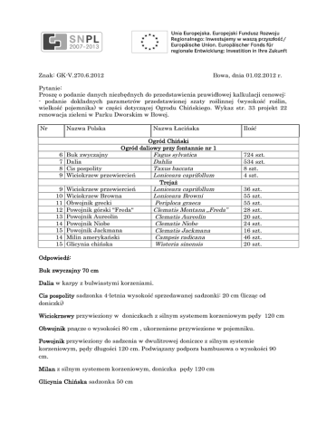 Znak: GK-V.270.6.2012 owa, dnia 01.02.2012 r. Pytanie: Prosz o podanie danych niezb dnych do przedstawienia prawid owej kalkulacji cenowej: - podanie dok adnych parametrów przedstawionej szaty ro linnej (wysoko ro lin, wielko pojemnika) w cz ci dotycz cej Ogrodu Chi skiego. Wykaz str. 33 projekt 22 renowacja zieleni w Parku Dworskim w I owej. Nr Nazwa Polska 6 7 8 9 9 10 11 12 13 14 15 14 15 Nazwa aci ska Ogród Chi ski Ogród daliowy przy fontannie nr 1 Buk zwyczajny Fagus sylvatica Dalia Dahlia Cis pospolity Taxus baccata Wiciokrzew przewiercie Loniceara caprifollum Treja Wiciokrzew przewiercie Loniceara caprifollum Wiciokrzew Browna Loniceara Browni Obwojnik grecki Periploca graeca Powojnik górski "Freda" Clematis Montana „Freda” Powojnik Aureolin Clematis Aureolin Powojnik Niobe Clematis Niobe Powojnik Jackmana Clematis Jackmana Milin ameryka ski Campsis radicana Glicynia chi ska Wisteria sinensis Ilo 724 szt. 534 szt. 8 szt. 4 szt. 36 szt. 55 szt. 55 szt. 28 szt. 20 szt. 24 szt. 16 szt. 46 szt. 20 szt. Odpowied : Buk zwyczajny 70 cm Dalia w karpy z bulwiastymi korzeniami. Cis pospolity sadzonka 4-letnia wysoko doniczki) sprzedawanej sadzonki: 20 cm (licz c od Wiciokrzewy przywieziony w doniczkach z silnym systemem korzeniowym p dy 120 cm Obwojnik pn cze o wysoko ci 80 cm , ukorzenione przywiezione w pojemniku. Powojnik przywieziony do sadzenia w dwulitrowej doniczce z silnym systemie korzeniowym, p dy d ugo ci 120 cm. Podwi zany podpora bambusowa o wysoko ci 90 cm. Milan z silnym systemem korzeniowym, doniczka p dy 120 cm Glicynia Chi ska sadzonka 50 cm
