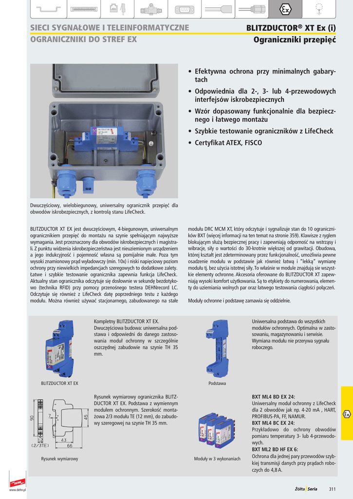 1 2 3 4 5 6 7 8 9 0 BlitzDUctOr® xt Ex (i) Ograniczniki przepięć SiEci SygNałOwE i tElEiNfOrMatyczNE OgraNiczNiki DO StrEf Ex • Efektywna ochrona przy minimalnych gabarytach • Odpowiednia dla 2-, 3- lub 4-przewodowych interfejsów iskrobezpiecznych • Wzór dopasowany funkcjonalnie dla bezpiecznego i łatwego montażu • Szybkie testowanie ograniczników z LifeCheck • Certyfikat ATEX, FISCO Dwuczęściowy, wielobiegunowy, uniwersalny ogranicznik przepięć dla obwodów iskrobezpiecznych, z kontrolą stanu LifeCheck. BLITZDUCTOR XT EX jest dwuczęściowym, 4-biegunowym, uniwersalnym ogranicznikiem przepięć do montażu na szynie spełniającym najwyższe wymagania. Jest przeznaczony dla obwodów iskrobezpiecznych i magistrali. Z punktu widzenia iskrobezpieczeństwa jest nieuziemionym urządzeniem a jego indukcyjność i pojemność własna są pomijalnie małe. Poza tym wysoki znamionowy prąd wyładowczy (min. 10x) i niski napięciowy poziom ochrony przy niewielkich impedancjach szeregowych to dodatkowe zalety. Łatwe i szybkie testowanie ogranicznika zapewnia funkcja LifeCheck. Aktualny stan ogranicznika odczytuje się dosłownie w sekundę bezdotykowo (technika RFID) przy pomocy przenośnego testera DEHNrecord LC. Odczytuje się również z LifeCheck datę poprzedniego testu z każdego modułu. Można również używać stacjonarnego, zabudowanego na stałe modułu DRC MCM XT, który odczytuje i sygnalizuje stan do 10 ograniczników BXT (więcej informacji na ten temat na stronie 59). Klawisze z ryglem blokującym służą bezpiecznej pracy i zapewniają odporność na wstrząsy i wibracje, siły o wartości do 0-krotnie większej od grawitacji. Obudowa, której kształt jest zdeterminowany przez funkcjonalność, umożliwia pewne osadzenie modułu w podstawie jak również łatwą i “lekką” wymianę modułu tj. bez użycia istotnej siły. To właśnie w module znajdują sie wszystkie elementy ochronne. Akcesoria oferowane do BLITZDUCTOR XT zapewniają wysoki komfort użytkowania. Są to etykiety do numerowania, elementy do uziemiania wolnych par oraz łatwego testowania ciągłości połączeń. Kompletny BLITZDUCTOR XT EX. Dwuczęściowa budowa: uniwersalna podstawa i odpowiedni do danego zastosowania moduł ochronny w szczególnie oszczędnej zabudowie na szynie TH 5 mm. Uniwersalna podstawa do wszystkich modułów ochronnych. Optimalna w zastosowaniu, magazynowaniu i serwisie. Wymiana modułu nie przerywa sygnału roboczego. Moduły ochronne i podstawę zamawia się oddzielnie. Podstawa BLITZDUCTOR XT EX Rysunek wymiarowy ogranicznika BLITZDUCTOR XT EX. Podstawa z wymiennym modułem ochronnym. Szerokość montażowa 2/ modułu TE (12 mm), do zabudowy szeregowej na szynie TH 5 mm. Rysunek wymiarowy www.dehn.pl Moduły w wykonaniach BXT ML4 BD EX 24: Uniwersalny moduł ochronny z LifeCheck dla 2 obwodów jak np. 4-20 mA , HART, PROFIBUS-PA, FF, NAMUR. BXT ML4 BC EX 24: Przykładowo do ochrony obwodów pomiaru temperatury - lub 4-przewodowych. BXT ML2 BD HF EX 6: Ochrona dla jednej pary przewodów szybkiej transmisji danych przy prądach roboczych do 4,8 A. 11 1 2 3 4 5 6 7 8 9 0 BlitzDUctOr® xt Ex (i) z lifecheck® SiEci SygNałOwE i tElEiNfOrMatyczNE OgraNiczNiki DO StrEf Ex Moduł Bxt Ml4 BD Ex 24 1 1´ 2 2´ strona protected chroniona • Uniwersalnego stosowania, z kontrolą stanu LifeCheck • Niska pojemność i indukcyjność własna • Do stosowania zgodnie ze Strefową Koncepcją Ochrony Odgromowej jako przejście pomiędzy strefami 0B – 2 i wyżej 3 3´ 4 4´ Bezdotykowa (RFID) kontrola stanu ogranicznika z LifeCheck przy pomocy przenośnego testera DEHNrecord LC. Wytrzymałość izolacji > 500 V względem ziemi. Rysunek wymiarowy BXT ML4 BD EX Moduł ochronny z LifeCheck do ochrony 2 par przewodów obwodu iskrobezpiecznego i magistrali, spełnia wymagania FISCO. BXT ML4 BD EX 24 Klasa ogranicznika T Kontrola stanu ogranicznika LifeCheck Napięcie znamionowe UN 24 V Największe napięcie trwałej pracy DC Uc V Największe napięcie trwałej pracy AC Uc 2 V Maks. napięcie wejściowe wg EN 60079-11 Ui 0 V Maks. prąd wejściowy wg EN 60079-11 Ii 0,5 A D1 Prąd udarowy (10/350) razem Iimp 4 kA D1 Prąd udarowy (10/350) na 1 linię Iimp 1 kA C2 Znamionowy prąd wyładowczy (8/20) razem In 20 kA C2 Znamionowy prąd wyładowczy (8/20) na 1 linię In 5 kA Napięciowy poziom ochrony linia-linia przy Iimp D1 Up ≤ 50 V Napięciowy poziom ochrony linia-PG przy Iimp D1 Up ≤ 100 V Napięciowy poziom ochrony linia-linia przy In C2 Up ≤ 52 V Napięciowy poziom ochrony linia-PG przy In C2 Up ≤ 1400 V Napięciowy poziom ochrony linia-linia przy 1 kV/µs C3 Up ≤ 45 V Napięciowy poziom ochrony linia-PG przy 1 kV/µs C3 Up ≤ 1100 V Impedancja szeregowa na 1 linię 1,0 Ohm Częstotliwość graniczna linia-linia fG 7,7 MHz Pojemność własna linia-linia C ≤ 0,8 nF Pojemność własna linia-PG C ≤ 16 pF Zakres temperatur pracy -40°C...+80°C Stopień ochrony (moduł w podstawie) IP 20 Montaż w podstawie BXT BAS Uziemienie przez podstawę BXT BAS Materiał obudowy Polyamid PA 6.6 Kolor niebieski Spełnia wymagania normy PN-EN 6164-21, UL 497B Klasyfikacja SIL SIL2 / SIL, szczegóły na: www.dehn.pl/de/sil/ Certyfikaty Ex ATEX: KEMA 06ATEX0274 X: II 2 (1) G Ex ia IIC T4 ... T6 Certyfikaty dodatkowe CSA, GOST Dane potrzebne do zamówienia Typ Numer katalogowy Opakowanie jednostkowe BXT ML4 BD EX 24 920 381 1 szt. Akcesoria do BLITZDUCTOR® XT Ex(i) z LifeCheck® 920 01 EX BXT BAS EX 920 01 BXT BAS BXT BAS EX 910 695 MCM XT Podstawa, 4-biegunowa, do obowdów iskrobezpiecznych, z zaciskami umożliwiająca wymianę modułów bez przerywania sygnału. Typ BXT BAS EX Akcesoria do BLITZDUCTOR® XT Ex(i) z LifeCheck® Opak. jedn. Numer szt. katalogowy 1 920 301 DRC MCM XT 910 695 DRC 910 65 M DRC MCM XT Z czytnikiem LifeCheck do kontroli stanu do 10 modułów BXT z LifeCheck (bezprzewodowo). Typ DRC MCM XT Akcesoria do BLITZDUCTOR® XT Ex(i) z LifeCheck® Opak. je