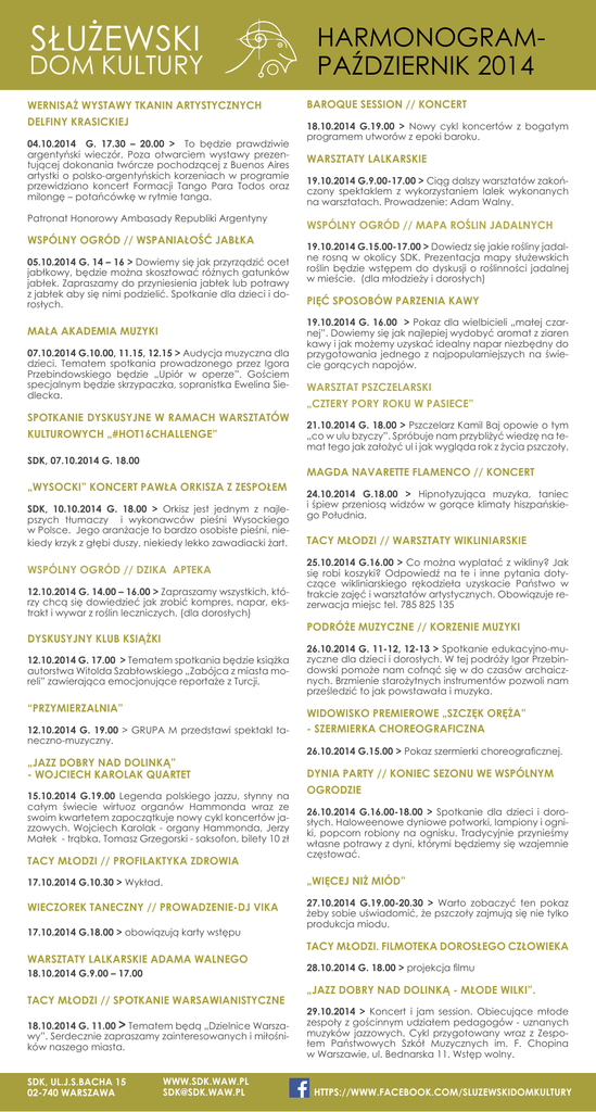 SŁUŻEWSKI DOM KULTURY WERNISAŻ WYSTAWY TKANIN ARTYSTYCZNYCH DELFINY KRASICKIEJ 04.10.2014 G. 17.30 – 20.00 > To będzie prawdziwie argentyński wieczór. Poza otwarciem wystawy prezentującej dokonania twórcze pochodzącej z Buenos Aires artystki o polsko-argentyńskich korzeniach w programie przewidziano koncert Formacji Tango Para Todos oraz milongę – potańcówkę w rytmie tanga. Patronat Honorowy Ambasady Republiki Argentyny WSPÓLNY OGRÓD // WSPANIAŁOŚĆ JABŁKA 05.10.2014 G. 14 – 16 > Dowiemy się jak przyrządzić ocet jabłkowy, będzie można skosztować różnych gatunków jabłek. Zapraszamy do przyniesienia jabłek lub potrawy z jabłek aby się nimi podzielić. Spotkanie dla dzieci i dorosłych. MAŁA AKADEMIA MUZYKI 07.10.2014 G.10.00, 11.15, 12.15 > Audycja muzyczna dla dzieci. Tematem spotkania prowadzonego przez Igora Przebindowskiego będzie „Upiór w operze”. Gościem specjalnym będzie skrzypaczka, sopranistka Ewelina Siedlecka. SPOTKANIE DYSKUSYJNE W RAMACH WARSZTATÓW KULTUROWYCH „#HOT16CHALLENGE” SDK, 07.10.2014 G. 18.00 „WYSOCKI” KONCERT PAWŁA ORKISZA Z ZESPOŁEM SDK, 10.10.2014 G. 18.00 > Orkisz jest jednym z najlepszych tłumaczy i wykonawców pieśni Wysockiego w Polsce. Jego aranżacje to bardzo osobiste pieśni, niekiedy krzyk z głębi duszy, niekiedy lekko zawadiacki żart. WSPÓLNY OGRÓD // DZIKA APTEKA 12.10.2014 G. 14.00 – 16.00 > Zapraszamy wszystkich, którzy chcą się dowiedzieć jak zrobić kompres, napar, ekstrakt i wywar z roślin leczniczych. (dla dorosłych) DYSKUSYJNY KLUB KSIĄŻKI 12.10.2014 G. 17.00 > Tematem spotkania będzie książka autorstwa Witolda Szabłowskiego „Zabójca z miasta moreli” zawierająca emocjonujące reportaże z Turcji. “PRZYMIERZALNIA” 12.10.2014 G. 19.00 > GRUPA M przedstawi spektakl taneczno-muzyczny. „JAZZ DOBRY NAD DOLINKĄ” - WOJCIECH KAROLAK QUARTET 15.10.2014 G.19.00 Legenda polskiego jazzu, słynny na całym świecie wirtuoz organów Hammonda wraz ze swoim kwartetem zapoczątkuje nowy cykl koncertów jazzowych. Wojciech Karolak - organy Hammonda, Jerzy Małek - trąbka, Tomasz Grzegorski - saksofon, bilety 10 zł TACY MŁODZI // PROFILAKTYKA ZDROWIA HARMONOGRAMPAŹDZIERNIK 2014 BAROQUE SESSION // KONCERT 18.10.2014 G.19.00 > Nowy cykl koncertów z bogatym programem utworów z epoki baroku. WARSZTATY LALKARSKIE 19.10.2014 G.9.00-17.00 > Ciąg dalszy warsztatów zakończony spektaklem z wykorzystaniem lalek wykonanych na warsztatach. Prowadzenie: Adam Walny. WSPÓLNY OGRÓD // MAPA ROŚLIN JADALNYCH 19.10.2014 G.15.00-17.00 > Dowiedz się jakie rośliny jadalne rosną w okolicy SDK. Prezentacja mapy służewskich roślin będzie wstępem do dyskusji o roślinności jadalnej w mieście. (dla młodzieży i dorosłych) PIĘĆ SPOSOBÓW PARZENIA KAWY 19.10.2014 G. 16.00 > Pokaz dla wielbicieli „małej czarnej”. Dowiemy się jak najlepiej wydobyć aromat z ziaren kawy i jak możemy uzyskać idealny napar niezbędny do przygotowania jednego z najpopularniejszych na świecie gorących napojów. WARSZTAT PSZCZELARSKI „CZTERY PORY ROKU W PASIECE” 21.10.2014 G. 18.00 > Pszczelarz Kamil Baj opowie o tym „co w ulu bzyczy”. Spróbuje nam przybliżyć wiedzę na temat tego jak założyć ul i jak wygląda rok z życia pszczoły. MAGDA NAVARETTE FLAMENCO // KONCERT 24.10.2014 G.18.00 > Hipnotyzująca muzyka, taniec i śpiew przeniosą widzów w gorące klimaty hiszpańskiego Południa. TACY MŁODZI // WARSZTATY WIKLINIARSKIE 25.10.2014 G.16.00 > Co można wyplatać z wikliny? Jak się robi koszyki? Odpowiedź na te i inne pytania dotyczące wikliniarskiego rękodzieła uzyskacie Państwo w trakcie zajęć i warsztatów artystycznych. Obowiązuje rezerwacja miejsc tel. 785 825 135 PODRÓŻE MUZYCZNE // KORZENIE MUZYKI 26.10.2014 G. 11-12, 12-13 > Spotkanie edukacyjno-muzyczne dla dzieci i dorosłych. W tej podróży Igor Przebindowski pomoże nam cofnąć się w do czasów archaicznych. Brzmienie starożytnych instrumentów pozwoli nam prześledzić to jak powstawała i muzyka. WIDOWISKO PREMIEROWE „SZCZĘK ORĘŻA” - SZERMIERKA CHOREOGRAFICZNA 26.10.2014 G.15.00 > Pokaz szermierki choreograficznej. DYNIA PARTY // KONIEC SEZONU WE WSPÓLNYM OGRODZIE 26.10.2014 G.16.00-18.00 > Spotkanie dla dzieci i dorosłych. Haloweenowe dyniowe potworki, lampiony i ogniki, popcorn robiony na ognisku. Tradycyjnie przynieśmy własne potrawy z dyni, którymi będziemy się wzajemnie częstować. 17.10.2014 G.10.30 > Wykład. „WIĘCEJ NIŻ MIÓD” WIECZOREK TANECZNY // PROWADZENIE-DJ VIKA 27.10.2014 G.19.00-20.30 > Warto zobaczyć ten pokaz żeby sobie uświadomić, że pszczoły zajmują się nie tylko produkcja miodu. 17.10.2014 G.18.00 > obowiązują karty wstępu WARSZTATY LALKARSKIE ADAMA WALNEGO 18.10.2014 G.9.00 – 17.00 TACY MŁODZI // SPOTKANIE WARSAWIANISTYCZNE 18.10.2014 G. 11.00 > Tematem będą „Dzielnice Warszawy”. Serdecznie zapraszamy zainteresowanych i miłośników naszego miasta. SDK, UL.J.S.BACHA 15 02-740 WARSZAWA WWW.SDK.WAW.PL [email protected] TACY MŁODZI. FILMOTEKA DOROSŁEGO CZŁOWIEKA 28.10.2014 G. 18.00 > projekcja filmu „JAZZ DOBRY NAD DOLINKĄ - MŁODE WILKI”. 29.10.2014 > Koncert i jam session. Obiecujące młode zespoły z gościnnym udziałem pedagogów - uznanych muzyków jazzowych. Cykl przygotowany wraz z Zespołem Państwowych Szkół Muzycznych im. F. Chopina w Warszawie, ul. Bednarska 11. Wstęp wolny. HTTPS://WWW.FACEBOOK.COM/SLUZEWSKIDOMKULTURY
