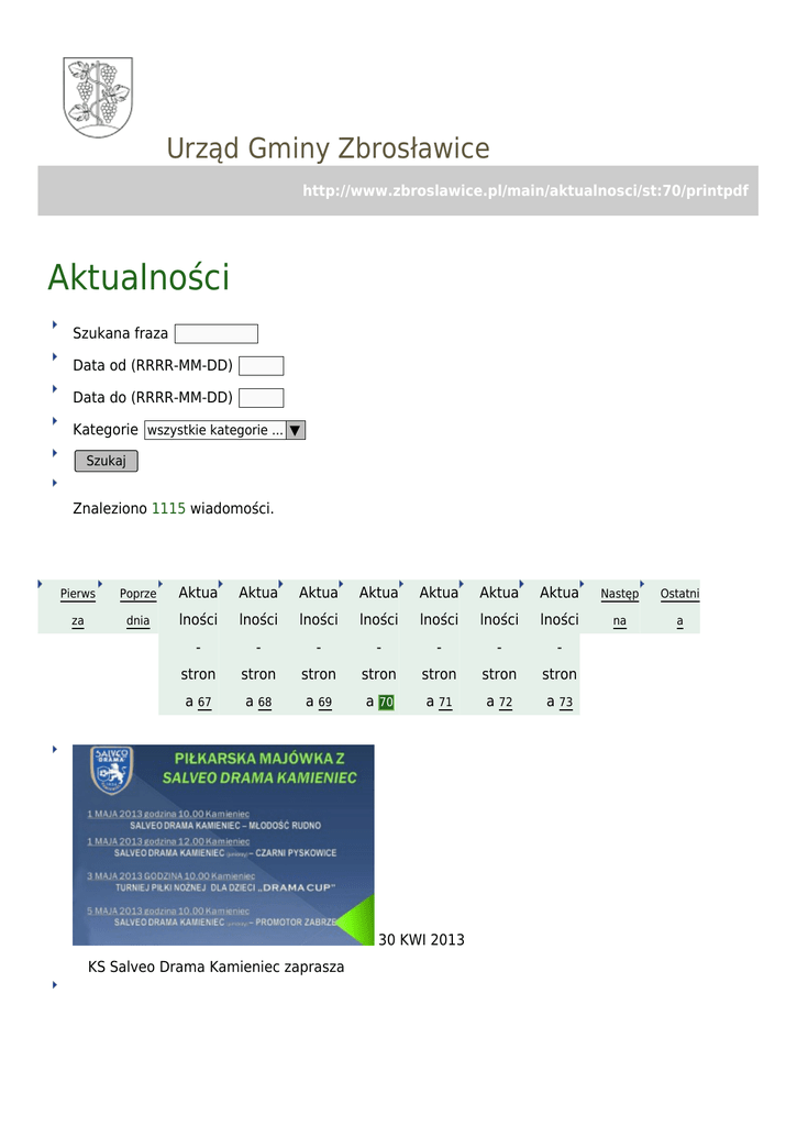 Urząd Gminy Zbrosławice http://www.zbroslawice.pl/main/aktualnosci/st:70/printpdf Aktualności Szukana fraza Data od (RRRR-MM-DD) Data do (RRRR-MM-DD) Kategorie wszystkie kategorie ... ▼ Szukaj Znaleziono 1115 wiadomości. Pierws Poprze Aktua Aktua Aktua Aktua Aktua Aktua Aktua Następ Ostatni za dnia lności lności lności lności lności lności lności na a - - - - - - - stron stron stron stron stron stron stron a 67 a 68 a 69 a a 71 a 72 a 73 70 30 KWI 2013 KS Salveo Drama Kamieniec zaprasza 29 KWI 2013 Zapraszamy na koncert! 26 KWI 2013 kategoria: ODWOŁANY DZIEŃ OTWARTY Komunikaty urzędowe UWAGA! UWAGA! UWAGA! Z POWODÓW OD NAS NIEZALEŻNYCH, JUTRZEJSZY DZIEŃ OTWARTY PROMOCJI ZDROWIA ZOSTAJE PRZEŁOŻONY NA INNY TERMIN.ZOSTANIE ON PODANY W NAJBLIŻSZYM CZASIE, PO USTALENIACH DOKONANYCH Z PROWADZĄCYMI. ZA ZAISTNIAŁĄ SYTUACJĘ GORĄCO PRZEPRASZAMY. 25 KWI 2013 Ogłoszenie - Kanalizacja w Czekanowie kategoria: Inwestycje Informujemy, że wg informacji przekazanych na zebraniu informacyjnym w dniu 24 kwietnia 2013 r., Zakład Gospodarki Komunalnej i Mieszkaniowej (ZGKiM)w Zbrosławicach rozpocznie podłączanie domów do sieci kanalizacyjnej od dnia 6 maja 2013 r. Szczegółowe informacje zawarte w ogłoszeniu można znaleźć TUTAJ. 24 KWI 2013 kategoria: Czekanów Komunikaty urzędowe Mieszkańcy Sołectwa Czekanów na zebraniu, które odbyło się dzisiaj (24 kwietnia) o godzinie 18:00 wybrali Sołtysa. Został nim Pan Andrzej Ordon. W głosowaniu uczestniczyło 101 mieszkańców. 24 KWI 2013 Nowa "WIEŚĆ Z GMINY" kategoria: Komunikaty urzędowe Świeże wydanie gazety "Wieść z gminy" już dostępne!Można je pobrać TUTAJ, a wersja papierowa będzie dostępna od piątku w Waszych miejscowościach w gminie.Przyjemnej lektury! 19 KWI 2013 Nie wypalaj traw! 19 KWI 2013 Pamiętaj o azbeście kategoria: Komunikaty urzędowe Wójt Gminy Zbrosławice informuje, że osoby fizyczne mają obowiązek co roku, do dnia 31 stycznia przekazywać informacje o rodzaju, ilości i miejscach występowania wyrobów azbestowych.W związku z powyższym Wójt Gminy Zbrosławice zwraca się do mieszkańców Gminy, którzy nie dopełnili ww. obowiązku o dostarczenie do Urzędu Gminy Zbrosławice wypełnionego formularza „Informacji o wyrobach zawierających azbest".W celu 18 KWI 2013 Zawody w skokach przez przeszkody 18 KWI 2013 kategoria: Festiwal Piosenki Ekologicznej Inne Tu znajdziesz REGULAMIN FESTIWALU Tu znajdziesz KARTĘ ZGŁOSZENIA Tu znajdziesz LISTĘ PRZYKŁADOWYCH PIOSENEK Pierws Poprze Aktua Aktua Aktua Aktua Aktua Aktua Aktua Następ Ostatni za dnia lności lności lności lności lności lności lności na a - - - - - - - stron stron stron stron stron stron stron a 67 a 68 a 69 a a 71 a 72 a 73 70