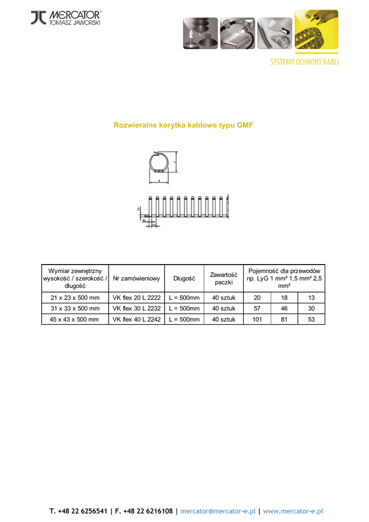 Rozwieralne korytka kablowe typu GMF Wymiar zewnętrzny wysokość / szerokość / Nr zamówieniowy długość Długość Zawartość paczki Pojemność dla przewodów np. LyG 1 mm² 1,5 mm² 2,5 mm² 21 x 23 x 500 mm VK flex 20 L 2222 L = 500mm 40 sztuk 20 18 13 31 x 33 x 500 mm VK flex 30 L 2232 L = 500mm 40 sztuk 57 46 30 45 x 43 x 500 mm VK flex 40 L 2242 L = 500mm 40 sztuk 101 81 53