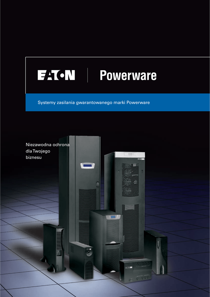 Systemy zasilania gwarantowanego marki Powerware Niezawodna ochrona dla Twojego biznesu Eaton Eaton jest prężnie rozwijającym się producentem przemysłowym. Dzięki nowoczesnym metodom projektowania i światowej klasy procesom produkcyjnym firma oferuje, dostosowane do potrzeb klientów, rozwiązania elektryczne pod takimi markami, jak: POWERWARE, Cutler-Hammer, Kurant, Heinemann, Holec, MEM oraz wiele innych. Marka POWERWARE, znana wcześniej jako FISKARS oraz EXIDE, jest obecna na rynku polskim już od 17 lat. Firma Eaton Power Quality, oferując pełną gamę produktów i usług z dziedziny systemów zasilania gwarantowanego, specjalizuje się w dostarczaniu: - zasilaczy UPS marki POWERWARE - agregatów prądotwórczych Tradycja innowacji technicznych - baterii stacjonarnych - oprogramowania zarządzającego i zdalnego monitorowania - usług integracyjnych „pod klucz”, w skład których wchodzą m.in.: profesjonalne doradztwo i konsultacje, projektowanie systemów, transport, montaż, instalacje, uruchamianie urządzeń, wykonywanie zabezpieczeń akustycznych, wentylacji i klimatyzacji, szkolenia dla Użytkowników, łącząc wszystko w jeden sprawnie i niezawodnie funkcjonujący system. Więcej informacji na temat firmy, produktów i usług znajdziecie Państwo w naszym serwisie internetowym: www.powerware.pl, www.eaton.com Topologia zasilaczy UPS marki Powerware Seria 3 VFD (off-line) Wyjście AC Łącznik UPS Wejście AC 2007 Firma Eaton wprowadza zasilacz Powerware 9395 o mocy 275 kVA będący olbrzymim skokiem w technologii dużych trójfazowych zasilaczy UPS. Modułowa, łatwa do rozbudowy konstrukcja z wewnętrzną nadmiarowością zapewniającą znakomitą niezawodność 2006 Firma Eaton wprowadza system Powerware Blade UPS. Montowane w szafie moduły 12 kVA, systemy równoległe o mocy do 60 kVA z nadmiarowością N+1 2005 Pierwszy zasilacz UPS z testowaniem bez obciążenia, przy pełnej mocy przetwarzania, w celu sprawdzenia działania konwertera wewnętrznego i wykonanie testów odbiorczych w obiekcie bez konieczności podłączenia zewnętrznych obciążnic 2005 Pierwszy zasilacz UPS z testowaniem stanu akumulatorów przez ich pełne rozładowanie niezależnie od wartości dołączonego obciążenia Falownik Wejście AC Firma Eaton stale wprowadza innowacje techniczne od opatentowania pierwszego falownika prądu zmiennego w 1962 roku po złożenie ośmiu nowych patentów na zasilacz bezprzerwowy Powerware 9390. Ze 120 aktywnymi patentami i 98 patentami oczekującymi na zatwierdzenie kontynuujemy długą tradycję wykorzystywania naszej wiedzy specjalistycznej do dostarczenia klientom tego, czego najbardziej potrzebują w rozwiązaniach do zarządzania zasilaniem: 2004 Zasilacz UPS z modułami do 160 kVA bez transformatorów, zawierający doskonałe połączenie wydajności zasilania, zarządzania akumulatorami, skalowalności architektury, elastyczności i obsługi Ładowarka baterii 2003 Pierwszy zasilacz UPS 6kVA w obudowie 3U do gęsto upakowanych szaf, wzrost gęstości mocy o 33% Bateria 2003 Bezprzerwowe łączenie równoległe drugiej generacji dla falowników zasilania o wysokiej częstotliwości Seria 5 VI (line interactive) Wyjście AC Prostownik Wejście AC 2002 Pierwszy dwutorowy zasilacz UPS przeznaczony do montowania w szafie 2002 Monitorowanie wdrożenia ponad 225 000 baz danych za pomocą rozwiązania do prewencyjnego monitorowania obiektów dla przedsiębiorstw FORESEER® Falownik 2002 Pierwszy pełny koncentrator przełączający zintegrowany z kartą sieciową Bateria 2001 Zasilacz UPS 3 kVA zwiększona gęstość mocy o 40% 1996 Pierwszy zasilacz UPS z bezprzerwowym łączeniem równoległym Seria 9 VD (double conversion) Wyjście AC Prostownik Falownik Wejście AC 2 1987 Pierwszy zasilacz UPS z zaawansowaną technologią PWM i opartymi na procesorach narzędziami diagnostycznymi Ładowarka baterii Praca znormalna 1993 Pierwszy zasilacz UPS z technologią ABM przedłużającą żywotność baterii 1989 Pierwszy zasilacz UPS wysokiej częstotliwości bez transformatorów Łącznik Wejście AC 1993 Pierwszy zasilacz UPS z podziałem obciążenia 1986 Pierwszy zasilacz UPS ponad 100 kVA przeznaczony do zasilania pomieszczeń serwerowni Bateria Praca ze źródła energii zmagazynowanej 1982 Pierwszy zasilacz UPS przeznaczony do zasilania pomieszczeń serwerowni Zakresy mocy UPS-ów marki Powerware 3 UPS Seria 3 - jeżeli chcesz chronić urządzenia o mniejszym znaczeniu przed trzema głównymi problemami z zasilaniem, wybierz zasilacze serii 3 3105 0,5 0,35 KVA 0 5 0,35 5110 0,5 1 5115 0,5 1,4 5115 RM 0,5 1,5 5125 2,2 1 5125 RM 6 1 0 9 Seria 9 - w krytycznych zastosowaniach konieczna jest całkowita pewność, że wszystkie urządzenia pracują poprawnie. Dwukrotne przetwarzanie energii całkowicie uniezależnia napięcie wyjściowe od parametrów sieci zasilajacej, co zapewnia najwyższy poziom ochrony i najskuteczniejszą eliminacje zakłóceń. Stosując zasilacze UPS serii 9 wraz z oprogramowaniem PowerVision masz pewność, że Twoja ochrona nigdy Cię nie zawiedzie, nawet przez ułamek sekundy. 1 UPS Seria 5 - w niektórych zastosowaniach aplikacji biurowych, gdzie stacje robocze podłączone są do sieci, wystarczające jest zapewnienie ochrony zasilania przed pięcioma podstawowymi zakłóceniami. Zalecamy zasilacze serii 5. 0,5 0,5 1 1,5 2,2 kVA 6 UPS 9120 6 0,7 9125 RM 1 9140 10 7,5 9155 9155 8 15 20 30 kVA 0 1 6 10 8 15 20 30 1- fazowe UPS BladeUPS 12 60 9355 8 15 20 40 9390 40 160 9395 225 825 kVA 0 8 15 20 40 60 160 225 825 3- fazowe 3 Powerware 3105 HF Powerware 5110 350 VA - 500 VA 500 VA - 1000 VA 3 Technologia: Seria 3 (off-line) Moc znamionowa: 350 - 500 VA Napięcie: 230 Vac Masa: 6 kg Czas podtrzymania: 3 - 4 min pełne obciążenie 8 - 10 min połowa obciążenia 5 Technologia: Seria 5 (line interactive) Moc znamionowa: 500 - 1000 VA Napięcie: 230 Vac Masa: 6 - 12 kg Czas podtrzymania: 3 min pełne obciążenie, 8 min połowa 