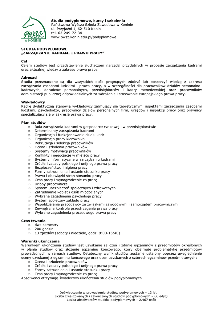 Studia podyplomowe, kursy i szkolenia Państwowa WyŜsza Szkoła Zawodowa w Koninie ul. Przyjaźni 1, 62-510 Konin tel. 63-249-72-34 www.pwsz.konin.edu.pl/podyplomowe STUDIA PODYPLOMOWE „ZARZĄDZANIE KADRAMI I PRAWO PRACY” Cel Celem studiów jest przedstawienie słuchaczom narzędzi przydatnych w procesie zarządzania kadrami oraz aktualnej wiedzy z zakresu prawa pracy. Adresaci Studia przeznaczone są dla wszystkich osób pragnących zdobyć lub poszerzyć wiedzę z zakresu zarządzania zasobami ludzkimi i prawa pracy, a w szczególności dla pracowników działów personalnokadrowych, doradców personalnych, przedsiębiorców i kadry menedŜerskiej oraz pracowników administracji publicznej odpowiedzialnych za wdraŜanie i stosowanie europejskiego prawa pracy. Wykładowcy Kadrę dydaktyczną stanowią wykładowcy zajmujący się teoretycznymi aspektami zarządzania zasobami ludzkimi, psycholodzy, pracownicy działów personalnych firm, urzędów i inspekcji pracy oraz prawnicy specjalizujący się w zakresie prawa pracy. Plan studiów • Rola zarządzania kadrami w gospodarce rynkowej i w przedsiębiorstwie • Determinanty zarządzania kadrami • Organizacja i funkcjonowanie działu kadr • Organizacja pracy kierownika • Rekrutacja i selekcja pracowników • Ocena i szkolenia pracowników • Systemy motywacji pracowników • Konflikty i negocjacje w miejscu pracy • Systemy informatyczne w zarządzaniu kadrami • Źródła i zasady polskiego i unijnego prawa pracy • Bezpieczeństwo i higiena pracy • Formy zatrudnienia i ustanie stosunku pracy • Prawa i obowiązki stron stosunku pracy • Czas pracy i wynagrodzenie za pracę • Urlopy pracownicze • System ubezpieczeń społecznych i zdrowotnych • Zatrudnianie kobiet i osób młodocianych • Wybrane zagadnienia psychologii pracy • System społeczny zakładu pracy • Współdziałanie pracodawcy ze związkami zawodowymi i samorządem pracowniczym • Zewnętrzna kontrola przestrzegania prawa pracy • Wybrane zagadnienia procesowego prawa pracy Czas trwania • dwa semestry • 200 godzin • 13 zjazdów (soboty i niedziele, godz. 9:00-15:40) Warunki ukończenia Warunkiem ukończenia studiów jest uzyskanie zaliczeń i zdanie egzaminów z przedmiotów określonych w planie studiów oraz złoŜenie egzaminu końcowego, który obejmuje problematykę przedmiotów prowadzonych w ramach studiów. Ostateczny wynik studiów zostanie ustalony poprzez uwzględnienie oceny uzyskanej z egzaminu końcowego oraz ocen uzyskanych z czterech egzaminów przedmiotowych: • Ocena i szkolenie pracowników • Źródła i zasady polskiego i unijnego prawa pracy • Formy zatrudnienia i ustanie stosunku pracy • Czas pracy i wynagrodzenie za pracę Absolwenci otrzymają świadectwo ukończenia studiów podyplomowych. Doświadczenie w prowadzeniu studiów podyplomowych – 13 lat Liczba zrealizowanych i zakończonych studiów podyplomowych – 66 edycji Liczba absolwentów studiów podyplomowych – 2.467 osób Studia podyplomowe, kursy i szkolenia Państwowa WyŜsza Szkoła Zawodowa w Koninie ul. Przyjaźni 1, 62-510 Konin tel. 63-249-72-34 www.pwsz.konin.edu.pl/podyplomowe Koszt uczestnictwa około 1500 zł/semestr Słuchacze mają moŜliwość uczestniczenia w bezpłatnych zajęciach z zakresu zarządzania zasobami ludzkimi prowadzonych w języku angielskim. Doświadczenie w prowadzeniu studiów podyplomowych – 13 lat Liczba zrealizowanych i zakończonych studiów podyplomowych – 66 edycji Liczba absolwentów studiów podyplomowych – 2.467 osób