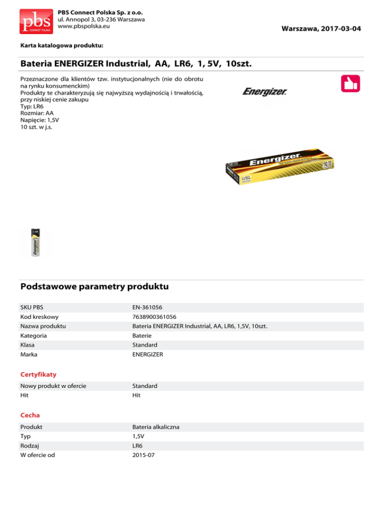 PBS Connect Polska Sp. z o.o. ul. Annopol 3, 03-236 Warszawa www.pbspolska.eu Karta katalogowa produktu: Bateria ENERGIZER Industrial, AA, LR6, 1, 5V, 10szt. Przeznaczone dla klientów tzw. instytucjonalnych (nie do obrotu na rynku konsumenckim) Produkty te charakteryzują się najwyższą wydajnością i trwałością, przy niskiej cenie zakupu Typ: LR6 Rozmiar: AA Napięcie: 1,5V 10 szt. w j.s. Podstawowe parametry produktu SKU PBS EN-361056 Kod kreskowy 7638900361056 Nazwa produktu Bateria ENERGIZER Industrial, AA, LR6, 1,5V, 10szt. Kategoria Baterie Klasa Standard Marka ENERGIZER Certyfikaty Nowy produkt w ofercie Standard Hit Hit Cecha Produkt Bateria alkaliczna Typ 1,5V Rodzaj LR6 W ofercie od 2015-07 Warszawa, 2017-03-04 PBS Connect Polska Sp. z o.o. ul. Annopol 3, 03-236 Warszawa www.pbspolska.eu Warszawa, 2017-03-04 Karta katalogowa produktu cd. Bateria ENERGIZER Industrial, AA, LR6, 1, 5V, 10szt. Podstawowe parametry produktu Wymiary Rozmiar AA Wymiary (mm) Średnica: 14,5 wysokość: 50,5 Wspólny słownik zamówień CPV 31411000-0 Jednostki logistyczne Opakowanie 1 6 op Opakowanie 2 12 op Opakowanie 3 3744 op