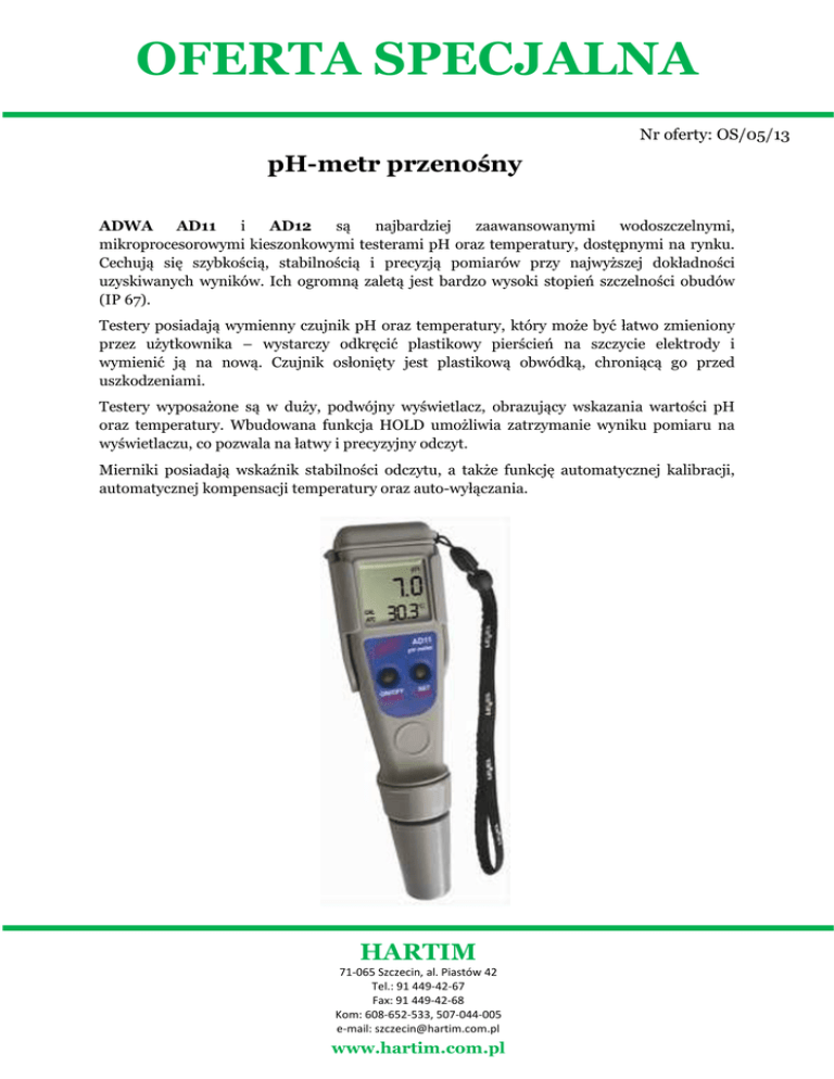 OFERTA SPECJALNA Nr oferty: OS/05/13 pH-metr przenośny ADWA AD11 i AD12 są najbardziej zaawansowanymi wodoszczelnymi, mikroprocesorowymi kieszonkowymi testerami pH oraz temperatury, dostępnymi na rynku. Cechują się szybkością, stabilnością i precyzją pomiarów przy najwyższej dokładności uzyskiwanych wyników. Ich ogromną zaletą jest bardzo wysoki stopień szczelności obudów (IP 67). Testery posiadają wymienny czujnik pH oraz temperatury, który może być łatwo zmieniony przez użytkownika – wystarczy odkręcić plastikowy pierścień na szczycie elektrody i wymienić ją na nową. Czujnik osłonięty jest plastikową obwódką, chroniącą go przed uszkodzeniami. Testery wyposażone są w duży, podwójny wyświetlacz, obrazujący wskazania wartości pH oraz temperatury. Wbudowana funkcja HOLD umożliwia zatrzymanie wyniku pomiaru na wyświetlaczu, co pozwala na łatwy i precyzyjny odczyt. Mierniki posiadają wskaźnik stabilności odczytu, a także funkcję automatycznej kalibracji, automatycznej kompensacji temperatury oraz auto-wyłączania. HARTIM 71-065 Szczecin, al. Piastów 42 Tel.: 91 449-42-67 Fax: 91 449-42-68 Kom: 608-652-533, 507-044-005 e-mail: [email protected] www.hartim.com.pl OFERTA SPECJALNA Nr oferty: OS/05/13 Parametry techniczne: Zakres Dokładność Rozdzielczość Kalibracja Kompensacja temperatury Warunki pomiaru Zasilanie AD11 -2,0÷16,0 pH AD12 -2,00÷16,00 pH 5,0÷60,0°C 5,0÷60,0°C 23,0÷140,0 F 23,0÷140,0 F ±0.1 pH ±0.01 pH ±0.5°C ±0.5°C ±1 F ±1 F ±0.1 pH ±0.01 pH 0.1°C 0.1°C 0.1 F 0.1 F automatyczna, automatyczna, 1 lub 2 punktowa 1 lub 2 punktowa automatyczna, automatyczna, zakres -5÷60°C zakres -5÷60°C temperatura -5÷50°C, temperatura -5÷50°C, wilgotność do 100% wilgotność do 100% baterie 4 x 1,5 V, baterie 4 x 1,5 V, żywotne do 300 h żywotne do 300 h WARUNKI OFERTY: • termin dostawy: do 7 dni • koszt transportu: indywidualnie ustalany • ważność oferty: do odwołania • w przypadku zamówienia proszę powołać się na nr oferty Informacji na temat produktów udzielają handlowcy: Daniel Musik, [email protected], tel. 608 652 533 Michał Kowalski, [email protected], tel. 507 044 005 HARTIM 71-065 Szczecin, al. Piastów 42 Tel.: 91 449-42-67 Fax: 91 449-42-68 Kom: 608-652-533, 507-044-005 e-mail: [email protected] www.hartim.com.pl