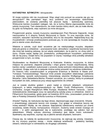KATARZYNA SZYMCZYK / skrzypaczka W mojej rodzinie nikt nie muzykował. Więc skąd mój pomysł na uczenie się gry na skrzypcach? Nie pamiętam tego, lecz podobno od wczesnego dzieciństwa planowałam, że zostanę pianistką lub jeszcze lepiej - śpiewaczką operową. Widocznie bardzo musiałam nalegać, tak, że w końcu Mama zaprowadziła mnie do szkoły muzycznej. Tam stwierdzono, że mam bardzo dobry słuch, ale za małe dłonie, by grać na fortepianie, więc wybrano za mnie skrzypce. Przyjemność grania, rozwój muzyczny zawdzięczam Pani Renacie Gajownik, mojej nauczycielce w II stopniu Szkoły Muzycznej w Opolu. To ona nauczyła mnie, że owszem, warsztat i technika są potrzebne, lecz to nie wszystko. Najbardziej liczy się muzykalność i emocje przekazywane podczas gry, to one sprawiają że muzyka żyje, jest w stanie urzec słuchacza. Właśnie w szkole, czyli dość wcześnie jak na niedojrzałego muzyka, złapałam bakcyla grania w orkiestrze – poznawanie ludzi, atmosfera i wspólnota tworzenia były dla mnie tak świetną zabawą, że już wtedy wiedziałam, że to jest to, co chcę robić w życiu. Chyba nadal, będąc już, powiedzmy, profesjonalnym muzykiem, podchodzę tak do tej pracy. Dzięki temu nie popadam w rutynę i każdego dnia potrafię odnaleźć przyjemność w tym, co robię. Studiowałam na Akademii Muzycznej w Krakowie. Kraków, muzycznie, to dobre miejsce na poznanie, złapanie potrzeby i chęci grania muzyki współczesnej, którą bardzo cenię i uwielbiam wykonywać z powodu dużej wolności interpretacji, jaką daje muzykowi. Grając solo lub w zespole można sobie pozwolić na odrobinę szaleństwa. Po trzecim roku uczestniczyłam w programie Erasmus w Berlinie w klasie prof. Tomasza Tomaszewskiego. Nauczył mnie przede wszystkim właściwego patrzenia na stylistykę, sposób wykonywania, interpretację utworów Wolfganga Amadeusza Mozarta i Jana Sebastiana Bacha. Powiem szczerze, że z wiedzy, którą mi przekazał korzystam do dziś, zwłaszcza przy okazji egzaminów do orkiestr. Już w czasie studiów grałam i gram nadal w różnych składach, orkiestrach krajowych, a także międzynarodowych np. Baltic Youth Philharmonic, I’Culture Orchestra, Junges Klangforum Mitte Europa, Akademia Sinfonii Varsovia - cenne doświadczenia otwierające oczy na specyficzną sztukę pracy w orkiestrze. Zanim w Filharmonii Gorzowskiej, gdzie gram od kwietnia 2015 roku, pracowałam ponad dwa lata w Polskiej Orkiestrze Sinfonia Iuventus w Warszawie. Artysta? Sądzę, że nadużywa się tego słowa, deprecjonując jego znaczenie. Artysta z prawdziwego zdarzenia tworzy coś nowego. Czy grając w orkiestrze tworzy się nową wartość? Myślę, że nie zawsze. Najczęściej odtwarzamy wartości już znane wcześniej, dzieło Artysty, kompozytora. Owszem, możemy wiele wnieść nowego od siebie – w pełni zaangażować się w wykonanie, poddając się całości, być jej składnikiem. Wtedy sukces zbiorowy (orkiestry) jest także moim sukcesem. Spełniamy się wspólnie, czyniąc się w jakimś sensie artystami, twórcami. Cieszę się, że należę do społeczności muzycznej, że zajmuję się sztuką. Uważam, że my muzycy poprzez swoją – może większą wrażliwość - jesteśmy bardziej otwarci, tolerancyjni w odniesieniu do drugiego człowieka.