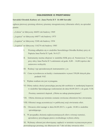 OGŁOSZENIE O PRZETARGU Suwalski Ośrodek Kultury ul : Jana Pawła II 5 16-400 Suwałki ogłasza pierwszy przetarg ofertowy pisemny nieograniczony (zbieranie ofert), na sprzedaż pianin: - „Calisia” nr fabryczny 46693 rok budowy 1969 - „Legnica” nr fabryczny 64077 rok budowy 1975 - „Legnica” nr fabryczny 3248 rok budowy 1954 - „Legnica” nr fabryczny 116274 rok budowy 1985 I. Przetarg odbędzie się w siedzibie Suwalskiego Ośrodka Kultury przy ul. Papieża Jana Pawła II 5 pok. Nr 0.27. II. Instrumenty można obejrzeć w siedzibie SOK przy ul. Noniewicza 71 oraz przy ulicy Jana Pawła II 5 codziennie od godz. 8,00 – 14,00 (oprócz dni ustawowo wolnych). III. Rodzaj i typ sprzedawanych instrumentów: j.w. IV. Cena wywoławcza za każdy z instrumentów wynosi 350,00 złotych plus podatek VAT. V. Wpłata wadium nie jest wymagana. VI. Oferty należy złożyć przesyłając pocztą lub osobiście w zamkniętej kopercie w siedzibie Sprzedającego (sekretariat) do dnia 04.09.2015 r. do godz. 9.30. Prosimy zamieścić dopisek „Oferta na zakup pianina/pianin”. VII. Oferta złożona po terminie zostanie zwrócona oferentowi bez otwierania. VIII. Oferenci mogą uczestniczyć w publicznej sesji otwierania ofert. IX. Otwarcie ofert nastąpi w dniu 04.09.2015 r. o godz. 10.00 w siedzibie sprzedającego. X. W przypadku złożenia najkorzystniejszych ofert o równej wartości, sprzedawcy przysługuje prawo swobodnego wyboru oferty. XI. Wybrany oferent jest obowiązany zapłacić w terminie wyznaczonym przez prowadzącego przetarg, nie dłuższym niż 7 dni od daty otwarcia ofert.