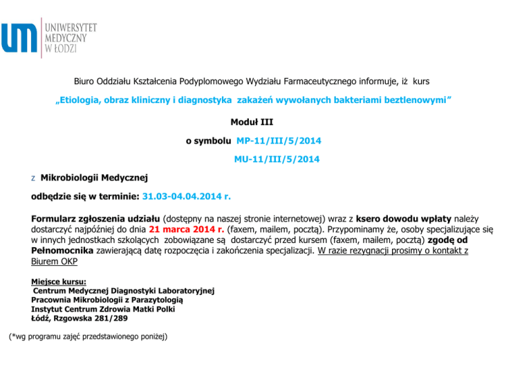Biuro Oddziału Kształcenia Podyplomowego Wydziału Farmaceutycznego informuje, iż kurs „Etiologia, obraz kliniczny i diagnostyka zakażeń wywołanych bakteriami beztlenowymi” Moduł III o symbolu MP-11/III/5/2014 MU-11/III/5/2014 z Mikrobiologii Medycznej odbędzie się w terminie: 31.03-04.04.2014 r. Formularz zgłoszenia udziału (dostępny na naszej stronie internetowej) wraz z ksero dowodu wpłaty należy dostarczyć najpóźniej do dnia 21 marca 2014 r. (faxem, mailem, pocztą). Przypominamy że, osoby specjalizujące się w innych jednostkach szkolących zobowiązane są dostarczyć przed kursem (faxem, mailem, pocztą) zgodę od Pełnomocnika zawierającą datę rozpoczęcia i zakończenia specjalizacji. W razie rezygnacji prosimy o kontakt z Biurem OKP Miejsce kursu: Centrum Medycznej Diagnostyki Laboratoryjnej Pracownia Mikrobiologii z Parazytologią Instytut Centrum Zdrowia Matki Polki Łódź, Rzgowska 281/289 (*wg programu zajęć przedstawionego poniżej) UWAGA SPECJALIZUJĄCY! Koszt kursu: 550,00 zł Opłaty winny być wpłacane wyłącznie na konto: Uniwersytet Medyczny, Al. Kościuszki 4, 90-419 Łódź, ING BANK ŚLĄSKI ŁÓDŹ UWAGA NOWY NUMER KONTA : 30 1050 0099 6364 1111 1111 1111 KONIECZNIE : w rubryce tytułem należy podać symbol kursu oraz dopisek 708-04- 078 Prosimy o dokładne i czytelne wypełnienie formularza, włącznie z aktualnym numerem telefonu, datą i podpisem – umożliwi to szybkie przekazanie informacji w przypadku wszelkich zmian. W przypadku rezygnacji z udziału w szkoleniu prosimy o niezwłoczne zawiadomienie o tym pracowników Biuro Oddziału Kształcenia Podyplomowego. Osoby zainteresowane otrzymaniem FAKTURY wystawionej przez UM dla podmiotu gospodarczego opłacającego szkolenie powinny wypełnić druk przelewu/ wpłaty gotówkowej podając w rubryce nazwa zleceniodawcy- nazwę i adres podmiotu gospodarczego, a w rubryce tytułem dodatkowo obok w/w : nazwisko i imię kursanta. Osoby fizyczne wypełniają druk podając swoje dane, a jeśli chcą otrzymać fakturę w rubryce tytułem obok symbolu kursu i dopisku 708-04- 078 zamieszczają dopisek Faktura. Podstawą do wystawienia faktury jest druk wpłaty (nie formularz zgłoszeniowy). Prawidłowo wypełniony druk wpłaty powinien zawierać wszystkie powyżej podane dane. Nazwa wpisanego podmiotu gospodarczego na druku wpłaty musi być zgodna z danymi na formularzu zgłoszenia. Na druku wpłaty nie ma konieczności wpisywania NIP. 31.03.2014 01.04.2014 02.04.2014 03.04.2014 04.04.2014 RAMOWY PROGRAM ZAJĘĆ Wykłady Ćwiczenia(w dwóch grupach 10-osobowych (4x5osób) 08:30-10:00 Wykład inauguracyjny: Bakterie beztlenowe „przyjaciel” czy „wróg” człowieka 13:00-14:30 14:30-16.00 Podłoża do transportu i posiewów materiałów. Systemy do hodowli bakterii beztlenowych. Posiewy bezpośrednie materiałów klinicznych. 10:00-11:30 Epidemiologia zakażeń bakteriami beztlenowymi 11:30-13:00 Pobieranie, transport i zasady posiewów materiałów w kierunku bakterii beztlenowych. Schemat badania w kierunku bakterii beztlenowych 08:30-10:00 Zakażenia bakteriami beztlenowymi w praktyce klinicznej 13:00-14:30 14:30-16.00 Wykonanie odczytów posiewów bezpośrednich. Izolacja/ namnażanie bakterii do testów identyfikacji. Preparaty mikroskopowe 10:00-11:30 Zakażenia, podstawy patogenności i diagnostyka bakterii beztlenowych nieprzetrwalnikujacych 11:30-13:00 Zakażenia, podstawy patogenności i diagnostyka bakterii beztlenowych przetrwalnikujących innych niż Clostridium difficile 08:30-10:00 Clostridium difficile – epidemiologia, diagnostyka, postępowanie 13:00-14:30 10:00-11:30 Techniki biologii molekularnej w diagnostyce bakterii beztlenowych 11:30-13:00 Zasady identyfikacji bakterii beztlenowych 08:30-10:00 Choroby przyzębia wywołane przez bakterie beztlenowe Terapia zakażeń bakteriami beztlenowymi 10:00-11:30 Oporność na leki wśród bakterii beztlenowych 11:30-12:15 Genetyczne podstawy oporności na leki bakterii beztlenowych 12:15-13:00 Metody oceny lekowrażliwości drobnoustrojów beztlenowych. 08:30-10:00 Zasady interpretacji posiewów w kierunku bakterii beztlenowych. 13:00-14:30 14:30-16.00 10:00-11:30 Bakterie beztlenowe jako broń biologiczna i probiotyki 11:30-13:00 Podsumowanie 14:30-16.00 Nastawianie testów identyfikacyjnych Namnażanie bakterii do testów lekowrażliwości, Nastawianie testów Vitec Oznaczanie toksyn C.difficile w kale 13:00-14:30 14:30-16.00 Nastawianie testów lekowrażliwości i testów oceniających mechanizmy oporności. 16.00-17.30 Odczyty testów lekowrażliwości. Interpretacja kliniczna wyników posiewów. Kolokwium *BOKPWF zastrzega iż program może ulec zmianie