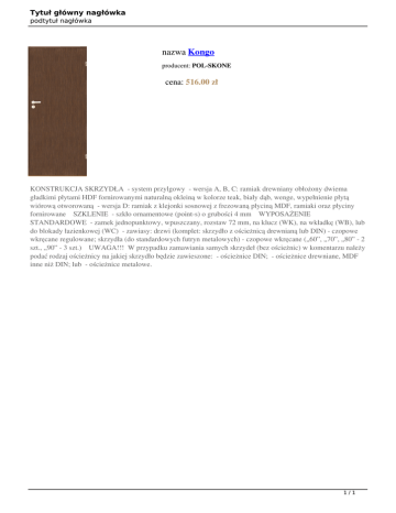 Tytuł główny nagłówka podtytuł nagłówka nazwa Kongo producent: POL-SKONE cena: 516.00 zł KONSTRUKCJA SKRZYDŁA - system przylgowy - wersja A, B, C: ramiak drewniany obłożony dwiema gładkimi płytami HDF fornirowanymi naturalną okleiną w kolorze teak, biały dąb, wenge, wypełnienie płytą wiórową otworowaną - wersja D: ramiak z klejonki sosnowej z frezowaną płyciną MDF, ramiaki oraz płyciny fornirowane SZKLENIE - szkło ornamentowe (point-s) o grubości 4 mm WYPOSAŻENIE STANDARDOWE - zamek jednopunktowy, wpuszczany, rozstaw 72 mm, na klucz (WK), na wkładkę (WB), lub do blokady łazienkowej (WC) - zawiasy: drzwi (komplet: skrzydło z ościeżnicą drewnianą lub DIN) - czopowe wkręcane regulowane; skrzydła (do standardowych futryn metalowych) - czopowe wkręcane („60”, „70”, „80” - 2 szt., „90” - 3 szt.) UWAGA!!! W przypadku zamawiania samych skrzydeł (bez ościeżnic) w komentarzu należy podać rodzaj ościeżnicy na jakiej skrzydło będzie zawieszone: - ościeżnice DIN; - ościeżnice drewniane, MDF inne niż DIN; lub - ościeżnice metalowe. 1/1