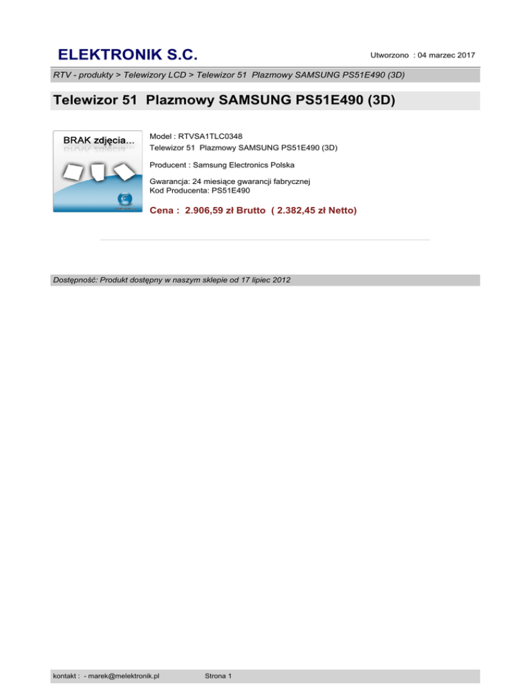 ELEKTRONIK S.C. Utworzono : 04 marzec 2017 RTV - produkty > Telewizory LCD > Telewizor 51 Plazmowy SAMSUNG PS51E490 (3D) Telewizor 51 Plazmowy SAMSUNG PS51E490 (3D) Model : RTVSA1TLC0348 Telewizor 51 Plazmowy SAMSUNG PS51E490 (3D) Producent : Samsung Electronics Polska Gwarancja: 24 miesiące gwarancji fabrycznej Kod Producenta: PS51E490 Cena : 2.906,59 zł Brutto ( 2.382,45 zł Netto) Dostępność: Produkt dostępny w naszym sklepie od 17 lipiec 2012 kontakt : - [email protected] Strona 1