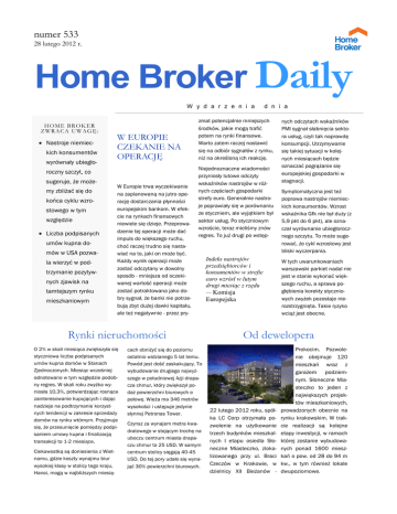 numer 533 28 lutego 2012 r. Home Broker Daily W y d a r z e n i a HOME BROKER ZWRACA UWAGĘ: Nastroje niemieckich konsumentów wyrównały ubiegło- W EUROPIE CZEKANIE NA OPERACJĘ roczny szczyt, co sugeruje, że możemy zbliżać się do końca cyklu wzrostowego w tym względzie Liczba podpisanych umów kupna domów w USA pozwala wierzyć w podtrzymanie pozytywnych zjawisk na tamtejszym rynku mieszkaniowym W Europie trwa wyczekiwanie na zaplanowaną na jutro operację dostarczania płynności europejskim bankom. W efekcie na rynkach finansowych niewiele się dzieje. Przeprowadzenie tej operacji może dać impuls do większego ruchu, choć raczej trudno się nastawiać na to, jaki on może być. Każdy wynik operacji może zostać odczytany w dowolny sposób - mniejsza od oczekiwanej wartość operacji może zostać potraktowana jako dobry sygnał, że banki nie potrzebują zbyt dużej dawki kapitału, ale też negatywnie - przez pry- zmat potencjalnie mniejszych środków, jakie mogą trafić potem na rynki finansowe. Warto zatem raczej nastawić się na odbiór sygnałów z rynku, niż na określoną ich reakcję. Niejednoznaczne wiadomości przyniosły lutowe odczyty wskaźników nastrojów w różnych częściach gospodarki strefy euro. Generalnie nastroje poprawiały się w porównaniu ze styczniem, ale wyjątkiem był sektor usług. Po styczniowym wzroście, teraz mieliśmy znów regres. To już drugi po wstęp- Rynki nieruchomości O 2% w skali miesiąca zwiększyła się styczniowa liczba podpisanych umów kupna domów w Stanach Zjednoczonych. Miesiąc wcześniej odnotowano w tym względzie podobny regres. W skali roku zwyżka wyniosła 10,3%, potwierdzając rosnące zainteresowanie kupujących i dając nadzieje na podtrzymanie korzystnych tendencji w zakresie sprzedaży domów na rynku wtórnym. Przyjmuje się, że przesunięcie pomiędzy podpisaniem umowy kupna i finalizacją transakcji to 1-2 miesiące. Ciekawostką są doniesienia z Wietnamu, gdzie koszty wynajmu biur wysokiej klasy w stolicy tego kraju, Hanoi, mogą w najbliższych miesią- d n i a cach obniżyć się do poziomu ostatnio widzianego 5 lat temu. Powód jest dość zaskakujący. To wybudowanie drugiego najwyższego w południowej Azji drapacza chmur, który zwiększył podaż powierzchni biurowych o połowę. Wieża ma 346 metrów wysokości i ustępuje jedynie słynnej Petronas Tower. Czynsz za wynajem metra kwadratowego w stojącym trochę na uboczu centrum miasta drapaczu chmur to 25 USD. W samym centrum stolicy sięgają 40-45 USD. Do tej pory udało się wynająć 30% powierzchni biurowych. Indeks nastrojów przedsiębiorców i konsumentów w strefie euro wzrósł w lutym drugi miesiąc z rzędu — Komisja Europejska nych odczytach wskaźników PMI sygnał słabnięcia sektora usług, czyli tak naprawdę konsumpcji. Utrzymywanie się takiej sytuacji w kolejnych miesiącach będzie oznaczać pogrążanie się europejskiej gospodarki w stagnacji. Symptomatyczna jest też poprawa nastrojów niemieckich konsumentów. Wzrost wskaźnika Gfk nie był duży (z 5,9 pkt do 6 pkt), ale oznaczał wyrównanie ubiegłorocznego szczytu. To może sugerować, że cykl wzrostowy jest bliski wyczerpania. W tych uwarunkowaniach warszawski parkiet nadal nie jest w stanie wykonać większego ruchu, a sprawa pogłębienia korekty styczniowych zwyżek pozostaje nierozstrzygnięta. Takie ryzyko wciąż jest obecne. Od dewelopera 22 lutego 2012 roku, spółka LC Corp otrzymała pozwolenie na użytkowanie trzech budynków mieszkalnych I etapu osiedla Słoneczne Miasteczko, zlokalizowanego przy ul. Braci Czeczów w Krakowie, w dzielnicy XII Bieżanów - Prokocim. Pozwolenie obejmuje 120 mieszkań wraz z garażem podziemnym. Słoneczne Miasteczko to jeden z największych projektów mieszkaniowych, prowadzonych obecnie na rynku krakowskim. W trakcie realizacji są kolejne etapy inwestycji, w ramach której zostanie wybudowanych ponad 1600 mieszkań o pow. od 28 do 94 m kw., w tym również lokale dwupoziomowe.