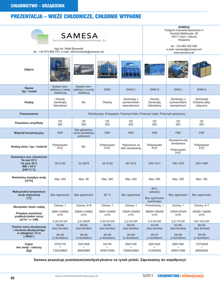 CHŁODNICTWO – URZĄDZENIA prezentacja – wieże chłodnicze, chłodnie wyparne SAMESA Poligono Industrial Bankunion II Avenida Metalurgia, 28 33211 Gijon / Asturia Hiszpania tel .:+34 985 352 626 e-mail: [email protected] www.samesa.net mgr inż. Rafał Borowiak tel.: +34 673 858 373, e-mail: [email protected] Zdjęcie Nazwa Typ / model System kompaktowy z wieżą chłodniczą System kompaktowy z suchą chłodnicą EWK EWK-C EWK-D EWK-I EWK-A Rodzaj Otwarty Zamknięty Hybrydowy Nd. Otwarty Zamknięty z wymiennikiem wewnętrznym Otwarty Zamknięty Hybrydowy Zamknięty z wymiennikiem zewnętrznym Zamknięta Chłodnia adiabatyczna Przeznaczenie Klimatyzacja, Energetyka, Przemysł lekki, Przemysł ciężki, Przemysł spożywczy Posiadane certyfikaty CE ISO CE ISO CE ISO CE ISO CE ISO CE ISO CE ISO Materiał konstrukcyjny FRP Stal galwanizowana powlekana polimerem FRP FRP FRP FRP FRP Rodzaj złoża / typ / materiał Polipropylen PVC Nd. Polipropylen PVC Wężownica ze stali nierdzewnej Polipropylen PVC Nominalna moc chłodnicza/ Tw zas 35°C Tw pow 30°C WB = 24°C [kW/°C/°C] 35÷3150 23÷2079 34÷3150 26÷1610 349÷1517 185÷1433 263÷1046 Nominalny przepływ wody [m3/h] Max. 540 Max. 56 Max. 540 Max. 325 Max. 540 Max. 325 Max. 160 Bez ograniczeń Bez ograniczeń Osiowy, 1 Osiowy, 2÷7 Maksymalna temperatura wody wejściowej [°C] Wentylator /ilość/ rodzaj Przepływ powietrza/ prędkośc/pobór mocy [m3/h / n / kW] Poziom mocy akustycznej / cisnienia akustycznego w odległości 15 m [ dB(A) ] Ciężar bez wody / roboczy [kg] 80°C (otwarty) Wymiennik-stal nierdzewna Polipropylen PVC Bez ograniczeń Bez ograniczeń 80 °C Bez ograniczeń Osiowy, 1 Osiowy, 2÷8 Osiowy, 1 Osiowy, 1 Bez ograniczeń (zamknięty) Promieniowy, 1 3900÷193500 m3/h 29200÷140800 m3/h 3900÷193500 m3/h 15500÷193500 m3/h 38500÷180400 m3/h 15500÷97500 m3/h 45000÷136000 m3/h 0,33÷22 kW 53÷64 (bez tłumika) 2,5÷20kW 56÷62 (bez tłumika) 0,33÷22 kW 53÷64 (bez tłumika) 2,2÷22 kW 60÷64 (bez tłumika) 4,3÷24 kW 52÷58 (bez tłumika) 2,2÷15 kW 53÷64 (bez tłumika) 5,6÷19,6 kW 56÷62 (bez tłumika) 48÷59 (z tłumikiem) 39÷45 (z tłumikiem) 48÷59 (z tłumikiem) 55÷59 (z tłumikiem) 40÷47 (z tłumikiem) 48÷59 (z tłumikiem) 39÷45 (z tłumikiem) 270/2170 ÷ 7320/29920 532/1659 ÷ 3660/9860 53/145 ÷ 3400/13000 650/1190 ÷ 10200/23820 620/1620 ÷ 2100/5500 800/1350 ÷ 4800/11900 1127/2040 ÷ 3693/6930 Samesa poszukuje przedstawiciela/dystrybutora na rynek polski. Zapraszamy do współpracy! 80 Polipropylen PVC www.chlodnictwoiklimatyzacja.pl 5/2011