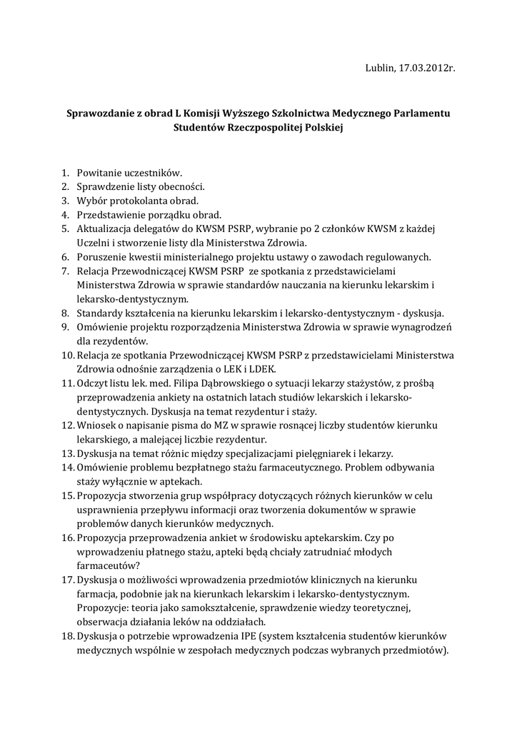 Lublin, 17.03.2012r. Sprawozdanie z obrad L Komisji Wyższego Szkolnictwa Medycznego Parlamentu Studentów Rzeczpospolitej Polskiej 1. 2. 3. 4. 5. Powitanie uczestników. Sprawdzenie listy obecności. Wybór protokolanta obrad. Przedstawienie porządku obrad. Aktualizacja delegatów do KWSM PSRP, wybranie po 2 członków KWSM z każdej Uczelni i stworzenie listy dla Ministerstwa Zdrowia. 6. Poruszenie kwestii ministerialnego projektu ustawy o zawodach regulowanych. 7. Relacja Przewodniczącej KWSM PSRP ze spotkania z przedstawicielami Ministerstwa Zdrowia w sprawie standardów nauczania na kierunku lekarskim i lekarsko-dentystycznym. 8. Standardy kształcenia na kierunku lekarskim i lekarsko-dentystycznym - dyskusja. 9. Omówienie projektu rozporządzenia Ministerstwa Zdrowia w sprawie wynagrodzeń dla rezydentów. 10. Relacja ze spotkania Przewodniczącej KWSM PSRP z przedstawicielami Ministerstwa Zdrowia odnośnie zarządzenia o LEK i LDEK. 11. Odczyt listu lek. med. Filipa Dąbrowskiego o sytuacji lekarzy stażystów, z prośbą przeprowadzenia ankiety na ostatnich latach studiów lekarskich i lekarskodentystycznych. Dyskusja na temat rezydentur i staży. 12. Wniosek o napisanie pisma do MZ w sprawie rosnącej liczby studentów kierunku lekarskiego, a malejącej liczbie rezydentur. 13. Dyskusja na temat różnic między specjalizacjami pielęgniarek i lekarzy. 14. Omówienie problemu bezpłatnego stażu farmaceutycznego. Problem odbywania staży wyłącznie w aptekach. 15. Propozycja stworzenia grup współpracy dotyczących różnych kierunków w celu usprawnienia przepływu informacji oraz tworzenia dokumentów w sprawie problemów danych kierunków medycznych. 16. Propozycja przeprowadzenia ankiet w środowisku aptekarskim. Czy po wprowadzeniu płatnego stażu, apteki będą chciały zatrudniać młodych farmaceutów? 17. Dyskusja o możliwości wprowadzenia przedmiotów klinicznych na kierunku farmacja, podobnie jak na kierunkach lekarskim i lekarsko-dentystycznym. Propozycje: teoria jako samokształcenie, sprawdzenie wiedzy teoretycznej, obserwacja działania leków na oddziałach. 18. Dyskusja o potrzebie wprowadzenia IPE (system kształcenia studentów kierunków medycznych wspólnie w zespołach medycznych podczas wybranych przedmiotów). 19. Propozycja stworzenia zespołu składającego się z członków KWSM oraz członków Młodej Farmacji, który będzie zajmował się próbą zmiany systemu kształcenia na kierunku farmacja. 20. Propozycja wprowadzenia ulg dla pracodawców zatrudniających osoby, które ukończyły staż farmaceutyczny. 21. Problem masowego zatrudniania techników farmacji. 22. Sprawa możliwości przyznawania stypendium dla studentów poprzez samorządy terytorialne. 23. Problem punktów ECTS przyznawanych za staż farmaceutyczny, propozycja przeniesienia tych punktów na inne przedmioty, eliminując problem uzyskania prawidłowej ilości punktów wymaganych do ukończenia studiów w przypadku kiedy staż nie byłby wliczany w okres studiów. 24. Problem konieczności ponownego odbywania bezpłatnego stażu przez farmaceutów po dłuższym okresie braku kontaktu z zawodem. 25. Problem istnienia ustawy o izbach aptekarskich, zamiast ustawy o zawodzie farmaceuty, trudności w odszukiwaniu aktów prawnych dotyczących kierunku farmacja. 26. Propozycja dodania zakładki lub podstrony na stronie PSRP odnośnie KWSM, zamiast grupy w celu udostępniania i ułatwienia odszukiwania konkretnych dokumentów. 1. 2. 3. 4. 5. 6. 7. 8. Druga część obrad (wraz z zaproszonymi gośćmi) Powitanie. Przedstawienie gości. Odczytanie maila od byłego członka KWSM PSRP. Prezentacja zdjęć z poprzednich zjazdów KWSM PSRP. Rozmowy nad zmianą kanału przepływu informacji. Propozycje forum, grupa mailowa, podstrona, chmura. Jednomyślne przegłosowanie założenia forum oraz droboxa, z zastrzeżeniem tymczasowego kontynuowania działania grupy mailingowej. Przyjęcie 3 zaległych protokołów z poprzednich zebrań. Zaproszenie do Łodzi na najbliższą konferencje. Zakończenie.