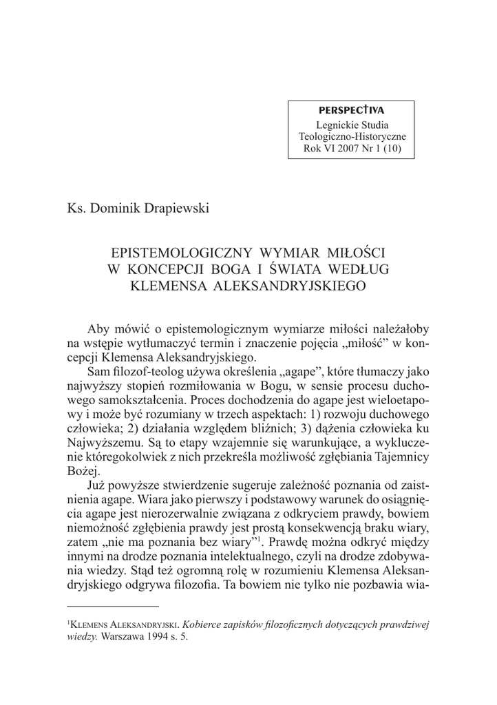 42 KS. DOMINIK DRAPIEWSKI † PERSPECTIVA Legnickie Studia Teologiczno-Historyczne Rok VI 2007 Nr 1 (10) Ks. Dominik Drapiewski EPISTEMOLOGICZNY WYMIAR MIŁOŚCI W KONCEPCJI BOGA I ŚWIATA WEDŁUG KLEMENSA ALEKSANDRYJSKIEGO Aby mówić o epistemologicznym wymiarze miłości należałoby na wstępie wytłumaczyć termin i znaczenie pojęcia „miłość” w koncepcji Klemensa Aleksandryjskiego. Sam filozof-teolog używa określenia „agape”, które tłumaczy jako najwyższy stopień rozmiłowania w Bogu, w sensie procesu duchowego samokształcenia. Proces dochodzenia do agape jest wieloetapowy i może być rozumiany w trzech aspektach: 1) rozwoju duchowego człowieka; 2) działania względem bliźnich; 3) dążenia człowieka ku Najwyższemu. Są to etapy wzajemnie się warunkujące, a wykluczenie któregokolwiek z nich przekreśla możliwość zgłębiania Tajemnicy Bożej. Już powyższe stwierdzenie sugeruje zależność poznania od zaistnienia agape. Wiara jako pierwszy i podstawowy warunek do osiągnięcia agape jest nierozerwalnie związana z odkryciem prawdy, bowiem niemożność zgłębienia prawdy jest prostą konsekwencją braku wiary, zatem „nie ma poznania bez wiary”1. Prawdę można odkryć między innymi na drodze poznania intelektualnego, czyli na drodze zdobywania wiedzy. Stąd też ogromną rolę w rozumieniu Klemensa Aleksandryjskiego odgrywa filozofia. Ta bowiem nie tylko nie pozbawia wiaKLEMENS ALEKSANDRYJSKI. Kobierce zapisków filozoficznych dotyczących prawdziwej wiedzy. Warszawa 1994 s. 5. 1 Epistemologiczny wymiar miłości 43 ry, lecz dzięki niej człowiek uzyskuje zaprawę myślową w wykazaniu podstaw słuszności wiary. Refleksja filozoficzna zatem zmierza ku myśleniu o Najwyższej Prawdzie, wiara zaś – bezpośrednio ku Niej, bowiem „czym innym jest domysł, a czym innym, sama prawda”2. Praca intelektualna może przynieść efekty na bazie nauczania i ćwiczenia, z czego wnioskujemy, że cnotę mądrości można nabyć. Według Klemensa Aleksandryjskiego wykształcenie intelektualne stanowi doskonałą podbudowę wiedzy religijnej, a w konsekwencji również wiary. Wiedza oparta na dowodach ugruntowuje wiarę i pozwala uniknąć wszelkiej wątpliwości. Nie oznacza to, iż wiedza intelektualna gwarantuje odkrycie Tajemnicy Bożej. Przeciwnie, owo poznanie rozumowe musi być uzupełnione o czynnik moralny, a ściślej mówiąc o postępowanie zgodne z zasadami agape w stosunku do bliźnich. Niczym bowiem wydaje się być przyjęcie zasad chrześcijańskich bez praktycznego ich zastosowania wobec innych. Marną jest kontemplacja duchowa zdeprecjonowana wyłącznie do poziomu rozważań intelektualnych. Zatem życie rozumne w duchu agape to również bycie godnym i sprawiedliwym, unikanie uciech i błahych rozkoszy cielesnych3, te tylko przeszkadzają wierze i odciągają człowieka od kontemplacji duchowej. Zatem „poznanie nie ogranicza się tylko do sfery intelektualnej, lecz obejmuje całą osobowość człowieka, posiada ono charakter formujący, inspiruje myślenie i wpływa na sposób postępowania”4. Zdobywanie wiedzy filozoficznej, stanowiącej podstawę wiary oraz przestrzeganie Bożych przykazań nie wyczerpuje całości agape. Najważniejszym aspektem koncepcji poznania według Klemensa Aleksandryjskiego jest rozumienie poznania jako kontemplacji, czyli „oglądania Boga”5. Owo „oglądanie Pana” to pewna tajemnica, zjawisko duchowe zachodzące wewnątrz człowieka, coś, czego słowami oddać nie można, a co w pewnym sensie podobne jest do znaczenia słowa „widzenie”. Naturalnie nie jest to widzenie w sensie zmysłowym. Rozumieć je raczej należy jako swoistego rodzaju łączność między Bogiem i czło- Tamże. s. 25. Tamże. s. 55. „Ofiarą miłą Bogu jest oderwanie się od ciała i od jego namiętności, a przy tym takie, którego by się nie żałowało”. 4 J. GRZYWACZEWSKI. O kontemplacji w ujęciu św. Klemensa Aleksandryjskiego. 1993 s. 13. 5 Tamże. s. 10. 2 3 44 KS. DOMINIK DRAPIEWSKI wiekiem. Jest to uwieńczenie wewnętrznego rozwoju człowieka, „znajdujące się na szczycie kolejno po sobie następujących przeobrażeń zbawczych”6. Z powyższego należy wywnioskować, iż do „oglądania Pana” należy się odpowiednio przygotować. Klemens Aleksandryjski wyróżnia trzy etapy człowieczej drogi ku Najwyższemu: przyjęcie wiary, odczuwanie bojaźni Bożej oraz spełnianie się w agape. Przyjęcie wiary jest to pierwsza i zasadnicza zmiana zachodząca w duszy człowieka, związana z odrzuceniem pogaństwa i wstąpieniem na drogę kroczenia ku Panu. Odczuwanie bojaźni Bożej, jak tłumaczy Klemens Aleksandryjski, nie jest przejawem strachu przed Bogiem. Przeciwnie, bojaźń jest wyrazem wielkiej miłości i czci, i na niej to właśnie zasadza się relacja człowieka z Bogiem. Najdoskonalszym stopniem owej relacji jest spełnienie się człowieka w agape, które J. Grzywaczewski nazywa „kontemplacją” bądź też „łącznością z Bogiem”7. Jest to wznoszenie się duszy na coraz to wyższy poziom istnienia, aż ku mistycznemu „ujrzeniu Boga”. Niczym innym więc owa kontemplacja nie jest, jak zwróceniem „wzroku” ku Najwyższemu, przejawem miłości; jest to „widzenie oczami wiary, widzenie o charakterze ściśle duchowym, mistycznym”8, widzenie Boga w miłości. Owo „oglądanie Pana” absolutnie nie „dotyka” natury Boga. Człowiek nie poznaje istoty Boga, tak samo jak nie może o Nim orzekać. Wszystkie epitety i próby określenia Majestatu Stwórcy są niewłaściwe, nieadekwatne, bowiem nie orzekają o naturze Pana, ponieważ ta jest niepoznawalna dla człowieka9. Dzieje się tak dlatego, iż „unia” Boga i człowieka ma charakter łączności i przyjaźni. Nie oznacza to jednak, aby człowiek uczestniczył w doskonałości Boga na sposób substancjalny, tzn. aby był częścią owej doskonałości. Jedność między Bogiem i człowiekiem jest czymś w rodzaju 
