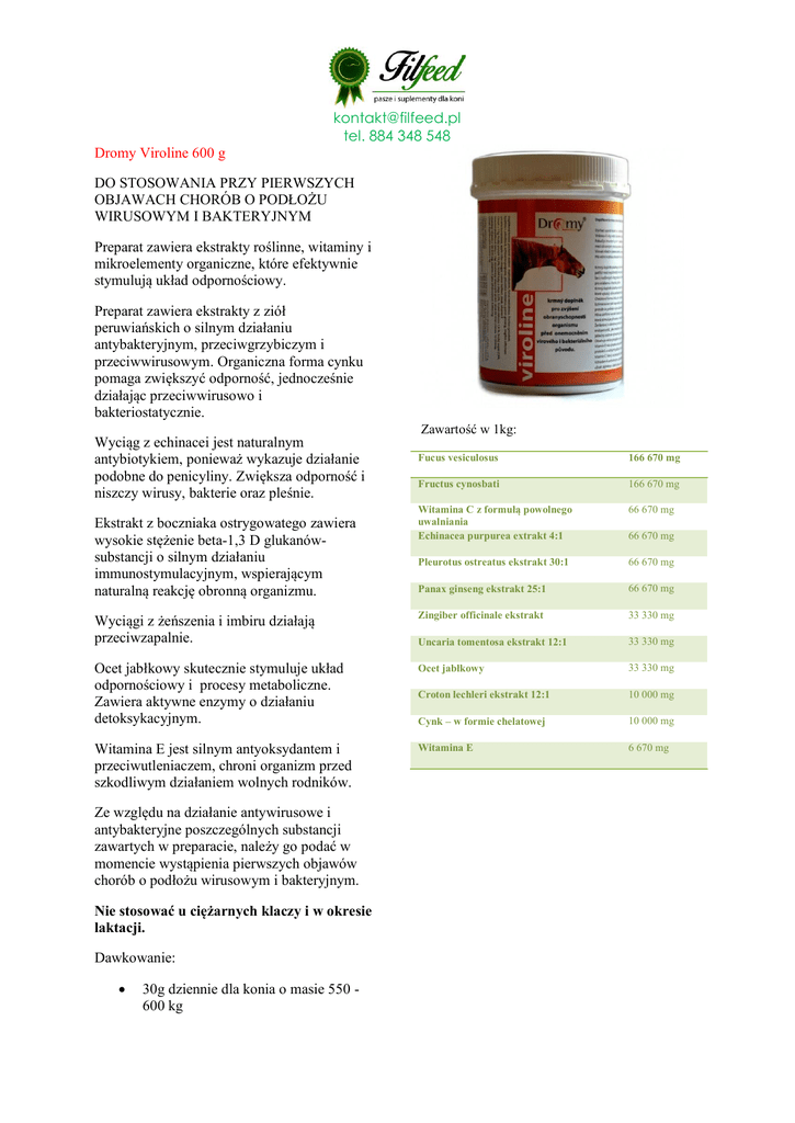 [email protected] tel. 884 348 548 Dromy Viroline 600 g DO STOSOWANIA PRZY PIERWSZYCH OBJAWACH CHORÓB O PODŁOŻU WIRUSOWYM I BAKTERYJNYM Preparat zawiera ekstrakty roślinne, witaminy i mikroelementy organiczne, które efektywnie stymulują układ odpornościowy. Preparat zawiera ekstrakty z ziół peruwiańskich o silnym działaniu antybakteryjnym, przeciwgrzybiczym i przeciwwirusowym. Organiczna forma cynku pomaga zwiększyć odporność, jednocześnie działając przeciwwirusowo i bakteriostatycznie. Wyciąg z echinacei jest naturalnym antybiotykiem, ponieważ wykazuje działanie podobne do penicyliny. Zwiększa odporność i niszczy wirusy, bakterie oraz pleśnie. Zawartość w 1kg: Fucus vesiculosus 166 670 mg Fructus cynosbati 166 670 mg Witamina C z formułą powolnego uwalniania Echinacea purpurea extrakt 4:1 66 670 mg Pleurotus ostreatus ekstrakt 30:1 66 670 mg Panax ginseng ekstrakt 25:1 66 670 mg Wyciągi z żeńszenia i imbiru działają przeciwzapalnie. Zingiber officinale ekstrakt 33 330 mg Uncaria tomentosa ekstrakt 12:1 33 330 mg Ocet jabłkowy skutecznie stymuluje układ odpornościowy i procesy metaboliczne. Zawiera aktywne enzymy o działaniu detoksykacyjnym. Ocet jabłkowy 33 330 mg Croton lechleri ekstrakt 12:1 10 000 mg Cynk – w formie chelatowej 10 000 mg Witamina E jest silnym antyoksydantem i przeciwutleniaczem, chroni organizm przed szkodliwym działaniem wolnych rodników. Witamina E 6 670 mg Ekstrakt z boczniaka ostrygowatego zawiera wysokie stężenie beta-1,3 D glukanówsubstancji o silnym działaniu immunostymulacyjnym, wspierającym naturalną reakcję obronną organizmu. Ze względu na działanie antywirusowe i antybakteryjne poszczególnych substancji zawartych w preparacie, należy go podać w momencie wystąpienia pierwszych objawów chorób o podłożu wirusowym i bakteryjnym. Nie stosować u ciężarnych klaczy i w okresie laktacji. Dawkowanie: 30g dziennie dla konia o masie 550 600 kg 66 670 mg