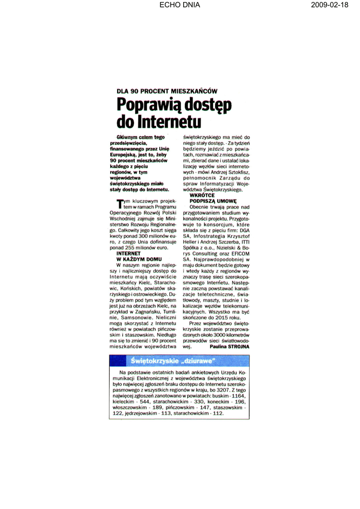 ECHO DNIA 2009-02-18 DLA 90 PROCENT MIESZKAŃCÓW Poprawią dostęp do Internetu Głównym celem tego przedsięwzięcia, finansowanego przez Unię Europejska, jest to, żeby 90 procent mieszkańców każdego z pięciu regionów, w tym województwa świętokrzyskiego miało stały dostęp do Internetu. ym kluczowym projek tem w ramach Programu Operacyjnego Rozwój Polski Wschodniej zajmuje sie Mini sterstwo Rozwoju Regionalne go. Całkowity jego koszt sięga kwoty ponad 300 milionów eu ro, z czego Unia dofinansuje ponad 255 milionów euro. INTERNET W KAŻDYM DOMU W naszym regionie najlep szy i najliczniejszy dostęp do Internetu mają oczywiście mieszkańcy Kielc, Staracho wic, Końskich, powiatów ska rzyskiego i ostrowieckiego. Du ży problem pod tym względem jest już na obrzeżach Kielc, na przykład w Zagnańsku, Tumli nie, Samsonowie. Nieliczni mogą skorzystać z Internetu również w powiatach pińczowskim i staszowskim. Niedługo ma się to zmienić i 90 procent mieszkańców województwa T świętokrzyskiego ma mieć do niego stały dostęp. Za tydzień będziemy jeździć po powia tach, rozmawiać z mieszkańca mi, zbierać dane i ustalać loka lizację węzłów sieci interneto wych - mówi Andrzej Sztokfisz, pełnomocnik Zarządu do spraw Informatyzacji Woje wództwa Świętokrzyskiego. WKRÓTCE PODPISZĄ UMOWĘ Obecnie trwają prace nad przygotowaniem studium wy konalności projektu. Przygoto wuje to konsorcjum, które składa się z pięciu firm: DGA SA, Infostrategia Krzysztof Heller i Andrzej Szczerba, ITTI Spółka z o.o., Nizielski & Bo rys Consulting oraz EFICOM SA. Najprawdopodobniej w maju dokument będzie gotowy i wtedy każdy z regionów wy znaczy trasę sieci szerokopa smowego Internetu. Następ nie zaczną powstawać kanali zacje teletechniczne, świa tłowody, maszty, studnie i lo kalizacje węzłów telekomuni kacyjnych. Wszystko ma być skończone do 2015 roku. Przez województwo święto krzyskie zostanie przeprowa dzonych około 3000 kilometrów przewodów sieci światłowoda wej. Paulina STROJNA HMHflHM . Na podstawie ostatnich badań ankietowych Urzędu Ko munikacji Elektronicznej z województwa świętokrzyskiego było najwięcej zgłoszeń braku dostępu do Internetu szeroko pasmowego z wszystkich regionów w kraju, bo 3207. Z tego najwięcej zgłoszeń zanotowano w powiatach: buskim -1164, kieleckim - 544, starachowickim - 330, koneckim 196, włoszczowskim - 189, pińczowskim - 147, staszowskim 122, jędrzejowskim - 113, starachowickim - 1 1 2 .