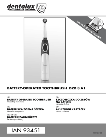 BATTERY-OPERATED TOOTHBRUSH DZB 3 A1 BATTERY-OPERATED TOOTHBRUSH Operating instructions SZCZOTECZKA DO ZĘBÓW NA BATERIE Instrukcja obsługi BATERIJSKA ZOBNA ŠČETKA Navodila za uporabo BATTERIE-ZAHNBÜRSTE Bedienungsanleitung IAN 93451 AKU ZUBNÍ KARTÁČEK Návod k obsluze Before reading, unfold the page containing the illustrations and familiarise yourself with all functions of the device. Przed przeczytaniem proszę rozłożyć stronę z ilustracjami, a następnie proszę zapoznać się z wszystkimi funkcjami urządzenia. Pred branjem odprite stran s slikami in se nato seznanite z vsemi funkcijami naprave. Před čtením si otevřete stranu s obrázky a potom se seznamte se všemi funkcemi přístroje. Klappen Sie vor dem Lesen die Seite mit den Abbildungen aus und machen Sie sich anschließend mit allen Funktionen des Gerätes vertraut. GB PL SI CZ DE / AT / CH Operating instructions Instrukcja obsługi Navodila za uporabo Návod k obsluze Bedienungsanleitung Page 1 Strona 7 Stran 15 Strana 23 Seite 31 Contents GB Introduction . . . . . . . . . . . . . . . . . . . . . . . . . . . . . . . . . . . . . . . . . . . . . . . . . . . . . . . . . . . 2 Proper use . . . . . . . . . . . . . . . . . . . . . . . . . . . . . . . . . . . . . . . . . . . . . . . . . . . . . . . . . . . . 2 Package contents . . . . . . . . . . . . . . . . . . . . . . . . . . . . . . . . . . . . . . . . . . . . . . . . . . . . . . 2 Appliance description . . . . . . . . . . . . . . . . . . . . . . . . . . . . . . . . . . . . . . . . . . . . . . . . . . . 2 Technical details . . . . . . . . . . . . . . . . . . . . . . . . . . . . . . . . . . . . . . . . . . . . . . . . . . . . . . . 2 Safety instructions . . . . . . . . . . . . . . . . . . . . . . . . . . . . . . . . . . . . . . . . . . . . . . . . . . . . . 2 Initial use . . . . . . . . . . . . . . . . . . . . . . . . . . . . . . . . . . . . . . . . . . . . . . . . . . . . . . . . . . . . . 3 Fitting/removing the brush head . . . . . . . . . . . . . . . . . . . . . . . . . . . . . . . . . . . . . . . . . 4 Brushing teeth . . . . . . . . . . . . . . . . . . . . . . . . . . . . . . . . . . . . . . . . . . . . . . . . . . . . . . . . . 4 Changing the batteries . . . . . . . . . . . . . . . . . . . . . . . . . . . . . . . . . . . . . . . . . . . . . . . . . . 5 Cleaning and care . . . . . . . . . . . . . . . . . . . . . . . . . . . . . . . . . . . . . . . . . . . . . . . . . . . . . . 5 Storage . . . . . . . . . . . . . . . . . . . . . . . . . . . . . . . . . . . . . . . . . . . . . . . . . . . . . . . . . . . . . . 5 Disposal . . . . . . . . . . . . . . . . . . . . . . . . . . . . . . . . . . . . . . . . . . . . . . . . . . . . . . . . . . . . . . 6 Disposal of the appliance . . . . . . . . . . . . . . . . . . . . . . . . . . . . . . . . . . . . . . . . . . . . . . . . . . . . . . . . . . . . 6 Disposal of batteries . . . . . . . . . . . . . . . . . . . . . . . . . . . . . . . . . . . . . . . . . . . . . . . . . . . . . . . . . . . . . . . . 6 Warranty and Service . . . . . . . . . . . . . . . . . . . . . . . . . . . . . . . . . . . . . . . . . . . . . . . . . . 6 Importer . . . . . . . . . . . . . . . . . . . . . . . . . . . . . . . . . . . . . . . . . . . . . . . . . . . . . . . . . . . . . 6 DZB 3 A1 IB_93451_DZB3A1_LB4.indb 1 1 06.09.13 13:44 GB Introduction Appliance description Congratulations on the purchase of your new appliance. 1 Brush head You have selected a high-quality product. The operating instructions are part of this product. They contain important information on safety, use and disposal. Before using the product, familiarise yourself with all operating and safety instructions. Use this product only as described and only for the specified areas of application. Please also pass these operating instructions on to any future owner(s). 3 Drive shaft Proper use This appliance is intended exclusively for personal dental care. This appliance is intended exclusively for use in domestic households. The appliance is not intended for use in commercial, industrial or medical environments. It is not suitable for animal care. 2 Protective cap 4 On/off switch 5 Handle 6 Battery compartment cover Technical details Power supply: 2 x 1.5 V Battery type: 1.5 V, Mignon, AA, LR6 Protection class: IPX4 Safety instructions WARNING! RISK OF INJURY! ► Package contents Handle 4 brush heads 2 batteries 1 protective cap Operating instructions Check the delivery contents for completeness immediately after unpacking. ► Remove all packaging materials and plastic film from the appliance. ► ► 2 IB_93451_DZB3A1_LB4.indb 2 Toothbrushes may be used by children and by persons with reduced physical, sensory or mental capabilities or lack of experience and/or knowledge if they are supervised or, with regard to safe use of the appliance, have been instructed in its use and have understood the potential risks. Cleaning and user maintenance should not be performed by children, unless they are being supervised. Children must not play with the appliance. Do not open the appliance (except the battery compartment) yourself. Risk of injury if appliance is not properly assembled! DZB 3 A1 06.09.13 13:44 CAUTION! BATTERIES! Safety information for handling batteries: ► Do not throw batteries into a fire. Do not recharge batteries. Risk of explosions and injuries! ► Never open batteries and never solder or weld batteries. Risk of explosions and injuries! ► Check the condition of the batteries at regular intervals. Leaking batteries can cause damage to the appliance. ► If you do not intend to use the appliance for an extended period, remove the batteries. ► If the batteries have leaked, use protective gloves. Clean the battery compartment and the battery contacts with a dry cloth. ► Keep batteries out of the reach of children. Children might put bat-teries into their mouth and swallow them. If a battery is swallowed, medical assistance must be sought immediately. DZB 3 A1 IB_93451