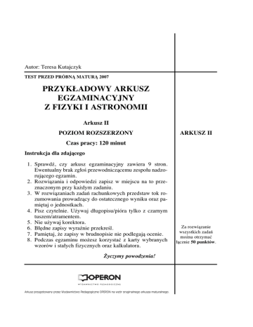 Autor: Teresa Kutajczyk TEST PRZED PRÓBNÑ MATURÑ 2007 PRZYK¸ADOWY ARKUSZ EGZAMINACYJNY Z FIZYKI I ASTRONOMII Arkusz II POZIOM ROZSZERZONY ARKUSZ II Czas pracy: 120 minut Instrukcja dla zdajàcego 1. Sprawdê, czy arkusz egzaminacyjny zawiera 9 stron. Ewentualny brak zg∏oÊ przewodniczàcemu zespo∏u nadzorujàcego egzamin. 2. Rozwiàzania i odpowiedzi zapisz w miejscu na to przeznaczonym przy ka˝dym zadaniu. 3. W rozwiàzaniach zadaƒ rachunkowych przedstaw tok rozumowania prowadzàcy do ostatecznego wyniku oraz pami´taj o jednostkach. 4. Pisz czytelnie. U˝ywaj d∏ugopisu/pióra tylko z czarnym tuszem/atramentem. 5. Nie u˝ywaj korektora. 6. B∏´dne zapisy wyraênie przekreÊl. 7. Pami´taj, ˝e zapisy w brudnopisie nie podlegajà ocenie. 8. Podczas egzaminu mo˝esz korzystaç z karty wybranych wzorów i sta∏ych fizycznych oraz kalkulatora. ˚yczymy powodzenia! Arkusz przygotowany przez Wydawnictwo Pedagogiczne OPERON na wzór oryginalnego arkusza maturalnego. Za rozwiàzanie wszystkich zadaƒ mo˝na otrzymaç ∏àcznie 50 punktów. 2 Fizyka i astronomia. Arkusz II Zadanie 21. Ruch samochodu (9 pkt) Samochód o masie jednej tony wje˝d˝a pod gór´ wzd∏u˝ prostoliniowego odcinka szosy nachylonego pod kàtem a = 12c ze sta∏à pr´dkoÊcià o wartoÊci v = 36 km . Pomijamy opór powietrza i przyjmu- h jemy Êredni wspó∏czynnik tarcia kó∏ samochodu o nawierzchni´ n = 0,2. (sin 12c = 0,2079, cos 12c = 0,9781, tg 12c = 0,2126) 21.1 (3 pkt) Narysuj i nazwij wektory si∏ dzia∏ajàcych na samochód podczas wjazdu pod gór´. a 21.2 (3 pkt) Oblicz si∏´ ciàgu silnika samochodu podczas wje˝d˝ania pod gór´. 21.3 (3 pkt) Po obcià˝eniu samochodu na poziomej nawierzchni ∏adunkiem o masie 200 kg wysokoÊç samochodu zmniejsza si´ o x = 5 cm. Oszacuj cz´stotliwoÊç drgaƒ w∏asnych, jakà mia∏by ten samochód pozbawiony amortyzatorów drgaƒ. Przyjmij, ˝e wszystkie spr´˝yny uginajà si´ jednakowo. w w w. o p e r o n . p l Fizyka i astronomia. Arkusz II 3 Zadanie 22. Za∏amanie Êwiat∏a (10 pkt) Promieƒ Êwiat∏a, który pada na granic´ mi´dzy dwoma przezroczystymi dla Êwiat∏a oÊrodkami, dzieli si´ na promieƒ odbity i promieƒ za∏amany. Promieƒ za∏amany wnika do drugiego oÊrodka i porusza si´ w nim z innà pr´dkoÊcià ni˝ w oÊrodku pierwszym. Z pr´dkoÊcià rozchodzenia si´ Êwiat∏a okreÊlonej barwy w danym oÊrodku zwiàzany jest bezwzgl´dny wspó∏czynnik za∏amania tego oÊrodka dla danej barwy Êwiat∏a. Zale˝noÊç bezwzgl´dnego wspó∏czynnika za∏amania szk∏a od d∏ugoÊci fali Êwiat∏a ró˝nych barw przedstawiono na wykresie. n 1,620 1,610 1,613 1,600 1,590 1,580 1,591 1,577 1,570 1,560 1,557 1,550 1,540 1,542 1,536 1,530 350 400 450 500 550 600 650 700 750 800 m(nm) 22.1 (2 pkt) WyjaÊnij krótko, co nazywamy bezwzgl´dnym wspó∏czynnikiem za∏amania oÊrodka i zapisz zale˝noÊç mi´dzy nim a wartoÊcià pr´dkoÊci Êwiat∏a w tym oÊrodku. w w w. o p e r o n . p l 4 Fizyka i astronomia. Arkusz II 22.2 (2 pkt) Korzystajàc z wykresu, zapisz przedzia∏ wartoÊci d∏ugoÊci fali odpowiadajàcy zakresowi Êwiat∏a widzialnego. WyjaÊnij krótko, czy te wartoÊci zmieniajà si´ po przejÊciu Êwiat∏a z pró˝ni do szk∏a. 22.3 (3 pkt) Wyka˝, korzystajàc z wykresu, ˝e w szkle pr´dkoÊç Êwiat∏a barwy czerwonej jest wi´ksza ni˝ Êwiat∏a barwy fioletowej. 22.4 (3 pkt) Âwiat∏o przy odbiciu od powierzchni szk∏a ulega tak˝e polaryzacji liniowej. Ca∏kowita polaryzacja liniowa zachodzi dla okreÊlonego kàta padania a B. Przedstaw na rysunku warunek wystàpienia ca∏kowitej liniowej polaryzacji (zaznacz kàt a B) i wyka˝, ˝e bezwzgl´dny wspó∏czynnik za∏amania szk∏a mo˝na obliczyç z zale˝noÊci n = tg a B. w w w. o p e r o n . p l Fizyka i astronomia. Arkusz II 5 Zadanie 23. Obwody z baterià (11 pkt) Uczniowie zbudowali obwód zawierajàcy bateri´, amperomierz, woltomierz i opornik regulowany. Zmieniajàc wartoÊç oporu regulowanego, dwukrotnie odczytali wskazania mierników. Wyniki pomiarów przedstawia tabela. Pomijamy opór amperomierza oraz przewodów po∏àczeniowych i zak∏adamy, ˝e woltomierz ma nieskoƒczenie du˝y opór. U, V I, A Pomiar 1 Pomiar 2 8,8 8,5 0,21 0,52 23.1 (2 pkt) Narysuj schemat obwodu, który zbudowali uczniowie. (Opornik regulowany oznaczamy symbolem: ) 23.2 (3 pkt) Korzystajàc z danych w tabeli, oblicz wartoÊci si∏y elektromotorycznej i oporu wewn´trznego baterii. w w w. o p e r o n . p l 6 Fizyka i astronomia. Arkusz II 23.3 (3 pkt) Do baterii, zamiast opornika regulowanego, pod∏àczono drut miedziany o d∏ugoÊci l = 10 m i Êrednicy d = 0,2 mm. Amperomierz wskaza∏ 1,4 A, a woltomierz 7,6 V. Korzystajàc z tych wyników pomiaru, oblicz wartoÊç oporu w∏aÊciwego miedzi. 23.4 (3 pkt) Dwie ˝arówki o wartoÊciach nominalnych: 2 W/6 V oraz 4 W/6 V po∏àczono szeregowo do baterii. Napi´cie na zaciskach obcià˝onej baterii wynosi∏o 9 V. Ustal i zapisz, która z ˝arówek Êwieci jaÊniej. Uzasadnij odpowiedê, zapisujàc odpowiednie zale˝noÊci. Przyjmij, ˝e opór ˝arówek nie zmienia si´ podczas Êwiecenia. Zadanie 24. Fotokomórka (10 pkt) Rysunek przedstawia schemat uk∏adu pomiarowego z fotokomórkà, przy u˝yciu którego mierzono wartoÊci napi´cia hamowania. Napi´ciem hamowania nazywamy napi´cie, przy którym nie p∏ynie pràd w obwodzie fotokomórki, pomimo oÊwietlania jej katody Êwiat∏em powodujàcym przy wy˝szym napi´ciu przep∏yw pràdu w obwodzie. WartoÊç dzia∏ki elementarnej woltomierza ∆ U wynosi 0,01 V. V A w w w. o p e r o n . p l 7 Fizyka i astronomia. Arkusz II 24.1 (2 pkt) Narysuj przyk∏adowà charakterystyk´ pràdowo-napi´ciowà fotokomórki i zaznacz na niej napi´cie hamowania U h. 24.2 (2 pkt) OÊwietlajàc katod´ fotokomórki Êwiat∏em o ró˝nych d∏ugoÊciach fali, uzyskano wyniki przedstawione w pierwszym i czwartym wierszu poni˝szej tabeli. Oblicz i zapisz w p