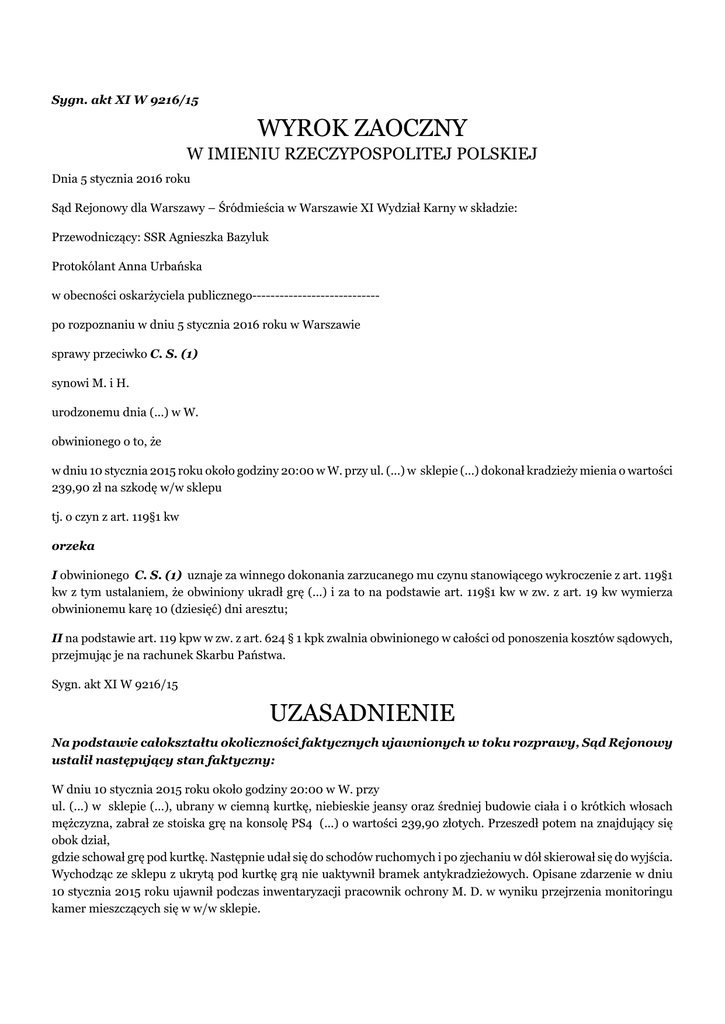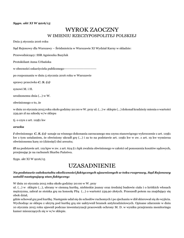 Sygn. akt XI W 9216/15 WYROK ZAOCZNY W IMIENIU RZECZYPOSPOLITEJ POLSKIEJ Dnia 5 stycznia 2016 roku Sąd Rejonowy dla Warszawy – Śródmieścia w Warszawie XI Wydział Karny w składzie: Przewodniczący: SSR Agnieszka Bazyluk Protokólant Anna Urbańska w obecności oskarżyciela publicznego---------------------------po rozpoznaniu w dniu 5 stycznia 2016 roku w Warszawie sprawy przeciwko C. S. (1) synowi M. i H. urodzonemu dnia (...) w W. obwinionego o to, że w dniu 10 stycznia 2015 roku około godziny 20:00 w W. przy ul. (...) w sklepie (...) dokonał kradzieży mienia o wartości 239,90 zł na szkodę w/w sklepu tj. o czyn z art. 119§1 kw orzeka I obwinionego C. S. (1) uznaje za winnego dokonania zarzucanego mu czynu stanowiącego wykroczenie z art. 119§1 kw z tym ustalaniem, że obwiniony ukradł grę (...) i za to na podstawie art. 119§1 kw w zw. z art. 19 kw wymierza obwinionemu karę 10 (dziesięć) dni aresztu; II na podstawie art. 119 kpw w zw. z art. 624 § 1 kpk zwalnia obwinionego w całości od ponoszenia kosztów sądowych, przejmując je na rachunek Skarbu Państwa. Sygn. akt XI W 9216/15 UZASADNIENIE Na podstawie całokształtu okoliczności faktycznych ujawnionych w toku rozprawy, Sąd Rejonowy ustalił następujący stan faktyczny: W dniu 10 stycznia 2015 roku około godziny 20:00 w W. przy ul. (...) w sklepie (...), ubrany w ciemną kurtkę, niebieskie jeansy oraz średniej budowie ciała i o krótkich włosach mężczyzna, zabrał ze stoiska grę na konsolę PS4 (...) o wartości 239,90 złotych. Przeszedł potem na znajdujący się obok dział, gdzie schował grę pod kurtkę. Następnie udał się do schodów ruchomych i po zjechaniu w dół skierował się do wyjścia. Wychodząc ze sklepu z ukrytą pod kurtkę grą nie uaktywnił bramek antykradzieżowych. Opisane zdarzenie w dniu 10 stycznia 2015 roku ujawnił podczas inwentaryzacji pracownik ochrony M. D. w wyniku przejrzenia monitoringu kamer mieszczących się w w/w sklepie. W toku czynności wyjaśniających ustalono, iż sprawcą powyższej kradzieży jest C. S. (1), zam. przy ul. (...) w W.. Powyżej opisany stan faktyczny Sąd ustalił w oparciu o: zeznania M. D. (k. 4v od słów „Jestem pracownikiem” do słów „monitoringu ze zdarzenia”), protokół przyjęcia ustnego zawiadomienia o wykroczenia (k. 2), kserokopię notatnika służbowego (k. 11), telefonogram (k. 15), notatkę urzędową (k. 17), dokumentację fotograficzną (k. 18-19) oraz nagranie z monitoringu sklepu znajdującego się na płycie CD-R (k. 7, odtworzone na rozprawie k. 40). Obwiniony w toku czynności wyjaśniających przyznał się do popełnienia zarzucanego mu czynu i odmówił składania wyjaśnień. Obwiniony był uprzednio trzykrotnie karany, w tym raz za przestępstwo przeciwko mieniu, tj. rozbój kwalifikowany (k. 25-26). Sąd zważył, co następuje: W ocenie Sądu, przyznanie się obwinionego do zarzucanego mu czynu w świetle całokształtu materiału dowodowego nie budzi wątpliwości, w szczególności nagrania z monitoringu (k. 7) i zeznań M. D.. Sąd uznał za wiarygodny dowód z zeznań M. U. zeznania są spójne, logiczne, obiektywne i bezstronne. Świadek ujawnił kradzież przy okazji wykonywania swoich pracowniczych obowiązków. Ponadto jako osoba zupełnie obca dla obwinionego nie miał w związku z tym powodów do bezpodstawnego obciążania obwinionego niekorzystnymi dla niego zeznaniami. Za wiarygodny uznano dowód w postaci nagrania z monitoringu sklepu zamieszczonego na płycie CD (k. 7, odtworzone na rozprawie k. 40). Dowód ten nie był w toku postępowania sądowego kwestionowany i w pełni korespondował z uznanymi za wiarygodne dowodami. Sąd dał również wiarę dokumentom ujawnionym na rozprawie bez ich odczytywania w trybie art. 76 § 1 kpw w postaci: protokołu przyjęcia ustnego zawiadomienia o wykroczenia (k. 2), kserokopii notatnika służbowego (k. 11), telefonogramu (k. 15), notatki urzędowej (k. 17) oraz dokumentacji fotograficznej (k. 18-19). Wskazane dokumenty nie zostały zakwestionowane w toku postępowania dowodowego, zostały sporządzone przez uprawnione do tego osoby, a ich treść nie budzi wątpliwości, co do ich autentyczności i prawdziwości. Z tych względów, Sąd uznał je za wiarygodne. Karalność obwinionego ustalono w oparciu o dane z Krajowego Rejestru Karnego (k. 25-26) – ten dokument również jest wiarygodny, gdyż został wydany przez powołany do tego ustawowo organ państwowy. Czyn opisany w art. 119 § 1 kw popełnia ten, kto kradnie lub przywłaszcza sobie cudzą rzecz ruchomą, jeżeli jej wartość nie przekracza ¼ minimalnego wynagrodzenia. Ustawodawca wobec sprawcy tego wykroczenia przewidział możliwość wymierzenia kary aresztu, ograniczenia wolności albo grzywny. Kodeks wykroczeń nie wyjaśnia pojęcia kradzieży, posługuje się tylko określeniem „kradnie” . Oznacza to, że do rozumienia tego przepisu należy odwołać się do treści art. 278 § 1 kk. Kradzież, zgodnie z rozumieniem przepisu art. 278 § 1 kk, jest zaborem rzeczy w celu jej przywłaszczenia. Zachowaniem polegającym na zaborze będzie przejęcie władztwa nad rzeczą, czyli w powszechnym rozumieniu objęcie rzeczy w posiadanie z jednoczesnym wyjęciem jej spod władztwa właściciela, objawiające się w przypadku przedmiotów materialnych jako wzięcie rzeczy do ręki, czy włożenie jej na przykład do kieszeni odzieży, torby czy plecaka. Niekiedy do umieszczenia rzeczy w miejscu znajdującym się poza władztwem jej właściciela potrzebne jest przemieszczenie jej na pewną odległość. Znamieniem czynu polegającego na kradzieży jest także działanie w celu przywłaszczenia, czyli podjęcie przez sprawcę już po zaborze zachowania ukierunkowanego na postąpieniu z rzeczą jak z własną, poprzez wyrażenie w jakikolwiek sposób chęci na przykład posiadania jej, używania, podarowania komuś lub zbycia. Rzecz opisana w art. 119 § 1 kw ma być cudza – 