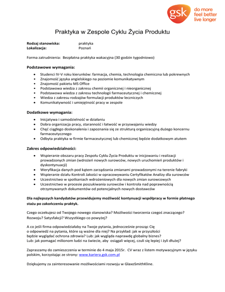 Praktyka w Zespole Cyklu Życia Produktu Rodzaj stanowiska: Lokalizacja: praktyka Poznań Forma zatrudnienia: Bezpłatna praktyka wakacyjna (30 godzin tygodniowo) Podstawowe wymagania: • • • • • Studenci IV-V roku kierunków: farmacja, chemia, technologia chemiczna lub pokrewnych Znajomość języka angielskiego na poziomie komunikatywnym Znajomość pakietu MS Office Podstawowa wiedza z zakresu chemii organicznej i nieorganicznej Podstawowa wiedza z zakresu technologii farmaceutycznej i chemicznej Wiedza z zakresu rodzajów formulacji produktów leczniczych Komunikatywność i umiejętność pracy w zespole Dodatkowe wymagania: Inicjatywa i samodzielność w działaniu Dobra organizacja pracy, staranność i łatwość w przyswajaniu wiedzy Chęć ciągłego doskonalenia i zapoznania się ze strukturą organizacyjną dużego koncernu farmaceutycznego Odbyta praktyka w firmie farmaceutycznej lub chemicznej będzie dodatkowym atutem Zakres odpowiedzialności: Wspieranie obszaru pracy Zespołu Cyklu Życia Produktu w inicjowaniu i realizacji prowadzonych zmian (wdrożeń nowych surowców, nowych uruchomień produktów i dyskontynuacji) Weryfikacja danych pod kątem zarządzania zmianami prowadzonymi na terenie fabryki Wspieranie działu Kontroli Jakości w opracowywaniu Certyfikatów Analizy dla surowców Uczestnictwo w spotkaniach wdrożeniowych dla nowych zmian surowcowych Uczestnictwo w procesie poszukiwania surowców i kontrola nad poprawnością otrzymywanych dokumentów od potencjalnych nowych dostawców Dla najlepszych kandydatów przewidujemy możliwość kontynuacji współpracy w formie płatnego stażu po zakończeniu praktyk. Czego oczekujesz od Twojego nowego stanowiska? Możliwości tworzenia czegoś znaczącego? Rozwoju? Satysfakcji? Wszystkiego co powyżej? A co jeśli firma odpowiedziałaby na Twoje pytania, jednocześnie prosząc Cię o odpowiedź na pytania, które są ważne dla niej? Na przykład: jak w przyszłości będzie wyglądać ochrona zdrowia? Lub: jak wygląda naprawdę globalny biznes? Lub: jak pomagać milionom ludzi na świecie, aby osiągali więcej, czuli się lepiej i żyli dłużej? Zapraszamy do zamieszczenia w terminie do 4 maja 2015r. CV wraz z listem motywacyjnym w języku polskim, korzystając ze strony: www.kariera.gsk.com.pl Dziękujemy za zainteresowanie możliwościami rozwoju w GlaxoSmithKline.
