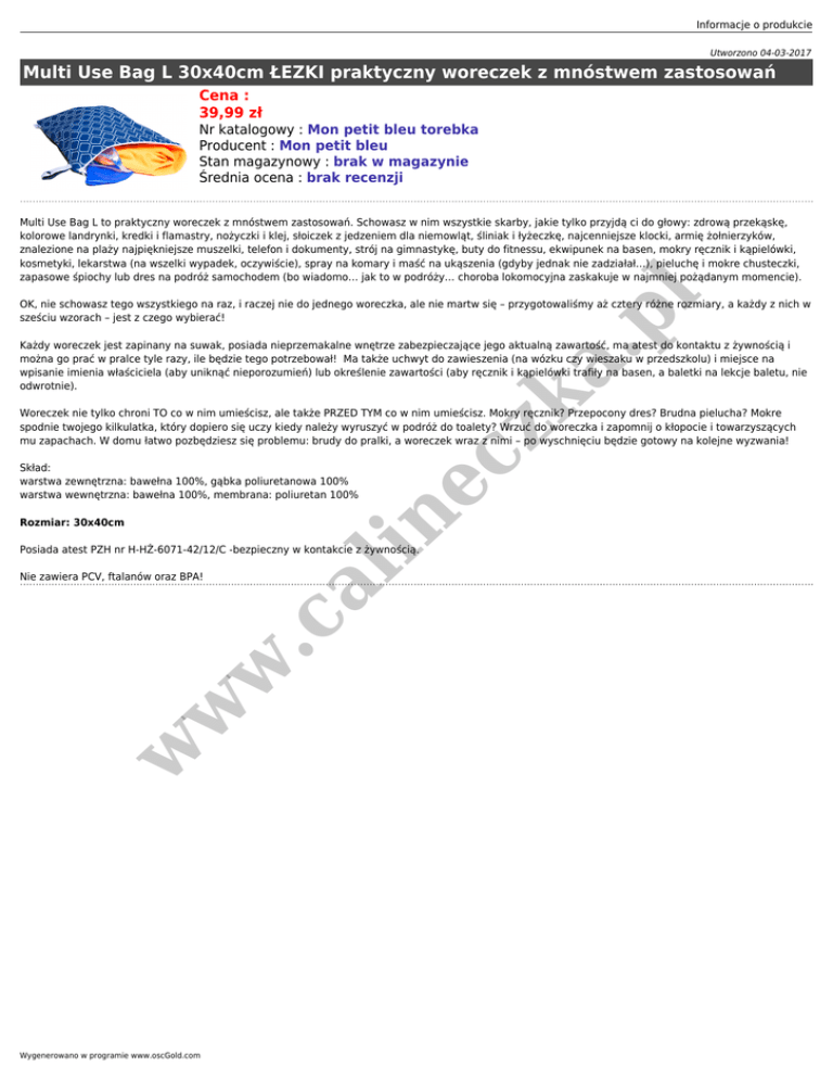 Informacje o produkcie Utworzono 04-03-2017 Multi Use Bag L 30x40cm ŁEZKI praktyczny woreczek z mnóstwem zastosowań Cena : 39,99 zł Nr katalogowy : Mon petit bleu torebka Producent : Mon petit bleu Stan magazynowy : brak w magazynie Średnia ocena : brak recenzji pl Multi Use Bag L to praktyczny woreczek z mnóstwem zastosowań. Schowasz w nim wszystkie skarby, jakie tylko przyjdą ci do głowy: zdrową przekąskę, kolorowe landrynki, kredki i flamastry, nożyczki i klej, słoiczek z jedzeniem dla niemowląt, śliniak i łyżeczkę, najcenniejsze klocki, armię żołnierzyków, znalezione na plaży najpiękniejsze muszelki, telefon i dokumenty, strój na gimnastykę, buty do fitnessu, ekwipunek na basen, mokry ręcznik i kąpielówki, kosmetyki, lekarstwa (na wszelki wypadek, oczywiście), spray na komary i maść na ukąszenia (gdyby jednak nie zadziałał…), pieluchę i mokre chusteczki, zapasowe śpiochy lub dres na podróż samochodem (bo wiadomo… jak to w podróży… choroba lokomocyjna zaskakuje w najmniej pożądanym momencie). OK, nie schowasz tego wszystkiego na raz, i raczej nie do jednego woreczka, ale nie martw się – przygotowaliśmy aż cztery różne rozmiary, a każdy z nich w sześciu wzorach – jest z czego wybierać! zk a. Każdy woreczek jest zapinany na suwak, posiada nieprzemakalne wnętrze zabezpieczające jego aktualną zawartość, ma atest do kontaktu z żywnością i można go prać w pralce tyle razy, ile będzie tego potrzebował! Ma także uchwyt do zawieszenia (na wózku czy wieszaku w przedszkolu) i miejsce na wpisanie imienia właściciela (aby uniknąć nieporozumień) lub określenie zawartości (aby ręcznik i kąpielówki trafiły na basen, a baletki na lekcje baletu, nie odwrotnie). in Skład: warstwa zewnętrzna: bawełna 100%, gąbka poliuretanowa 100% warstwa wewnętrzna: bawełna 100%, membrana: poliuretan 100% ec Woreczek nie tylko chroni TO co w nim umieścisz, ale także PRZED TYM co w nim umieścisz. Mokry ręcznik? Przepocony dres? Brudna pielucha? Mokre spodnie twojego kilkulatka, który dopiero się uczy kiedy należy wyruszyć w podróż do toalety? Wrzuć do woreczka i zapomnij o kłopocie i towarzyszących mu zapachach. W domu łatwo pozbędziesz się problemu: brudy do pralki, a woreczek wraz z nimi – po wyschnięciu będzie gotowy na kolejne wyzwania! Rozmiar: 30x40cm w w w Nie zawiera PCV, ftalanów oraz BPA! .c al Posiada atest PZH nr H-HŻ-6071-42/12/C -bezpieczny w kontakcie z żywnością. Wygenerowano w programie www.oscGold.com