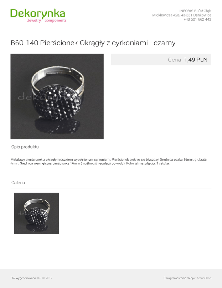 INFOBIS Rafał Głąb Mickiewicza 42a, 43-331 Dankowice +48 601 662 442 B60-140 Pierścionek Okrągły z cyrkoniami - czarny Cena: 1,49 PLN Opis produktu Metalowy pierścionek z okrągłym oczkiem wypełnionym cyrkoniami. Pierścionek pięknie się błyszczy! Średnica oczka 16mm, grubość 4mm. Średnica wewnętrzna pierścionka 16mm (możliwość regulacji obwodu). Kolor jak na zdjęciu. 1 sztuka. Galeria Plik wygenerowano: 04-03-2017 Powered by TCPDF (www.tcpdf.org) Oprogramowanie sklepu: AptusShop
