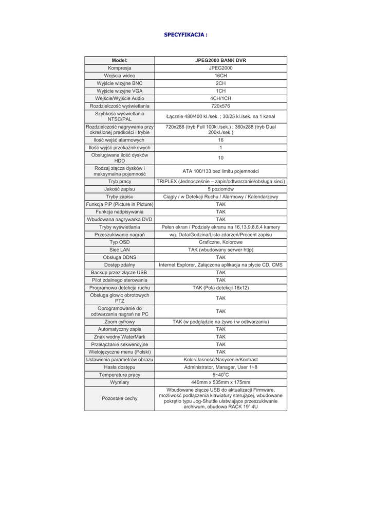 SPECYFIKACJA : Model: JPEG2000 BANK DVR Kompresja JPEG2000 Wejścia wideo 16CH Wyjście wizyjne BNC 2CH Wyjście wizyjne VGA 1CH Wejście/Wyjście Audio 4CH/1CH Rozdzielczość wyświetlania 720x576 Szybkość wyświetlania NTSC/PAL Łącznie 480/400 kl./sek. ; 30/25 kl./sek. na 1 kanał Rozdzielczość nagrywania przy określonej prędkości i trybie 720x288 (tryb Full 100kl./sek.) ; 360x288 (tryb Dual 200kl./sek.) Ilość wejść alarmowych 16 Ilość wyjść przekaźnikowych 1 Obsługiwana ilość dysków HDD 10 Rodzaj złącza dysków i maksymalna pojemność ATA 100/133 bez limitu pojemności Tryb pracy TRIPLEX (Jednocześnie – zapis/odtwarzanie/obsługa sieci) Jakość zapisu 5 poziomów Tryby zapisu Ciągły / w Detekcji Ruchu / Alarmowy / Kalendarzowy Funkcja PiP (Picture in Picture) TAK Funkcja nadpisywania TAK Wbudowana nagrywarka DVD TAK Tryby wyświetlania Pełen ekran / Podziały ekranu na 16,13,9,8,6,4 kamery Przeszukiwanie nagrań wg. Data/Godzina/Lista zdarzeń/Procent zapisu Typ OSD Graficzne, Kolorowe Sieć LAN TAK (wbudowany serwer http) Obsługa DDNS TAK Dostęp zdalny Internet Explorer, Załączona aplikacja na płycie CD, CMS Backup przez złącze USB TAK Pilot zdalnego sterowania TAK Programowa detekcja ruchu TAK (Pola detekcji 16x12) Obsługa głowic obrotowych PTZ TAK Oprogramowanie do odtwarzania nagrań na PC TAK Zoom cyfrowy TAK (w podglądzie na żywo i w odtwarzaniu) Automatyczny zapis TAK Znak wodny WaterMark TAK Przełączanie sekwencyjne TAK Wielojęzyczne menu (Polski) TAK Ustawienia parametrów obrazu Kolor/Jasność/Nasycenie/Kontrast Hasła dostępu Administrator, Manager, User 1~8 Temperatura pracy 5~40oC Wymiary 440mm x 535mm x 175mm Pozostałe cechy Wbudowane złącze USB do aktualizacji Firmware, możliwość podłączenia klawiatury sterującej, wbudowane pokrętło typu Jog-Shuttle ułatwiające przeszukiwanie archiwum, obudowa RACK 19” 4U