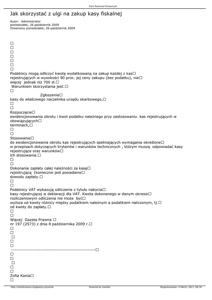 Cech Rzemiosł Drzewnych Jak skorzystać z ulgi na zakup kasy fiskalnej Autor: Administrator poniedziałek, 26 październik 2009 Zmieniony poniedziałek, 26 październik 2009 Podatnicy mogą odliczyć kwotę wydatkowaną na zakup każdej z kas rejestrujących w wysokości 90 proc. jej ceny zakupu (bez podatku), nie więcej jednak niż 700 zł. Warunkiem skorzystania jest: Zgłoszenie kasy do właściwego naczelnika urzędu skarbowego, Rozpoczęcie ewidencjonowania obrotu i kwot podatku należnego przy zastosowaniu kas rejestrujących w obowiązujących terminach, Stosowanie do ewidencjonowania obrotu kas rejestrujących spełniających wymagania określone w przepisach dotyczących kryteriów i warunków technicznych , którym muszą odpowiadać kasy rejestrujące oraz warunków ich stosowania. Dokonanie zapłaty całej należności za kasę rejestrującą (konieczne jest posiadanie dowodu zapłaty. Podatnicy VAT wykazują odliczenie z tytułu nabycia kasy rejestrującej w deklaracji dla VAT. Kwota dokonanego w danym okresie rozliczeniowym odliczenia nie może być wyższa od kwoty różnicy między podatkiem należnym a podatkiem naliczonym, tj. od kwoty do zapłaty. Więcej: Gazeta Prawna nr 197 (2573) z dnia 8 października 2009 r. ---------------------------------------------------- Zofia Kania http://cechdrzewny.bydgoszcz.pl/portal Powered by Joomla! Wygenerowano: 4 March, 2017, 08:34 Cech Rzemiosł Drzewnych Kierownik Biura Cechu http://cechdrzewny.bydgoszcz.pl/portal Powered by Joomla! Wygenerowano: 4 March, 2017, 08:34