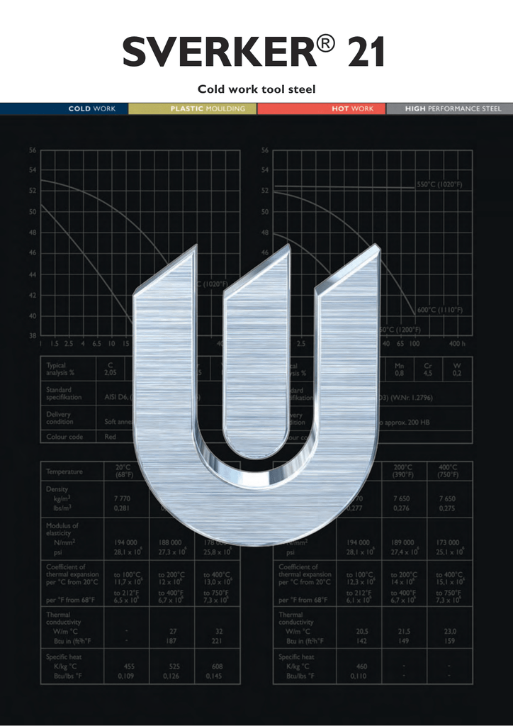 ® SVERKER 21 Cold work tool steel SVERKER 21 Ogólne dane SVERKER 21 jest wysokowęglową i wysokochromową stalą narzędziową z domieszkami molibdenu oraz wanadu charakteryzującą się: • dobrą odpornością na zużycie • dobrą wytrzymałością na ściskanie • dobrymi właściwościami hartowania skrośnego • dobrą stabilnością wymiarową podczas hartowania • dobrą odpornością na odpuszczanie Skład chemiczny Standardowa specyfikacja Stan dostawy Kod kolorystyczny C Si Mn 1,55 0,3 0,4 AISI D2, W.-Nr 1.2379 Cr 11,8 Mo 0,8 V 0,8 Zmiękczona do około 210 HB Żółty/biały HRC 56-62 56-60 58-60 56-60 58-62 58-62 58-62 56-60 56-60 56-60 58-62 Właściwości Zastosowania WŁAŚCIWOŚCI FIZYCZNE Stal SVERKER 21 jest zalecana dla wszystkich rodzajów narzędzi gdzie wymagana jest wysoka odporność na zużycie oraz umiarkowana ciągliwość (odporność na wstrząsy). Oprócz zastosowań wymienionych w ulotce informacyjnej dotyczącej stali SVERKER 3, stal SVERKER 21 wykorzystywana jest do cięcia grubszych i twardszych materiałów, przy formowaniu gdzie narzędzia poddawane są naprężeniom zginającym oraz obciążeniom udarowym. Stal SVERKER 21 może być dostarczana z różnym wykończeniem powierzchni, między innymi po walcowaniu na gorąco, po obróbce wstępnej oraz po obróbce precyzyjnej. Może być również dostarczana w formie wydrążonych prętów i pierścieni. Cięcie Formowanie Narzędzia do: Gięcia, formowania, głębokiego tłoczenia, walcowania stali nieuspokojonej, odlewania odśrodkowego i formowania płynnej stali Matryc do wybijania Matryc do wyciskania na zimno, Stempli Walców do formowania rur i przekrojów; walców gładkich Matryce do formowania: Wyrobów ceramicznych, cegieł, kafelków, ściernic, płyt, tworzyw ściernych Matryc do walcowania gwintów Narzędzi do kuźniarek Młotów do kruszarek Narzędzi do kształtowania Urządzeń i przyrządów pomiarowych, szyn prowadzących, tulei, przyrządów do radełkowania, dysz piaszczarek Grubość materiału Twardość materiału <3 mm (1/8") 60-62 Narzędzia do: Wykrawania, wykrawania precyzyjnego, przebijania, obcinania końców, ścinania, 3-6 mm (1/8-1/4") 58-60 okrawania, obcinania Krótkie nożyce do pracy na zimno. Noże do rozdrabniania odpadów tworzyw sztucznych. Noże do granulatorów. Noże krążkowe Narzędzia do obcinania Gorąco i okrawania odkuwek Zimno Frezy do drewna, rozwiertaki, przeciągacze 58-60 Stal zahartowana i odpuszczona do 62 HRC. Dane w temperaturze pokojowej i podwyższonej. Temperatura Gęstość kg/m3 lbs/in3 Współczynnik rozszerzalności cieplnej °C od 20°C °F od 68°F Przewodność cieplna * W/m °C Btu in (ft2h°F) Współczynnik sprężystości MPa ksi Ciepło właściwe J/kg °C Btu/lb, °F 20°C (68°F) 200°C (390°F) 400°C (750°F) 7700 0,277 7650 0,276 7600 0,275 - 11,2x10-6 6,2x10-6 12x10-6 6,7x10-6 20,0 139 21,0 146 23,0 159 210 000 30 450 200 000 29 000 180 000 26 100 460 0,110 - - 54-56 56-60 58-60 58-60 56-58 58-60 2 SVERKER 21 WYTRZYMAŁOŚĆ NA ŚCISKANIE Poniższe wartości powinny być traktowane jako przybliżone. Twardość HRC 62 60 55 50 Twardość jako funkcja temperatury austenityzacji. Granica plastyczności przy ściskaniu Rc0,2 MPa ksi 2200 319 2150 312 1900 276 1650 239 Obróbka cieplna MIĘKKIE WYŻARZANIE Należy zabezpieczyć stal i nagrzać do 850°C (1560°F). Następnie schładzać w piecu o 10°C (20°F) na godzinę do 650°C (1200°F), a następnie na powietrzu. ODPRĘŻANIE Po obróbce zgrubnej, narzędzie powinno zostać nagrzane do 650°C (1200°F), przy czasie utrzymywania 2 godziny. Schładzać powoli do 500°C (930°F), a następnie na powietrzu. ODPUSZCZANIE Należy dobrać temperaturę odpuszczania w zależności od wymaganej twardości w oparciu o poniższy wykres odpuszczania. Odpuszczać dwa razy stosując przy tym chłodzenie do temperatury pokojowej. Najniższa temperatura odpuszczania to 180°C (360°F). Czas utrzymywania w temperaturze to minimum 2 godziny. HARTOWANIE Temperatura podgrzewania: 650-750°C (1110-1290°F). Temperatura austenityzacji: 990-1050°C (1810-1920°F), zwykle 1000-1040°C (1830-1905°F). Temperatura °C °F 990 1010 1030 1815 1850 1885 Czas wygrzewania w Twardość przed minutach odpuszczaniem (HRC) 60 45 30 około 63 HRC około 64 HRC około 65 HRC Czas wygrzewania = czas utrzymania w temperaturze austenityzacji od momentu gdy narzędzie zostało dobrze nagrzane. Należy zabezpieczyć narzędzie przed odwęgleniem i utlenieniem podczas hartowania. ŚRODKI HARTOWNICZE • • • • Olej (dla bardzo prostych przekrojów) Próżnia (gaz szybkobieżny) Wymuszony obieg powietrza / gazu Kąpiel hartowania stopniowego lub w złożu fluidalnym w temperaturze 180-500°C (360-930°F), następnie na powietrzu. Uwaga: Należy odpuszczać narzędzie natychmiast gdy tylko jego temperatura osiągnie 50-70°C (120-160°F). Stal SVERKER 21 może być hartowana skrośnie we wszystkich standardowych wymiarach. 3 Wykres odpuszczania SVERKER 21 ZMIANY WYMIAROWE PODCZAS HARTOWANIA AZOTOWANIE I WĘGLOAZOTOWANIE Hartowanie: Temperatura austenityzacji 1020°C, czas 30 min. Próbka, 80 x 80 80 mm. W wyniku azotowania powstaje twarda warstwa powierzchniowa, która jest bardzo odporna na zużycie i erozję. Warstwa naazotowana poprawia również odporność na korozję. Azotowanie w temperaturze 525°C (975°F) daje twardość powierzchni w granicach 1250 HV1. Zmiany wymiarowe % Temperatura azotowania °C °F 525 980 525 980 525 980 Długość Szerokość Grubość Czas azotowania Grubość warstwy utwardzonej w godzinach mm cale 20 0,25 0,010 30 0,30 0,012 60 0,35 0,014 Dwugodzinne węgloazotowanie w temperaturze 570°C (1060°F) daje twardość powierzchni w granicach 950 HV1. Grubość warstwy o takiej twardości wynosić będzie 10-20 µm (0,0004"-0,0008"). Wartości są poprawne jedynie dla płyt użytych do prób. ZMIANY WYMIAROWE PODCZAS ODPUSZCZANIA Uwaga: Zmiany wymiarowe podczas hartowania
