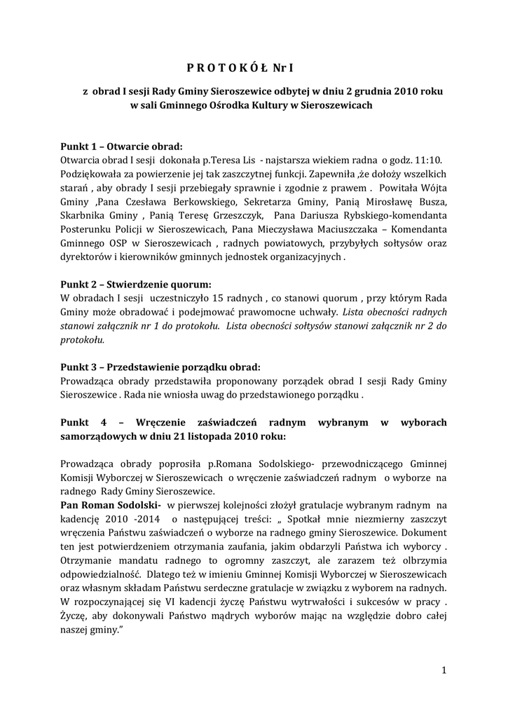 P R O T O K Ó Ł Nr I z obrad I sesji Rady Gminy Sieroszewice odbytej w dniu 2 grudnia 2010 roku w sali Gminnego Ośrodka Kultury w Sieroszewicach Punkt 1 – Otwarcie obrad: Otwarcia obrad I sesji dokonała p.Teresa Lis - najstarsza wiekiem radna o godz. 11:10. Podziękowała za powierzenie jej tak zaszczytnej funkcji. Zapewniła ,że dołoży wszelkich starań , aby obrady I sesji przebiegały sprawnie i zgodnie z prawem . Powitała Wójta Gminy ,Pana Czesława Berkowskiego, Sekretarza Gminy, Panią Mirosławę Busza, Skarbnika Gminy , Panią Teresę Grzeszczyk, Pana Dariusza Rybskiego-komendanta Posterunku Policji w Sieroszewicach, Pana Mieczysława Maciuszczaka – Komendanta Gminnego OSP w Sieroszewicach , radnych powiatowych, przybyłych sołtysów oraz dyrektorów i kierowników gminnych jednostek organizacyjnych . Punkt 2 – Stwierdzenie quorum: W obradach I sesji uczestniczyło 15 radnych , co stanowi quorum , przy którym Rada Gminy może obradować i podejmować prawomocne uchwały. Lista obecności radnych stanowi załącznik nr 1 do protokołu. Lista obecności sołtysów stanowi załącznik nr 2 do protokołu. Punkt 3 – Przedstawienie porządku obrad: Prowadząca obrady przedstawiła proponowany porządek obrad I sesji Rady Gminy Sieroszewice . Rada nie wniosła uwag do przedstawionego porządku . Punkt 4 – Wręczenie zaświadczeń radnym samorządowych w dniu 21 listopada 2010 roku: wybranym w wyborach Prowadząca obrady poprosiła p.Romana Sodolskiego- przewodniczącego Gminnej Komisji Wyborczej w Sieroszewicach o wręczenie zaświadczeń radnym o wyborze na radnego Rady Gminy Sieroszewice. Pan Roman Sodolski- w pierwszej kolejności złożył gratulacje wybranym radnym na kadencję 2010 -2014 o następującej treści: „ Spotkał mnie niezmierny zaszczyt wręczenia Państwu zaświadczeń o wyborze na radnego gminy Sieroszewice. Dokument ten jest potwierdzeniem otrzymania zaufania, jakim obdarzyli Państwa ich wyborcy . Otrzymanie mandatu radnego to ogromny zaszczyt, ale zarazem też olbrzymia odpowiedzialność. Dlatego też w imieniu Gminnej Komisji Wyborczej w Sieroszewicach oraz własnym składam Państwu serdeczne gratulacje w związku z wyborem na radnych. W rozpoczynającej się VI kadencji życzę Państwu wytrwałości i sukcesów w pracy . Życzę, aby dokonywali Państwo mądrych wyborów mając na względzie dobro całej naszej gminy.” 1 W dalszej kolejności Przewodniczący Gminnej Komisji Wyborczej w Sieroszewicach wręczył wszystkim radnym zaświadczenia. Punkt 5 – Odczytanie roty ślubowania i odebranie ślubowania od radnych: Pani Teresa Lis – odczytała rotę ślubowania: „ Wierny Konstytucji i prawu Rzeczypospolitej Polskiej ,ślubuję uroczyście obowiązki radnego sprawować godnie , rzetelnie i uczciwie, mając na względzie dobro mojej gminy i mieszkańców.” Poinformowała ,że każdy z radnych może dodatkowo wypowiedzieć formułę: „ Tak mi dopomóż Bóg.” Po odczytaniu roty ślubowania najmłodszy wiekiem radny p. Rafał Bartnik wyczytywał kolejno radnych z imienia i nazwiska , którzy wstawali i wypowiadali słowo „ ślubuję”, ponadto 13 radnych dodawało „ Tak mi dopomóż Bóg”. Dwóch radnych : p. Mieczysław Gawełek i p. Lucjan Gmerek wypowiedzieli słowo : „ Ślubuję”. Prowadząca obrady złożyła gratulacje radnym, którzy złożyli ślubowanie , obejmując mandat radnego Rady Gminy Sieroszewice. Punkt 6 – Podjęcie uchwały w sprawie zasad wyboru Przewodniczącego Rady Gminy : Prowadząca obrady przedstawiła projekt uchwały Rady w sprawie zasad wyboru Przewodniczącego Rady Gminy . Z uwagi na to ,że nikt spośród radnych nie zabrał głosu w sprawie powyższego projektu uchwały , projekt został poddany przez prowadzącą obrady pod głosowanie Rady. Za przyjęciem projektu uchwały glosowało 15 radnych ( jednogłośnie) . Uchwała Nr I/1/10 Rady Gminy Sieroszewice w sprawie zasad wyboru przewodniczącego Rady Gminy stanowi załącznik nr 3 do protokołu. Punkt 7 - Wybór Komisji Skrutacyjnej: Pani Teresa Lis- zaproponowała, aby zgodnie z wcześniej podjętą uchwałą przystąpić do powołania spośród radnych 3 – osobowej Komisji Skrutacyjnej. Przypomniała ,że osoby kandydujące na Przewodniczącego Rady Gminy nie mogą wchodzić w skład Komisji Skrutacyjnej. Poprosiła o dokonywanie zgłoszeń kandydatów do pracy w Komisji . Radny Anatol Piaskowski - zgłosił kandydaturę p. Dariusza Majewskiego , który wyraził zgodę na kandydowanie do składu Komisji. Radny Andrzej Gierlach- zgłosił kandydaturę p. Stanisława Płomińskiego , który wyraził zgodę na kandydowanie do składu Komisji. Radna Teresa Lemiesz- zgłosiła kandydaturę p. Lucjana Gmerka , który wyraził zgodę na kandydowanie do składu Komisji. W wyniku przeprowadzonego głosowania Rada powołała Komisję Skrutacyjną w w/w składzie dla wyboru Przewodniczącego oraz Wiceprzewodniczących Rady Gminy. 2 Punkt 8 – Zgłaszanie kandydatów na funkcję Przewodniczącego Rady Gminy Sieroszewice: Radny Mieczysław Gawełek - zgłosił kandydaturę p.Pawła Siwaka , uzasadniając w ten sposób, że radny ma doświadczenie w pracy samorządu i sprawdził się w Radzie. Radny Paweł Siwak- wyraził zgodę na kandydowanie. Radny Marek Rosik- zgłosił kandydaturę p. Anatola Piaskowskiego na funkcję Przewodniczącego Rady Gminy. Radny Anatol Piaskowski – wyraził zgodę na kandydowanie. Z uwagi na to, że nie było dalszych zgłoszeń kandydatów, przewodnicząca obrad zaproponowała przegłosować zamknięcie listy kandydatów na funkcję Przewodniczącego Rady Gminy . Rada Gminy przegłosowała jednogłośnie zamknięcie listy kandydatów. Punkt 9 – Zarządzenie wyborów tajnych na funkcję Przewodniczącego Rady Gminy: Przewodnicząca obrad- zarządziła tajne wybory na funkcję Przewodniczącego Rady Gminy. Zwróciła się do Komisji Skrutacyjnej , aby przystąpiła do pracy i przygotowała karty do glosowa