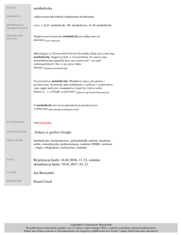 HASŁO netoholiczka DEFINICJA «dziewczyna lub kobieta uzależniona od internetu» INFORMACJA GRAMATYCZNA rzecz. ż, lp D. netoholiczki, Ms. netoholiczce, lm M. netoholiczki PRZYKŁADY UŻYCIA Najgorszym koszmarem netoholiczki jest odłączenie od internetu (www.aliny.pl). Mieszkająca w Tarnowskich Górach licealistka Żaba jest wyleczoną netoholiczką. Najgorzej było w trzeciej klasie, bo zauroczona komunikatorami spędzała noce na rozmowach – na ogół sześciogodzinych. Noc w noc przez kilka miesięcy (bytom.naszemiasto.pl). To prawdziwa netoholiczka! Dodatkowo łączy przyjemne z pożytecznym, bo pracuje jako redaktorka w jednym z wydawnictw, więc ciągle siedzi przy komputerze i musi być (tak to sobie tłumaczy…) „z Google za pan brat” (zagiete-rogi-kartek.blog.onet.pl). U netoholiczki sieć na urządzeniach przenośnych jest wykluczona (piosenkaptasia.blogspot.com). ETYMOLOGIA WIZUALIZACJE <od netoholik> Zobacz w grafice Google ODSYŁACZE butoholiczka, facebookowicz, jedzenioholik, netizen, netykieta, nolife, ortorektyczka, prokrastynacja, syndrom DDRR, szerować , vloger, wikipedysta, wyfejsować, youtuber DATA Rejestracja hasła: 14.04.2016, 11.23, ostatnia aktualizacja hasła: 10.01.2017, 01.12 AUTOR Jan Burzyński REDAKTOR Paweł Ciach Copyright © Uniwersytet Warszawski Wszelkie prawa zastrzeżone zgodnie z art.17 ustawy z dnia 4 lutego 1994 r. o prawie autorskim i prawach pokrewnych. Teksty oraz zdjęcia zawarte w tym dokumencie nie mogą być publikowane bez wiedzy i zgody właściciela praw autorskich. Powered by TCPDF (www.tcpdf.org)