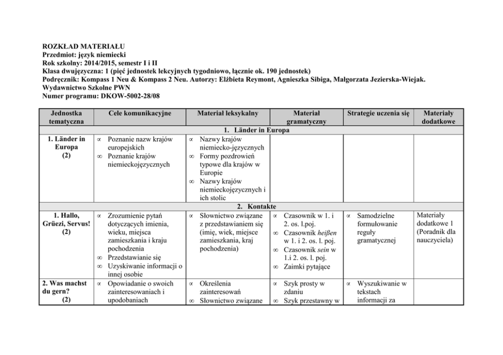 ROZKŁAD MATERIAŁU Przedmiot: język niemiecki Rok szkolny: 2014/2015, semestr I i II Klasa dwujęzyczna: 1 (pięć jednostek lekcyjnych tygodniowo, łącznie ok. 190 jednostek) Podręcznik: Kompass 1 Neu & Kompass 2 Neu. Autorzy: Elżbieta Reymont, Agnieszka Sibiga, Małgorzata Jezierska-Wiejak. Wydawnictwo Szkolne PWN Numer programu: DKOW-5002-28/08 Jednostka tematyczna 1. Länder in Europa (2) Cele komunikacyjne • • Poznanie nazw krajów europejskich Poznanie krajów niemieckojęzycznych Materiał leksykalny • • • 1. Hallo, • Grüezi, Servus! (2) • • 2. Was machst du gern? (2) • Zrozumienie pytań • dotyczących imienia, wieku, miejsca zamieszkania i kraju pochodzenia Przedstawianie się Uzyskiwanie informacji o innej osobie Opowiadanie o swoich • zainteresowaniach i upodobaniach • Materiał gramatyczny 1. Länder in Europa Nazwy krajów niemiecko-języcznych Formy pozdrowień typowe dla krajów w Europie Nazwy krajów niemieckojęzycznych i ich stolic 2. Kontakte Słownictwo związane • Czasownik w 1. i z przedstawianiem się 2. os. l.poj. (imię, wiek, miejsce • Czasownik heißen zamieszkania, kraj w 1. i 2. os. l. poj. pochodzenia) • Czasownik sein w 1.i 2. os. l. poj. • Zaimki pytające Określenia zainteresowań Słownictwo związane • • Strategie uczenia się • Szyk prosty w • zdaniu Szyk przestawny w Samodzielne formułowanie reguły gramatycznej Wyszukiwanie w tekstach informacji za Materiały dodatkowe Materiały dodatkowe 1 (Poradnik dla nauczyciela) • z zainteresowaniami Pytanie innych osób o ich zainteresowania i upodobania • • 3. Er treibt nicht gern Sport (2) 4. Essen Sie gern Hamburger? (2) 5. Wir suchen Freunde. (2) • • • • • • Przedstawianie innych osób Opowiadanie o wyglądzie, cechach charakteru, zainteresowaniach i upodobaniach innych osób Opowiadanie, jakie są i co robią inne osoby Uzyskiwanie informacji od osoby dorosłej (miejsce zamieszkania, wiek, kraj pochodzenia i zainteresowania) Przedstawianie własnej klasy/ grupy ( ilość uczniów, miejsce zamieszkania, kraj pochodzenia, wiek, zainteresowania) Pytanie o miejsce zamieszkania, kraj pochodzenia, wiek i zainteresowania innej • • Przymiotniki określające cechy charakteru Określenia zainteresowań • • • • • Cechy charakteru. • • • • • Liczebniki 1-20 • • zdaniu Pytania z zaimkiem pytające Pytania o rozstrzygnię-cie Zaimek osobowy: • er, sie, es Czasownik w 3. os. l. poj. Czasownik sein w 3. os. l. poj. Przeczenie nicht Bezokolicznik • Czasownik w 3. os. l. mn. Czasownik sein w 3. os. l. mn. Forma grzecznościowa Sie Czasownik w 1. os. l. mn. Czasownik sein w 1. os. l. mn. pomocą internationalizmów Korzystanie z notatki pomocnej w mówieniu (diagram, asocjogram). Wyszukiwanie w tekstach informacji za pomocą internationalizmów. Materiały dodatkowe 2 (Poradnik dla nauczyciela) Interregio (2) • Rozdział powtórzeniowy (2) • • • • Test kontrolny (1) • Sprawdzian ustny (2) Poprawa testu (1) • 1. Wer ist das? (2) • • grupy Poznanie form powitań i pożegnań w różnych regionach Niemiec i krajach niemieckojęzycznych Samodzielne rozwiązanie testu Przygotowanie do sprawdzianu ustnego Sprawdzenie swojej wiedzy i umiejętności Wypełnianie tabeli samooceny. Sprawdzenie umiejętności rozumienia ze słuchu, rozumienia czytania, pisania oraz znajomości słownictwa i struktur gramatycznych Sprawdzenie umiejętności mówienia Wskazanie ludzi i zwierząt Opisywanie wyglądu i charakteru osób i zwierząt • Powitania i pożegnania • Materiał z rozdziału 1. (lekcje 1– 5) • • • 3. Familie Nazwy zwierząt • Określenia osób: kobieta, mężczyzna, dziecko, dziewczyna, chłopiec Materiał z rozdziału 1 Rodzajnik określony i nieokreślony w mianowniku • Samodzielne formułowanie reguł gramatycznych • 2. Das ist meine • Familie (2) • • • • 3.Ich habe keine Geschwister (2) • • 4. Liest du gern • Bücher? (2) • Nazywanie członków • rodziny Określanie • przynależności Liczenie w zakresie 20100 Pytanie o imię, wiek, miejsce zamieszkania, wygląd i hobby członków rodziny innych osób Udzielanie informacji o wybranej osobie ze swojej rodziny Pytanie o rodzeństwo • innych osób (imię, wiek, wygląd zewnętrzny, charakter, upodobania, posiadane zwierzęta) Opowiadanie o swoim rodzeństwie lub kuzynach Opowiadanie o • zainteresowaniach innych osób Opowiadanie o własnych zainteresowaniach Przymiotniki określające cechy zewnętrzne i wewnętrzne osób i zwierząt Nazwy członków rodziny Liczebniki od 20 do 100 Określenia kolorów • • • • • Określenia zainteresowań • Określenie przynależ-ności z przyimkiem von Zaimek dzierżawczy mein, dein Przeczenie kein Czasownik haben i dopełnienie w bierniku Rodzajnik nieokreślony i przeczenie kein w bierniku Odmiana czasowników nieregular-nych, np. essen, sprechen, lesen, • • • Zapoznanie się z zadaniem przed pracą z tekstem Tworzenie notatki pomocnej w mówieniu Tworzenie notatki pomocnej w mówieniu • 5. Meine Familie ist super! (2) • • • Rozdział powtórzeniowy (2) • • • • Test kontrolny (1) • Sprawdzian ustny • Opowiadanie o zainteresowaniach osób z własnej rodziny Wyrażanie opinii na temat innych osób Pytanie o opinię na temat innych osób Opowiadanie o swojej rodzinie (wielkość, imiona, stopień pokrewieństwa, wiek, wygląd, charakter) Samodzielne rozwiązanie testu Przygotowanie do sprawdzianu ustnego Sprawdzenie swojej wiedzy i umiejętności Wypełnianie tabeli samooceny. Sprawdzenie umiejętności rozumienia ze słuchu, rozumienia tekstu czytanego, pisania oraz znajomości słownictwa i struktur gramatycznych Sprawdzenie umiejętności mówienia • Zwroty określające pochwałę, dezaprobatę i neutralność • • • • • Materiał z rozdziału 2 (lekcje 1 – 5) • fahren, schlafen, laufen Zwrot: Ich … gern. Czasownik mögen Dopełnie