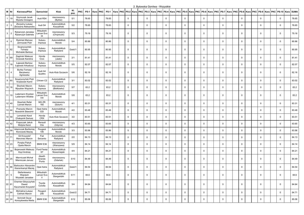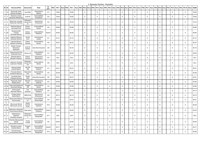 2. Bytowska Gonitwa - Wszystkie M Nr Kierowca/Pilot Samochód Klub Kl. poz. PKC PS-1 Kara PKC PS-1 Kara PKC PS-2 Kara PKC PS-3 Kara PKC PS-4 Kara PKC PS-5 Kara PKC PS-6 Kara PKC PS-7 Kara PKC PS-8 Kara PKC PS-9 Kara PKC PS-10 Kara SUMA 1 19 Szymczak Jacek Myszka Grzegorz Audi RS4 niezrzeszony (Bytów) 5/1 78.65 78.65 0 0 0 0 0 0 0 0 0 78.65 2 3 Zbrzeźny Łukasz Zbrzeźna Aleksandra Audi S4 Automobilklub Koszaliński 5/2 78.65 78.65 0 0 0 0 0 0 0 0 0 78.65 niezrzeszony (Chojniczki) 5/3 79.16 79.16 0 0 0 0 0 0 0 0 0 79.16 3 2 Rybarczyk Jarosław Rybarczyk Gabriela Mitsubishi Lancer Evo IX 4 6 Rybiński Mariusz Jamroziak Piotr Subaru Impreza Automobilklub Morski 5/4 80.86 80.86 0 0 0 0 0 0 0 0 0 80.86 5 82 Szupryczyński Tomasz Michalski Bartosz Subaru Impreza Automobilklub Rallyland Gość/1 80.95 80.95 0 0 0 0 0 0 0 0 0 80.95 6 69 Zagórski Mateusz Grzesiak Karolina Honda Civic niezrzeszony (Jasło) 2/1 81.41 81.41 0 0 0 0 0 0 0 0 0 81.41 7 18 Łajewski Bartosz Łajewski Arkadiusz Subaru Impreza Automobilklub Morski 5/5 82.07 82.07 0 0 0 0 0 0 0 0 0 82.07 8 4 Buńka Tomasz Baryłowicz Agnieszka Audi A4 Quattro Auto Klub Szczecin 5/6 82.16 82.16 0 0 0 0 0 0 0 0 0 82.16 9 60 Szupryczyński Piotr Krażewski Kamil Citroen C2 Automobilklub Rallyland 3/1 83.02 83.02 0 0 0 0 0 0 0 0 0 83.02 10 16 Śliwiński Marcin Myszkier Wojciech Subaru Impreza niezrzeszony (Bielkówko) 5/7 83.2 83.2 0 0 0 0 0 0 0 0 0 83.2 11 10 Lademann Krystian Lademann Wioleta Mitsubishi Lancer Evo VIII Automobilklub Morski 5/8 83.2 83.2 0 0 0 0 0 0 0 0 0 83.2 12 40 Stasiński Rafał Lizinski Marcin MG ZR 160 niezrzeszony (Sztum) 4/1 83.31 83.31 0 0 0 0 0 0 0 0 0 83.31 13 44 Pranszke Marcin Nowotnik Sławomir Opel Astra GSI Automobilklub Morski 4/2 83.48 83.48 0 0 0 0 0 0 0 0 0 83.48 14 59 Lemański Karol Chałupnik Dariusz Honda CRX Auto Klub Szczecin 3/2 83.51 83.51 0 0 0 0 0 0 0 0 0 83.51 15 42 Frąszczak Jakub Motyka Karol Renault Clio niezrzeszony (Gdynia) 4/3 83.65 83.65 0 0 0 0 0 0 0 0 0 83.65 16 58 Adamczak Bartłomiej Klonowski Maciej Peugeot 106 Automobilklub Morski 3/3 83.96 83.96 0 0 0 0 0 0 0 0 0 83.96 17 71 Gil Krzysztof Marciniec Marcin Fiat Seicento Automobilklub Rallyland 2/2 84.13 84.13 0 0 0 0 0 0 0 0 0 84.13 18 23 Poręba Patryk Opala Marcin BMW E36 niezrzeszony (Warszawa) 5/9 84.14 84.14 0 0 0 0 0 0 0 0 0 84.14 19 39 Bojanowski Mateusz Ksyt Andrzej Ford Fiesta ST Automobilklub Nowomiejski 4/4 84.21 84.21 0 0 0 0 0 0 0 0 0 84.21 20 25 Mierniczak Michał Mierniczak Janusz Abarth Grande Punto niezrzeszony (Gdańsk) 5/10 84.49 84.49 0 0 0 0 0 0 0 0 0 84.49 N 86 Barboukov Alexandre Kieremkampt Maciej Opel Astra Automobilklub Rallyland Gość/1 84.54 84.54 0 0 0 0 0 0 0 0 0 84.54 Stefankiewicz Wojciech Wszelaki Jarosław Mitsubishi Lancer Evo V Automobilklub Stargardzki 5/11 84.6 84.6 0 0 0 0 0 0 0 0 0 84.6 22 61 Chamier-Gliszczyński Dawid Kaczmarek Krzysztof Toyota Corolla Automobilklub Koszaliński 3/4 84.64 84.64 0 0 0 0 0 0 0 0 0 84.64 23 84 Michalina Łukasz Celiński Marcin Peugeot 206 Automobilklub Koszaliński Gość/2 84.71 84.71 0 0 0 0 0 0 0 0 0 84.71 24 24 Schmidt Oscar Korszyłowska Marta BMW E36 Automobilklub Stargardzki 5/12 85.06 85.06 0 0 0 0 0 0 0 0 0 85.06 21 5 25 74 Krysiak Paweł Kubacki Paweł Honda Civic niezrzeszony (Szczecin) 2/3 85.16 85.16 0 0 0 0 0 0 0 0 0 85.16 26 15 Jurkun Tomasz Olszewski Oskar Subaru Impreza Automobilklub Warmiński 5/13 85.17 85.17 0 0 0 0 0 0 0 0 0 85.17 27 38 Konior Krzysztof Sagun Michał Peugeot 206 Automobilklub Koszaliński 4/5 85.17 85.17 0 0 0 0 0 0 0 0 0 85.17 28 32 Bartela Robert Zakrzewski Piotr VW Golf Automobilklub Morski 4/6 85.29 85.29 0 0 0 0 0 0 0 0 0 85.29 29 83 Lisowski Radosław Czekan Błażej Ford Fiesta R2 Automobilklub Koszaliński Gość/3 85.32 85.32 0 0 0 0 0 0 0 0 0 85.32 30 20 Kozłowicz Michał Pawłowski Grzegorz Audi RS4 niezrzeszony (Bytów) 5/14 85.47 85.47 0 0 0 0 0 0 0 0 0 85.47 31 62 Cirocki Robert Kamzelski Marek Citroen C2 Automobilklub Morski 3/5 85.82 85.82 0 0 0 0 0 0 0 0 0 85.82 32 37 Nawrocki Piotr Jacniacki Michał Opel Astra Automobilklub Morski 4/7 86.38 86.38 0 0 0 0 0 0 0 0 0 86.38 33 33 Frąckowiak Piotr Frąckowiak Daniel MG ZR 160 Automobilklub Koszaliński 4/8 86.4 86.4 0 0 0 0 0 0 0 0 0 86.4 34 56 Baran Jakub Baran Aleksander Citroen Saxo Automobilklub Toruński 3/6 86.5 86.5 0 0 0 0 0 0 0 0 0 86.5 35 85 Stankiewicz Marceli Wąs Mateusz BMW E30 Automobilklub Koszaliński Gość/4 86.65 86.65 0 0 0 0 0 0 0 0 0 86.65 36 36 Sawicki Przemysław Drausal Martyna Ford Fiesta Automobilklub Morski 4/9 87.06 87.06 0 0 0 0 0 0 0 0 0 87.06 37 54 Kopeć Damian Sierechan Maciej BMW 318 Automobilklub Koszaliński 4/10 87.08 87.08 0 0 0 0 0 0 0 0 0 87.08 38 57 Bilski Tomasz Kozicki Tomasz Honda Civic KM Winogrady 3/7 87.14 87.14 0 0 0 0 0 0 0 0 0 87.14 39 35 Kiełbasa Paweł Dębowski Bartosz BMW E30 Automobilklub Stargardzki 4/11 87.16 87.16 0 0 0 0 0 0 0 0 0 87.16 Wojnowski Krzysztof Wojnowski Witold Audi 80 Automobilklub Morski 5/15 87.68 87.68 0 0 0 0 0 0 0 0 0 87.68 41 26 Domka Marcin Księżak Wojciech BMW E30 niezrzeszony (Świdwin) 5/16 87.87 87.87 0 0 0 0 0 0 0 0 0 87.87 42 75 Żywicki Paweł Ryś Adrian Fiat Seicento niezrzeszony (Studzienice) 1/1 87.91 87.91 0 0 0 0 0 0 0 0 0 87.91 43 21 Lak Karol Kowalczyk Kuba BMW E36 328i niezrzeszony (Wejherowo) 5/17 88.15 88.15 0 0 0 0 0 0 0 0 0 88.15 44 65 Wojtas Jacek Szczepańska Monika Honda Civic SOS PZMOT 3/8 88.21 88.21 0 0 0 0 0 0 0 0 0 88.21 45 34 Dobrucki Leszek Brzozowski Tomasz BMW E36 Automobilklub Stargardzki 4/12 89.08 89.08 0 0 0 0 0 0 0 0 0 89.08 46 14 Tobolski Grzegorz Kaczmarczyk Mariusz Subaru Impreza WRX niezrzeszony (Ciechanów) 5/18 89.18 89.18 0 0 0 0 0 0 0 0 0 89.18 47 Brzoskowski Piotr Bieliński Piotr Mitsubishi Lancer Evo IX niezrzeszony (Poznań) 5/19 89.25 89.25 0 0 0 0 0 0 0 0 0 89.25 48 48 Żelechowski Tomasz Falkowski Robert Daewoo Lanos niezrzeszony (Płońsk) 4/13 89.39 89.39 0 0 0 0 0 0 0 0 0 89.39 49 64 Zaroda Kamil Kasprzyk Łukasz M