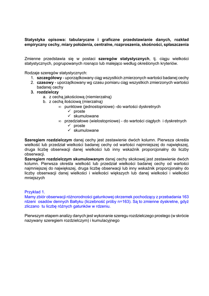 Statystyka opisowa: tabularyczne i graficzne przedstawianie danych, rozkład empiryczny cechy, miary położenia, centralne, rozproszenia, skośności, spłaszczenia Zmienne przedstawia się w postaci szeregów statystycznych, tj. ciągu wielkości statystycznych, pogrupowanych rosnąco lub malejąco według określonych kryteriów. Rodzaje szeregów statystycznych: 1. szczegółowy - uporządkowany ciąg wszystkich zmierzonych wartości badanej cechy 2. czasowy - uporządkowany wg czasu pomiaru ciąg wszystkich zmierzonych wartości badanej cechy 3. rozdzielczy a. z cechą jakościową (niemierzalną) b. z cechą ilościową (mierzalną) • punktowe (jednostopniowe) -do wartości dyskretnych proste skumulowane • przedziałowe (wielostopniowe) - do wartości ciągłych i dyskretnych proste skumulowane Szeregiem rozdzielczym danej cechy jest zestawienie dwóch kolumn. Pierwsza określa wielkość lub przedział wielkości badanej cechy od wartości najmniejszej do największej, druga liczbę obserwacji danej wielkości lub inny wskaźnik proporcjonalny do liczby obserwacji. Szeregiem rozdzielczym skumulowanym danej cechy skokowej jest zestawienie dwóch kolumn. Pierwsza określa wielkość lub przedział wielkości badanej cechy od wartości najmniejszej do największej, druga liczbę obserwacji lub inny wskaźnik proporcjonalny do liczby obserwacji danej wielkości i wielkości większych lub danej wielkości i wielkości mniejszych Przyk»ad 1. Mamy zbiór obserwacji różnorodności gatunkowej okrzemek pochodzący z przebadania 163 rdzeni osadów dennych Bałtyku (liczebność próby n=163). Są to zmienne dyskretne, gdyż zliczano tu liczbę różnych gatunków w rdzeniu. Pierwszym etapem analizy danych jest wykonanie szeregu rozdzielczego prostego (w skrócie nazywany szeregiem rozdzielczym) i kumulacyjnego Liczba gatunków xi Częstość ni 0 1 2 3 4 5 6 7 8 9 10 2 16 33 41 33 16 11 9 1 0 1 Częstość skumul. ni9 2 18 51 92 125 141 152 161 162 162 163 Częstość skumul. ni↑ 163 161 145 112 71 38 22 11 2 1 1 Częstość względna ni/n [%] 1,23 9,82 20,25 25,15 20,25 9,82 6,75 5,52 0,61 0,00 0,61 Częstość skumul. względna ni9/n [%] Częstość skumul. względna ni↑/n [%] 1,23 11,04 31,29 56,44 76,69 86,50 93,25 98,77 99,39 99,39 100,00 100,00 98,77 88,96 68,71 43,56 23,31 13,50 6,75 1,23 0,61 0,61 Przedstawiony powyżej przykład nosi nazwę szeregu rozdzielczego punktowego (jednostopniowego). Podobnie wygląda szereg rozdzielczy z cechą jakościową, tyle że zamiast wartości X podajemy kategorie jakościowe. W przypadku zmiennych ciąg»ych używa się szeregu rozdzielczego przedziałowego (wielostopniowego). Różnica polega na tym, że wartości cechy zostają zastąpione przedziałami wartości. Szereg przedziałowy możemy zastosować także w odniesieniu do cechy skokowej, jeżeli liczba zaobserwowanych wartości jest znaczna. Liczba gatunków xi +0 ; 2) +2 ; 4) +4 ; 6) +6 ; 8) +8 ; 10) +10 ; 12) Częstość 18 74 49 20 1 1 Częstość skumul. 18 92 141 161 162 163 Częstość względna 11,04 45,40 30,06 12,27 0,61 0,61 Częstość skumul. względna 11,04 56,44 86,50 98,77 99,39 100,00 Gęstość ni//∆x Gęstośc względna 9,0 37,0 24,5 10,0 0,5 0,5 5,520 22,700 15,030 6,135 0,305 0,305 Szeregi rozdzielcze dają odpowiedź na pytanie jak często w badanej zbiorowości występują określone wartości – opisują więc strukturę lub inaczej rozkład badanej cechy. Szeregi rozdzielcze przedstawiają rozkłady empiryczne badanych cech w próbie. Przy opracowywaniu szeregu przedziałowego wyłania się ważny problem określenia rozpiętości przedziałów i ich liczby. Ogólnie obowiązującą zasadą jest, że liczba przedziałów powinna być funkcją ilości obserwacji (im więcej obserwacji tym można wyznaczyć więcej przedziałów) Liczba przedziałów może być określona wzorami: r = 1 + 3,32 ⋅ log(n ) r ≤ 5 ⋅ log(n ) r= n gdzie: r - liczba przedzia»ów, n - liczba obserwacji, Przyjąwszy optymalną liczbę przedziałów ich rozpiętość można otrzymać, stosując wzór: x − xmin ∆x = max r gdzie: ∆x - rozpiętość przedziałów, xmin, xmax – minimalna i maksymalna zmierzona wartość cechy. Podane wzory mają charakter tylko wskazówek, a nie ścisłych zaleceń. Z każdego wzoru otrzymujemy różne Aoptymalne@ liczby przedziałów. Przy wyznaczaniu liczby i szerokości przedziałów należy brać pod uwagę następujące kryteria: • Liczba przedziałów nie może być ani zbyt mała, ani zbyt duża. Opracowanie danych zawsze wiąże się z pewną stratą informacji (uogólnieniem), która będzie poważna, jeżeli utworzymy małą liczbę przedziałów o dużej rozpiętości. Natomiast duża liczba wąskich przedziałów prowadzi do tego, że mamy ciągle do czynienia ze zbyt dużą ilością informacji, na podstawie których trudno wyobrazić sobie rozkład wartości. • Liczba obserwacji w poszczególnych przedziałach nie powinna być zbyt ma»»a. Postuluje się aby w większości klas ni$4, wynika z tego, że aby zbudować szereg przedziałowy należy dysponować odpowiednio dużą liczbą obserwacji. Trudno wyznaczać tu jakieś granice, można jednak przyjąć, że poniżej liczebności próby = 15 trudno zajmować się statystyką. • Ze względów praktycznych dobrze jest granice przedziałów określać liczbami Aokrągłymi@@, a takie mogą ze wzorów nie wynikać. Nie będzie zatem niewłaściwe pewne przesunięcie granic, w stosunku do tych, które wynikają z zaproponowanych wyżej wzorów. • Zazwyczaj wymagana jest równa rozpiętość wszystkich przedziałów Wykres słupkowy i krzywa częstości skumulowanej (≤ ) Wykres słupkowy i krzywa częstości 70 140 60 120 50 100 40 30 100 50 80 liczba obserwacji 60 20 40 10 20 względna częstość [%] 160 liczba obserwacji 80 mediana 0 [0;2) [2;4) [4;6) [6;8) zróżnicowanie gatunkowe [8;10) [10;12) 0 0 [0;2) [2;4) [4;6) [6;8) [8;10) [10;12) zróżnicowanie gatunko