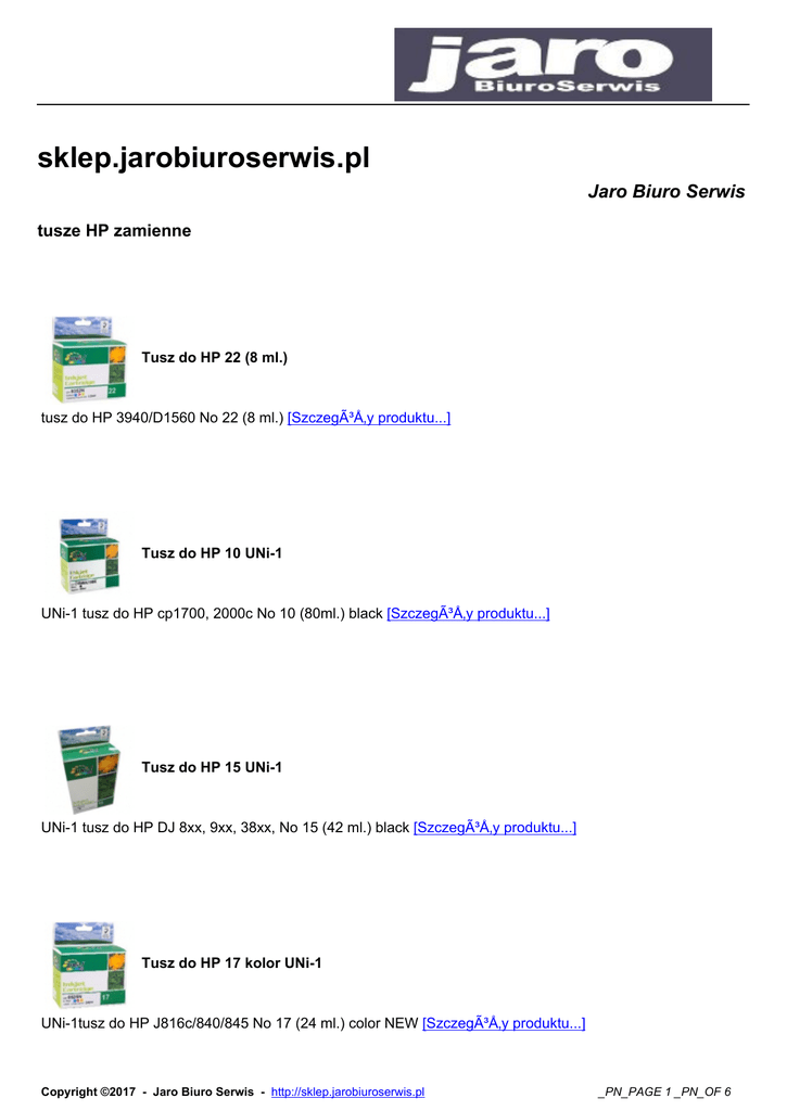 sklep.jarobiuroserwis.pl Jaro Biuro Serwis tusze HP zamienne Tusz do HP 22 (8 ml.) tusz do HP 3940/D1560 No 22 (8 ml.) [Szczegóły produktu...] Tusz do HP 10 UNi-1 UNi-1 tusz do HP cp1700, 2000c No 10 (80ml.) black [Szczegóły produktu...] Tusz do HP 15 UNi-1 UNi-1 tusz do HP DJ 8xx, 9xx, 38xx, No 15 (42 ml.) black [Szczegóły produktu...] Tusz do HP 17 kolor UNi-1 UNi-1tusz do HP J816c/840/845 No 17 (24 ml.) color NEW [Szczegóły produktu...] Copyright ©2017 - Jaro Biuro Serwis - http://sklep.jarobiuroserwis.pl _PN_PAGE 1 _PN_OF 6 Tusz do HP 21 UNi-1 UNi-1 tusz do HP 3940/3920/PSC1410] No 21 (9 ml.) black [Szczegóły produktu...] Tusz do HP 28 kolor UNi-1 tusz do HP DJ 3320/3325 No 28 (13 ml.) color [Szczegóły produktu...] Tusz do HP C8765EE (338) UNi-1 Tusz do HP DJ 6540 No 338 (13ml.) black NEW [Szczegóły produktu...] Tusz do HP C8766EE (343) kolor UNi-1 tusz do HP DJ 6540 No 343 (7 ml.) color NEW C8766N [Szczegóły produktu...] Copyright ©2017 - Jaro Biuro Serwis - http://sklep.jarobiuroserwis.pl _PN_PAGE 2 _PN_OF 6 Tusz do HP C8767EE (339) UNi-1 tusz do HP DJ 5740/6540 No 339 (23ml.) black NEW [Szczegóły produktu...] Tusz do HP C9361 (342) kolor UNi-1 tusz do HP DJ5440/PS2575 No 342 (10 ml.) color [Szczegóły produktu...] Tusz do HP C9362 (336) UNi-1 tusz do HP DJ5440/PS2575 No 336 (7 ml.) black [Szczegóły produktu...] Tusz do HP C9363EE (344) kolor UNi-1 tusz do HP DJ 5740 No 344 (12 ml.) color NEW [Szczegóły produktu...] Tusz do HP C9364EE (337) UNi-1 tusz do HP PS8150/5940 No 337 (14 ml.) black NEW [Szczegóły produktu...] Copyright ©2017 - Jaro Biuro Serwis - http://sklep.jarobiuroserwis.pl _PN_PAGE 3 _PN_OF 6 Tusz do HP CB336EE (350) UNi-1 gÅ‚owica do HP J5780 350XL (25 ml.) Vivera black [Szczegóły produktu...] Tusz do HP DJ 710C No 23 UNi-1 tusz do HP DJ 710C No 23 C1823D (30 ml.) color NEW [Szczegóły produktu...] Tusz do HP nr 25 kolor UNi-1 HP No 25 (51625A) color NEW [Szczegóły produktu...] Tusz do HP nr 26 UNi-1 tusz do HP DJ 200/400 No 26 (40 ml.) black NEW [Szczegóły produktu...] Tusz do HP nr 27 UNi-1 tusz do HP DJ 3320/3325 No 27 (10 ml.) black NEW [Szczegóły produktu...] Copyright ©2017 - Jaro Biuro Serwis - http://sklep.jarobiuroserwis.pl _PN_PAGE 4 _PN_OF 6 Copyright ©2017 - Jaro Biuro Serwis - http://sklep.jarobiuroserwis.pl _PN_PAGE 5 _PN_OF 6 Tusz do HP nr 29 UNi-1 tusz do HP 660/500/635 No 29 (40 ml.) black NEW [Szczegóły produktu...] • • • • • «« Start « Poprzednia 1 NastÄ™pna » Koniec »» Wyniki 1 - 19 z 19 Copyright ©2017 - Jaro Biuro Serwis - http://sklep.jarobiuroserwis.pl _PN_PAGE 6 _PN_OF 6