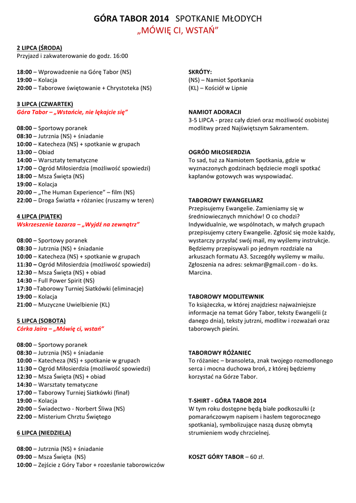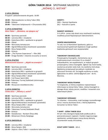 GÓRA TABOR 2014 SPOTKANIE MŁODYCH „MÓWIĘ CI, WSTAŃ” 2 LIPCA (ŚRODA) Przyjazd i zakwaterowanie do godz. 16:00 18:00 – Wprowadzenie na Górę Tabor (NS) 19:00 – Kolacja 20:00 – Taborowe świętowanie + Chrystoteka (NS) 3 LIPCA (CZWARTEK) Góra Tabor – „Wstańcie, nie lękajcie się” 08:00 – Sportowy poranek 08:30 – Jutrznia (NS) + śniadanie 10:00 – Katecheza (NS) + spotkanie w grupach 13:00 – Obiad 14:00 – Warsztaty tematyczne 17:00 – Ogród Miłosierdzia (możliwość spowiedzi) 18:00 – Msza Święta (NS) 19:00 – Kolacja 20:00 – „The Human Experience” – film (NS) 22:00 – Droga Światła + różaniec (ruszamy w teren) 4 LIPCA (PIĄTEK) Wskrzeszenie Łazarza – „Wyjdź na zewnątrz” 08:00 – Sportowy poranek 08:30 – Jutrznia (NS) + śniadanie 10:00 – Katecheza (NS) + spotkanie w grupach 11:30 – Ogród Miłosierdzia (możliwość spowiedzi) 12:30 – Msza Święta (NS) + obiad 14:30 – Full Power Spirit (NS) 17:30 –Taborowy Turniej Siatkówki (eliminacje) 19:00 – Kolacja 21:00 – Muzyczne Uwielbienie (KL) 5 LIPCA (SOBOTA) Córka Jaira – „Mówię ci, wstań” 08:00 – Sportowy poranek 08:30 – Jutrznia (NS) + śniadanie 10:00 – Katecheza (NS) + spotkanie w grupach 11:30 – Ogród Miłosierdzia (możliwość spowiedzi) 12:30 – Msza Święta (NS) + obiad 14:30 – Warsztaty tematyczne 17:00 – Taborowy Turniej Siatkówki (finał) 19:00 – Kolacja 20:00 – Świadectwo -‐ Norbert Śliwa (NS) 22:00 – Misterium Chrztu Świętego 6 LIPCA (NIEDZIELA) 08:00 – Jutrznia (NS) + śniadanie 09:00 – Msza Święta (NS) 10:00 – Zejście z Góry Tabor + rozesłanie taborowiczów SKRÓTY: (NS) – Namiot Spotkania (KL) – Kościół w Lipnie NAMIOT ADORACJI 3-‐5 LIPCA -‐ przez cały dzień oraz możliwość osobistej modlitwy przed Najświętszym Sakramentem. OGRÓD MIŁOSIERDZIA To sad, tuż za Namiotem Spotkania, gdzie w wyznaczonych godzinach będziecie mogli spotkać kapłanów gotowych was wyspowiadać. TABOROWY EWANGELIARZ Przepisujemy Ewangelie. Zamieniamy się w średniowiecznych mnichów! O co chodzi? Indywidualnie, we wspólnotach, w małych grupach przepisujemy cztery Ewangelie. Zgłosić się może każdy, wystarczy przysłać swój mail, my wyślemy instrukcje. Będziemy przepisywali po jednym rozdziale na arkuszach formatu A3. Szczegóły wyślemy w mailu. Zgłoszenia na adres: [email protected] -‐ do ks. Marcina. TABOROWY MODLITEWNIK To książeczka, w której znajdziesz najważniejsze informacje na temat Góry Tabor, teksty Ewangelii (z danego dnia), teksty jutrzni, modlitw i rozważań oraz taborowych pieśni. TABOROWY RÓŻANIEC To różaniec – bransoleta, znak twojego rozmodlonego serca i mocna duchowa broń, z której będziemy korzystać na Górze Tabor. T-‐SHIRT -‐ GÓRA TABOR 2014 W tym roku dostępne będą białe podkoszulki (z pomarańczowym napisem i hasłem tegorocznego spotkania), symbolizujące naszą duszę obmytą strumieniem wody chrzcielnej. KOSZT GÓRY TABOR – 60 zł.