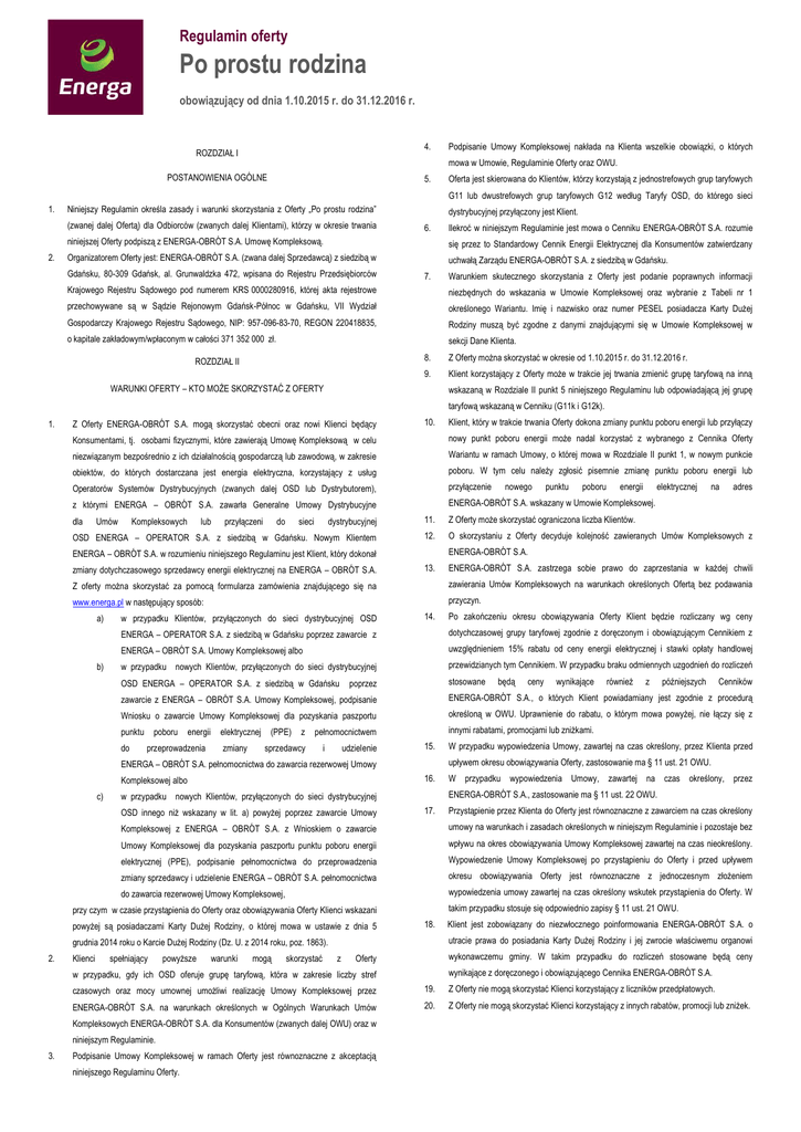 Regulamin oferty Po prostu rodzina obowiązujący od dnia 1.10.2015 r. do 31.12.2016 r. 4. ROZDZIAŁ I Podpisanie Umowy Kompleksowej nakłada na Klienta wszelkie obowiązki, o których mowa w Umowie, Regulaminie Oferty oraz OWU. POSTANOWIENIA OGÓLNE 5. Oferta jest skierowana do Klientów, którzy korzystają z jednostrefowych grup taryfowych G11 lub dwustrefowych grup taryfowych G12 według Taryfy OSD, do którego sieci 1. Niniejszy Regulamin określa zasady i warunki skorzystania z Oferty „Po prostu rodzina” (zwanej dalej Ofertą) dla Odbiorców (zwanych dalej Klientami), którzy w okresie trwania 2. dystrybucyjnej przyłączony jest Klient. 6. Ilekroć w niniejszym Regulaminie jest mowa o Cenniku ENERGA-OBRÓT S.A. rozumie niniejszej Oferty podpiszą z ENERGA-OBRÓT S.A. Umowę Kompleksową. się przez to Standardowy Cennik Energii Elektrycznej dla Konsumentów zatwierdzany Organizatorem Oferty jest: ENERGA-OBRÓT S.A. (zwana dalej Sprzedawcą) z siedzibą w uchwałą Zarządu ENERGA-OBRÓT S.A. z siedzibą w Gdańsku. Gdańsku, 80-309 Gdańsk, al. Grunwaldzka 472, wpisana do Rejestru Przedsiębiorców 7. Warunkiem skutecznego skorzystania z Oferty jest podanie poprawnych informacji Krajowego Rejestru Sądowego pod numerem KRS 0000280916, której akta rejestrowe niezbędnych do wskazania w Umowie Kompleksowej oraz wybranie z Tabeli nr 1 przechowywane są w Sądzie Rejonowym Gdańsk-Północ w Gdańsku, VII Wydział określonego Wariantu. Imię i nazwisko oraz numer PESEL posiadacza Karty Dużej Gospodarczy Krajowego Rejestru Sądowego, NIP: 957-096-83-70, REGON 220418835, Rodziny muszą być zgodne z danymi znajdującymi się w Umowie Kompleksowej w o kapitale zakładowym/wpłaconym w całości 371 352 000 zł. sekcji Dane Klienta. ROZDZIAŁ II 8. Z Oferty można skorzystać w okresie od 1.10.2015 r. do 31.12.2016 r. 9. Klient korzystający z Oferty może w trakcie jej trwania zmienić grupę taryfową na inną WARUNKI OFERTY – KTO MOŻE SKORZYSTAĆ Z OFERTY wskazaną w Rozdziale II punkt 5 niniejszego Regulaminu lub odpowiadającą jej grupę taryfową wskazaną w Cenniku (G11k i G12k). 1. Z Oferty ENERGA-OBRÓT S.A. mogą skorzystać obecni oraz nowi Klienci będący 10. nowy punkt poboru energii może nadal korzystać z wybranego z Cennika Oferty niezwiązanym bezpośrednio z ich działalnością gospodarczą lub zawodową, w zakresie Wariantu w ramach Umowy, o której mowa w Rozdziale II punkt 1, w nowym punkcie obiektów, do których dostarczana jest energia elektryczna, korzystający z usług poboru. W tym celu należy zgłosić pisemnie zmianę punktu poboru energii lub Operatorów Systemów Dystrybucyjnych (zwanych dalej OSD lub Dystrybutorem), przyłączenie z którymi ENERGA – OBRÓT S.A. zawarła Generalne Umowy Dystrybucyjne ENERGA-OBRÓT S.A. wskazany w Umowie Kompleksowej. punktu poboru energii elektrycznej na adres dystrybucyjnej 11. Z Oferty może skorzystać ograniczona liczba Klientów. 12. O skorzystaniu z Oferty decyduje kolejność zawieranych Umów Kompleksowych z Umów Kompleksowych lub przyłączeni do sieci ENERGA-OBRÓT S.A. ENERGA – OBRÓT S.A. w rozumieniu niniejszego Regulaminu jest Klient, który dokonał zmiany dotychczasowego sprzedawcy energii elektrycznej na ENERGA – OBRÓT S.A. 13. przyczyn. www.energa.pl w następujący sposób: a) b) w przypadku Klientów, przyłączonych do sieci dystrybucyjnej OSD 14. dotychczasowej grupy taryfowej zgodnie z doręczonym i obowiązującym Cennikiem z ENERGA – OBRÓT S.A. Umowy Kompleksowej albo uwzględnieniem 15% rabatu od ceny energii elektrycznej i stawki opłaty handlowej w przypadku nowych Klientów, przyłączonych do sieci dystrybucyjnej przewidzianych tym Cennikiem. W przypadku braku odmiennych uzgodnień do rozliczeń OSD ENERGA – OPERATOR S.A. z siedzibą w Gdańsku stosowane poprzez będą ceny wynikające również z późniejszych Cenników zawarcie z ENERGA – OBRÓT S.A. Umowy Kompleksowej, podpisanie ENERGA-OBRÓT S.A., o których Klient powiadamiany jest zgodnie z procedurą Wniosku o zawarcie Umowy Kompleksowej dla pozyskania paszportu określoną w OWU. Uprawnienie do rabatu, o którym mowa powyżej, nie łączy się z do poboru energii przeprowadzenia elektrycznej zmiany (PPE) z innymi rabatami, promocjami lub zniżkami. pełnomocnictwem sprzedawcy i udzielenie 15. 16. Kompleksowej albo W przypadku wypowiedzenia Umowy, zawartej na czas określony, przez ENERGA-OBRÓT S.A., zastosowanie ma § 11 ust. 22 OWU. w przypadku nowych Klientów, przyłączonych do sieci dystrybucyjnej OSD innego niż wskazany w lit. a) powyżej poprzez zawarcie Umowy W przypadku wypowiedzenia Umowy, zawartej na czas określony, przez Klienta przed upływem okresu obowiązywania Oferty, zastosowanie ma § 11 ust. 21 OWU. ENERGA – OBRÓT S.A. pełnomocnictwa do zawarcia rezerwowej Umowy 17. Przystąpienie przez Klienta do Oferty jest równoznaczne z zawarciem na czas określony Kompleksowej z ENERGA – OBRÓT S.A. z Wnioskiem o zawarcie umowy na warunkach i zasadach określonych w niniejszym Regulaminie i pozostaje bez Umowy Kompleksowej dla pozyskania paszportu punktu poboru energii wpływu na okres obowiązywania Umowy Kompleksowej zawartej na czas nieokreślony. elektrycznej (PPE), podpisanie pełnomocnictwa do przeprowadzenia Wypowiedzenie Umowy Kompleksowej po przystąpieniu do Oferty i przed upływem zmiany sprzedawcy i udzielenie ENERGA – OBRÓT S.A. pełnomocnictwa okresu obowiązywania Oferty jest równoznaczne z jednoczesnym złożeniem do zawarcia rezerwowej Umowy Kompleksowej, wypowiedzenia umowy zawartej na czas określony wskutek przystąpienia do Oferty. W takim przypadku stosuje się odpowiednio zapisy § 11 ust. 21 OWU. przy czym w czasie przystąpienia do Oferty oraz obowiązywania Oferty Klienci wskazani powyżej są posiadaczami Karty Dużej Rodziny, o której mowa w ustawie z dnia 5 18. spełniający powyższe warunki mogą skorzystać Klient jest zobowiązany do niezwłocznego p