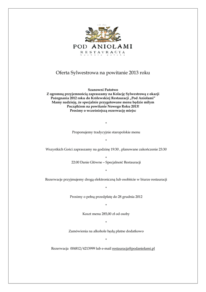Oferta Sylwestrowa na powitanie 2013 roku Szanowni Państwo Z ogromną przyjemnością zapraszamy na Kolację Sylwestrową z okazji Pożegnania 2012 roku do Królewskiej Restauracji „Pod Aniołami” Mamy nadzieję, że specjalnie przygotowane menu będzie miłym Początkiem na powitanie Nowego Roku 2013! Prosimy o wcześniejszą rezerwację miejsc * Proponujemy tradycyjnie staropolskie menu * Wszystkich Gości zapraszamy na godzinę 19:30 , planowane zakończenie 23:30 * 22:00 Danie Główne – Specjalność Restauracji * Rezerwacje przyjmujemy drogą elektroniczną lub osobiście w biurze restauracji * Prosimy o pełną przedpłatę do 28 grudnia 2012 * Koszt menu 285,00 zł od osoby * Zamówienia na alkohole będą płatne dodatkowo * Rezerwacja 004812/4213999 lub e-mail [email protected] Menu na kolację sylwestrową 31 grudnia 2012 roku Restauracja Pod Aniołami Aperitif Champagne Météyer Père & Fils Brut Tradition * Przystawka Przepiórki faszerowane na dwa sposoby - po polsku i z truflami podane z domową żurawiną i marynowanym rydzem * Przystawka na ciepło Nasze słynne pierogi z mięsem, kapustą i grzybami oraz „ruskie” przysmażone na maśle podane z żurawiną i cebulką – przysmak dworów polskich * Zupa Krem z raków podany z chrupiącym sandaczem, prażoną cebulką i grzankami * Danie główne płonące - specjalność restauracji serwowane przez Szefa Kuchni Marynowane w ziołach daniele, pieczone w całości, podane w ogniu z sosem z czerwonej porzeczki, i risotto z pęczaku z borowikami * Deser Nugat z orzechami włoskimi i wędzonymi śliwami z ajerkoniakiem * Ponadto nasz bufet z deserami Trio naszych ciast krakowskich Sernik z bakaliami, mazurek na kruchym cieście, szarlotka * Na pożegnanie dla naszych Gości miły prezent oraz wino musujące na powitanie Nowego Roku 2013 Wina i inne alkohole z naszego menu - płatne dodatkowo. Menu wegetariańskie na kolację sylwestrową 31 grudnia 2012 roku Restauracja Pod Aniołami Aperitif Champagne Météyer Père & Fils Brut Tradition * Przystawka Szlachetny oscypek nie wędzony podany z pomidorami i sosem vineagrette ze świeżymi ziołami * Przystawka na ciepło Nasze słynne pierogi „ruskie” przysmażone na maśle z cebulką * Zupa Krem z raków podany z chrupiącym sandaczem, prażoną cebulką i grzankami lub Wytworna zupa z prawdziwków, maślaków, leśnych kurek i podgrzybków * Danie główne Sandacz na szpinaku z masłem ziołowym podany z risotto z pęczaku z prawdziwkami lub Staropolskie gołąbki z kaszą gryczaną podane z leśnymi kurkami * Deser Nugat z orzechami włoskimi i wędzonymi śliwami z ajerkoniakiem * Ponadto nasz bufet z deserami Trio naszych ciast krakowskich Sernik z bakaliami, mazurek na kruchym cieście, szarlotka * Na pożegnanie dla naszych Gości miły prezent oraz wino musujące na powitanie Nowego Roku 2013 Wina i inne alkohole z naszego menu - płatne dodatkowo.