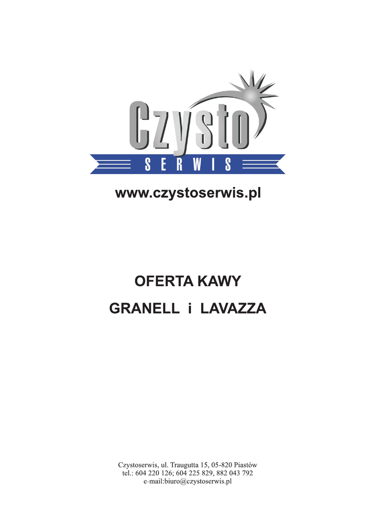 OFERTA KAWY GRANELL Z wielką przyjemnością przedstawiamy Państwu ofertę znakomitych kaw Granell, których aromat i smak został doceniony na całym świecie. Posiada właściwości najlepszych kaw Arabica. Kawa o mocnym aromacie, głębokim zapachu i pełnym smaku. Idealna propozycja dla smakoszy i znawców gatunku To połączenie mieszanki kaw Robusta i Arabica, które przyczyniają się do powstania przyjemnego smaku i aromatu Ta kawa to najczystsze i najdelikatniejsze ziarna kawy Robusta. Specjalnie produkowana dla miłośników mocnej kawy z niską kwasowością KAWA LAVAZZA To połączenie mieszanki kaw Robusta i Arabica,o intensywnym, długo wyczuwalnym smaku. Przeznaczona dla miłośników intensywnego espresso Rodzaj kawy Opakowanie Cena netto VAT Cena brutto Granell Gran Selection 3kg 291zł, netto 23% 357,93zł Granell Gran Lux 1kg 81zł, netto 23% 99,63zł Granell Cafeterias 1kg 70zł, netto 23% 86,10zł Granell Bares 1kg 65zł, netto 23% 79,95zł Granell Gran Lux mielona 250g 29zł, netto 23% 35,67zł Granell mielona bezkofeinowa 250g 29zł, netto 23% 35,67zł Decaffeinado Bezkofeinowa 2kg 194zł, netto 23% 238,62 Lavazza Crema Aroma 1 kg 55zł, netto 23% 67,65zł Lavazza Grand Espresso 1kg 65 zł netto 23% 79,95 zł Filtr BWT do Jury Płyn do czyszczenia układów mlecznych 1l 40 zł netto Płyn do odkamieniania 1l 27 zł netto Proszek do czyszczenia osadów kawowych, grup, oraz termosów 0,5kg 30 zł netto Proszek do odkamieniania 0,5kg 23 zł netto Tabletki do czyszczenia ekspresu op. 60szt.. po 2,5g 42 zł netto WHITE bestcup T 38 zł netto BLUE bestcup 38 zł netto Franke flair 160 zł netto