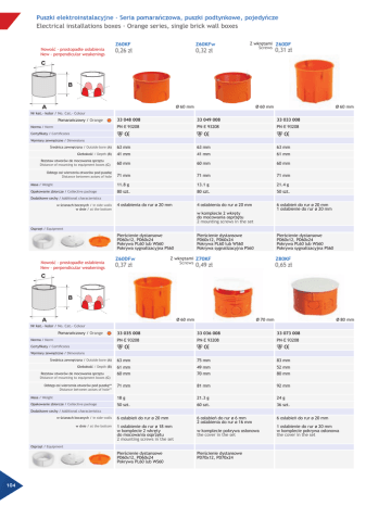 Puszki elektroinstalacyjne · Seria pomarańczowa, puszki podtynkowe, pojedyńcze Electrical installations boxes · Orange series, single brick wall boxes Nowość - prostopadłe osłabienia New - perpendicular weakenings Z60KF Z60KFw 0,26 zł 0,32 zł Z wkrętami Z60DF Screws ø 60 mm 0,31 zł ø 60 mm ø 60 mm Nr kat.- kolor / No. Cat.- Colour 33 048 008 33 049 008 33 033 008 PN–E 93208 PN–E 93208 PN–E 93208 Średnica zewnętrzna / Outside bore (A) 63 mm 63 mm 63 mm Głebokość / Depth (B) 41 mm 41 mm 61 mm 60 mm 60 mm 60 mm 71 mm 71 mm 71 mm Masa / Weight 11.8 g 13.1 g 21.4 g Opakowanie zbiorcze / Collective package 80 szt. 80 szt. 50 szt. 4 osłabienia do rur ø 20 mm 4 osłabienia do rur ø 20 mm 6 osłabień do rur ø 20 mm 1 osłabienie do rur ø 20 mm Pomarańczowy / Orange Norma / Norm Certyfikaty / Certificates Wymiary zewnętrzne / Dimensions Rozstaw otworów do mocowania sprzętu Distance of mounting to equipment boxes (C) Odstęp osi wiercenia otworów pod puszkę Distance between axises of hole Dodatkowe cechy / Additional characteristics w ścianach bocznych / in side walls w dnie / at the bottom w komplecie 2 wkręty do mocowania osprzętu 2 mounting screws in the set Osprzęt / Equipment Pierścienie dystansowe PD60x12, PD60x24 Pokrywa PL60 lub WS60 Pokrywa sygnalizacyjna PS60 Nowość - prostopadłe osłabienia New - perpendicular weakenings Z60DFw 0,37 zł Pierścienie dystansowe PD60x12, PD60x24 Pokrywa PL60 lub WS60 Pokrywa sygnalizacyjna PS60 Pierścienie dystansowe PD60x12, PD60x24 Pokrywa PL60 lub WS60 Pokrywa sygnalizacyjna PS60 Z wkrętami Z70KF Screws Z80KF 0,49 zł ø 60 mm 0,65 zł ø 70 mm ø 80 mm Nr kat.- kolor / No. Cat.- Colour 33 035 008 33 036 008 33 073 008 PN–E 93208 PN–E 93208 PN–E 93208 Średnica zewnętrzna / Outside bore (A) 63 mm 75 mm 83 mm Głebokość / Depth (B) 61 mm 49 mm 52 mm 60 mm 70 mm 80 mm 71 mm 81 mm 92 mm Masa / Weight 18 g 21.3 g 24 g Opakowanie zbiorcze / Collective package 50 szt. 60 szt. 36 szt. 6 osłabień do rur ø 20 mm 6 osłabień do rur ø 6 mm 2 osłabienia do rur ø 16 mm 6 osłabień do rur ø 20 mm Pomarańczowy / Orange Norma / Norm Certyfikaty / Certificates Wymiary zewnętrzne / Dimensions Rozstaw otworów do mocowania sprzętu Distance of mounting to equipment boxes (C) Odstęp osi wiercenia otworów pod puszkę** Distance between axises of hole** Dodatkowe cechy / Additional characteristics w ścianach bocznych / in side walls w dnie / at the bottom 1 osłabienie do rur ø 18 mm w komplecie 2 wkręty do mocowania osprzętu 2 mounting screws in the set w komplecie pokrywa osłonowa the cover in the set Osprzęt / Equipment Pierścienie dystansowe PD60x12, PD60x24 Pokrywa PL60 lub WS60 104 Pierścienie dystansowe PD70x12, PD70x24 1 osłabienie do rur ø 20 mm w komplecie pokrywa osłonowa the cover in the set Puszki elektroinstalacyjne · Seria pomarańczowa, puszki podtynkowe, pojedyńcze Electrical installations boxes · Orange series, single brick wall boxes S60KF Nowość - prostopadłe osłabienia New - perpendicular weakenings Szeregowa S60KFw Serial 0,45 zł 0,39 zł 6.2 Szeregowa S60DF z wkrętami Serial with screws 0,44 zł Szeregowa Serial ø 60 mm ø 60 mm ø 60 mm Nr kat.- kolor / No. Cat.- Colour Pomarańczowy / Orange Norma / Norm 33 054 008 33 068 008 33 057 008 PN–E 93208 PN–E 93208 PN–E 93208 Certyfikaty / Certificates Wymiary zewnętrzne / Dimensions Średnica zewnętrzna / Outside bore (A) 65 mm 65 mm 65 mm Głebokość / Depth (B) 41 mm 41 mm 61 mm 60 mm 60 mm 60 mm 71 mm 71 mm 71 mm Rozstaw otworów do mocowania sprzętu Distance of mounting to equipment boxes (C) Odstęp osi wiercenia otworów pod puszkę Distance between axises of hole Masa / Weight 17.7 g 19 g 21 g Opakowanie zbiorcze / Collective package 100 szt. 100 szt. 110 szt. 8 osłabień do rur ø 20 mm 8 osłabień do rur ø 20 mm 14 osłabień do rur ø 20 mm Dodatkowe cechy / Additional characteristics w ścianach bocznych / in side walls w komplecie 2 wkręty do mocowania osprzętu 2 mounting screws in the set Osprzęt / Equipment Króciec dystansowy KD12 KD12 extending element. Pierścienie dystansowe PD60x12, PD60x24, Pokrywa PL60, Pokrywa sygnalizacyjna PS60 Nowość - prostopadłe osłabienia New - perpendicular weakenings S60DFw 0,50 zł Króciec dystansowy KD12 KD12 extending element. Pierścienie dystansowe PD60x12, PD60x24, Pokrywa PL60, Pokrywa sygnalizacyjna PS60 Szeregowa z wkrętami S60DFX Serial with screws 0,44 zł Króciec dystansowy KD12 KD12 extending element. Pierścienie dystansowe PD60x12, PD60x24, Pokrywa PL60, Pokrywa sygnalizacyjna PS60 Szeregowa S60DFXw Serial 0,50 zł Prostokątne osłabienia Szeregowa z wkrętami Serial with screws Prostokątne osłabienia ø 60 mm ø 60 mm ø 60 mm Nr kat.- kolor / No. Cat.- Colour Pomarańczowy / Orange Norma / Norm 33 069 008 33 057 018 33 069 018 PN–E 93208 PN–E 93208 PN–E 93208 klasa V0 Certyfikaty / Certificates klasa V0 Wymiary zewnętrzne / Dimensions Średnica zewnętrzna / Outside bore (A) 65 mm 65 mm 65 mm Głebokość / Depth (B) 61 mm 61 mm 61 mm Rozstaw otworów do mocowania sprzętu * Distance of mounting to equipment boxes * (C) 60 mm 60 mm 60 mm Odstęp osi wiercenia otworów pod puszkę** Distance between axises of hole** 71 mm 71 mm 71 mm Masa / Weight 22.3 g 19 g 21 g Opakowanie zbiorcze / Collective package 110 szt. 110 szt. 110 szt. 14 osłabień do rur ø 20 mm 8 osłabień do rur ø 20 mm 14 osłabień do rur ø 20 mm w komplecie 2 wkręty do mocowania osprzętu 2 mounting screws in the set w komplecie 2 wkręty do mocowania osprzętu 2 mounting screws in the set Pokrywa sygnalizacyjna PS60 Signal cover PS60 Pokrywa osłonowa WS60, PL60 Spring cover WS60, PL60 Króciec dystansowy KD12 KD12 extending element. Pierścienie dystansowe PD60x12, PD60x24 Distance pieces PD60x12, PD60x24 Króciec dystansowy KD12 KD12 extending element. Pierścienie dystansowe PD60x12, PD60x24 Distance pieces PD60x12, PD60x24 Pokrywa osłonowa WS6