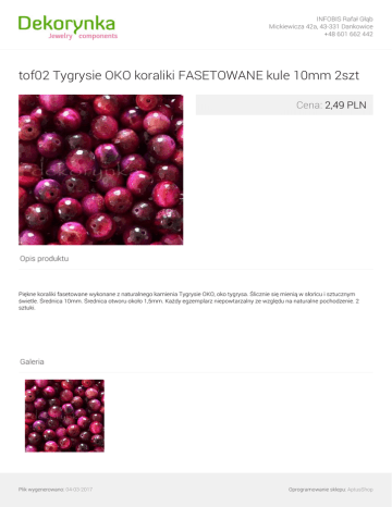 INFOBIS Rafał Głąb Mickiewicza 42a, 43-331 Dankowice +48 601 662 442 tof02 Tygrysie OKO koraliki FASETOWANE kule 10mm 2szt Cena: 2,49 PLN Opis produktu Piękne koraliki fasetowane wykonane z naturalnego kamienia Tygrysie OKO, oko tygrysa. Ślicznie się mienią w słońcu i sztucznym świetle. Średnica 10mm. Średnica otworu około 1,5mm. Każdy egzemplarz niepowtarzalny ze względu na naturalne pochodzenie. 2 sztuki. Galeria Plik wygenerowano: 04-03-2017 Oprogramowanie sklepu: AptusShop INFOBIS Rafał Głąb Mickiewicza 42a, 43-331 Dankowice +48 601 662 442 Plik wygenerowano: 04-03-2017 Powered by TCPDF (www.tcpdf.org) Oprogramowanie sklepu: AptusShop